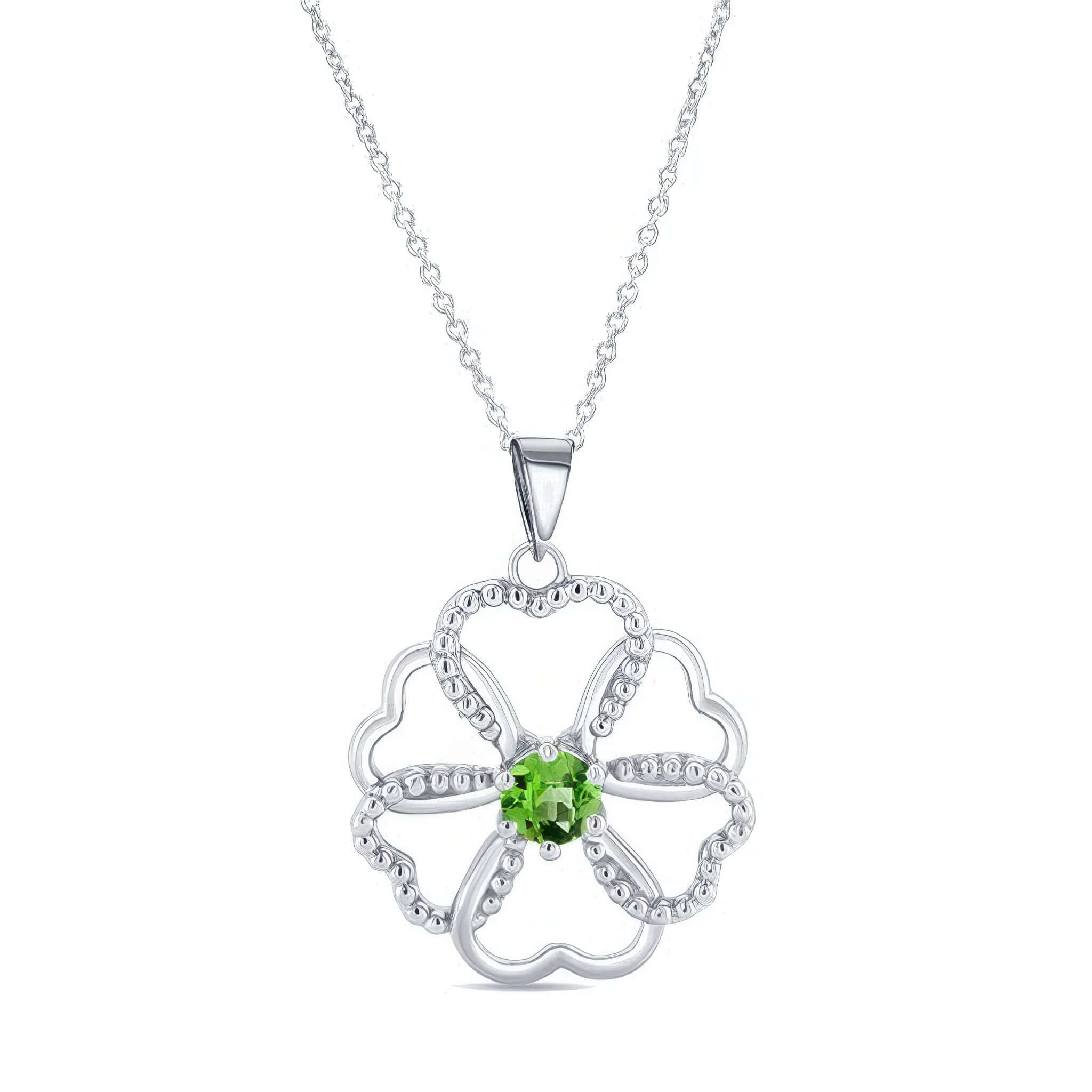 A beautiful peridot silver intertwined hearts necklace featuring intertwined heart shapes and a half carat peridot center.