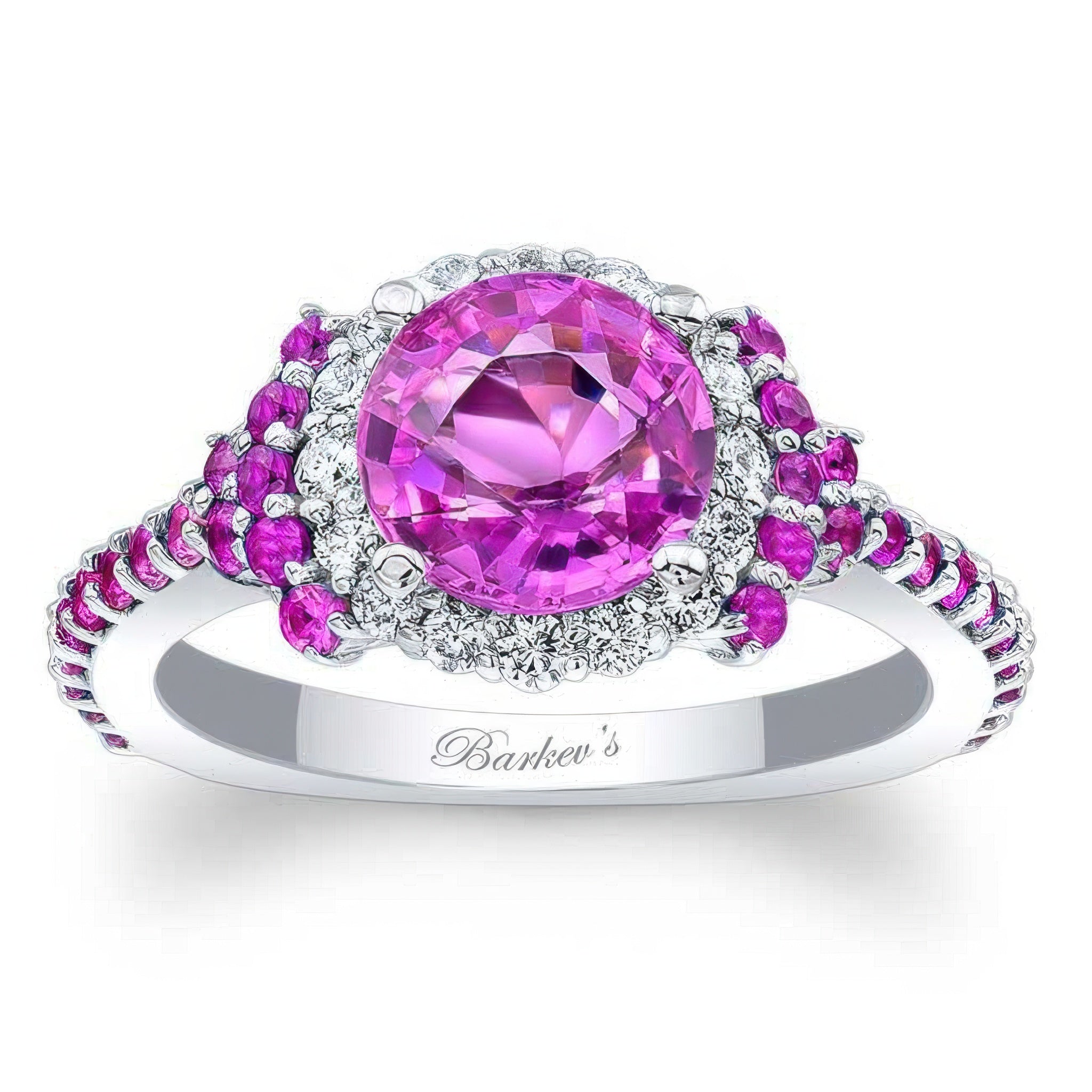 This pink sapphire cluster ring features a prong set round pink sapphire center with a diamond halo and shared prong set pink sapphires flowing down the shank.