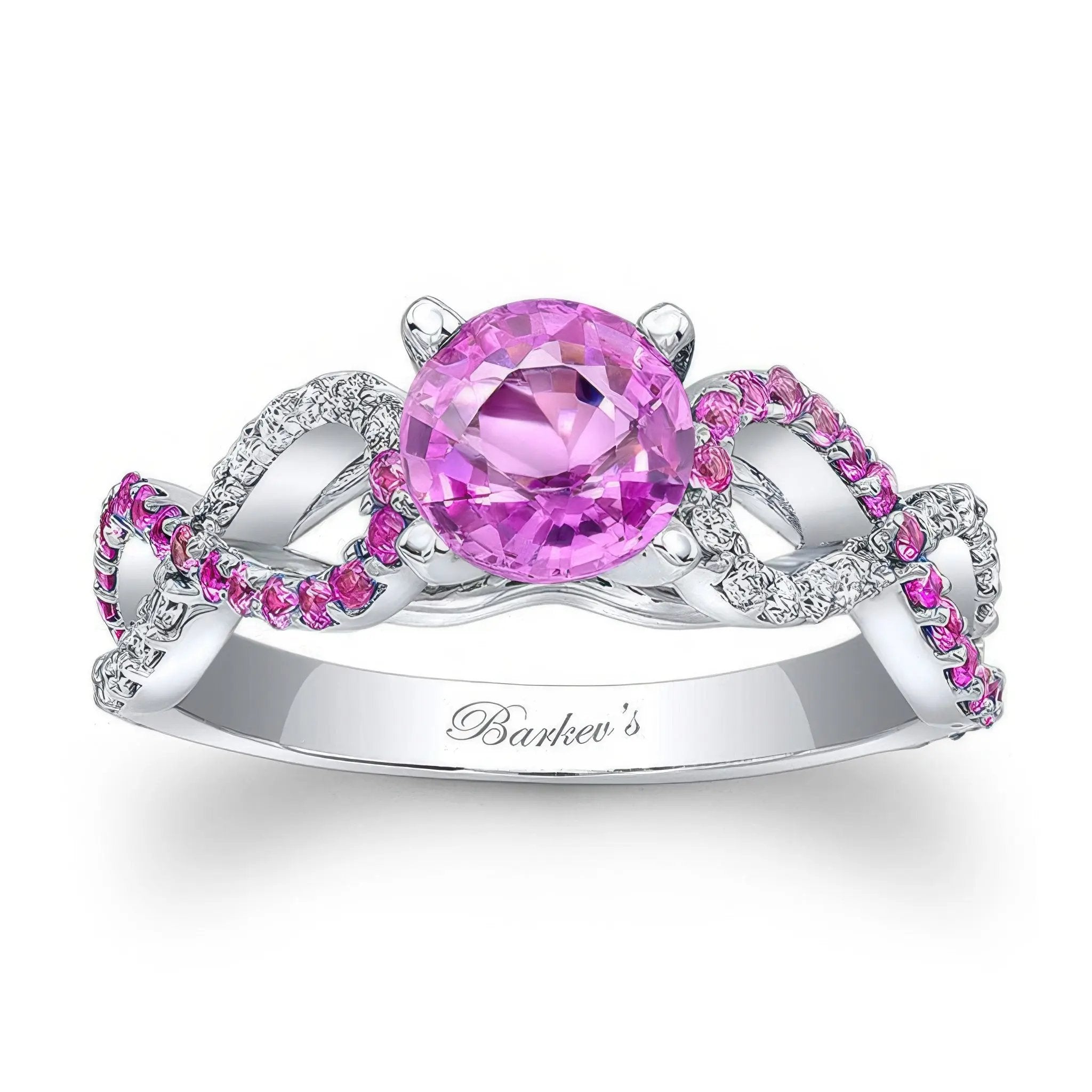 This pink sapphire infinity ring features a prong set round center with an artfully curving cathedral shank that crisscrosses down the shoulders adorned with shared prong set diamonds and pink sapphires for a glamorous look sure to be treasured.