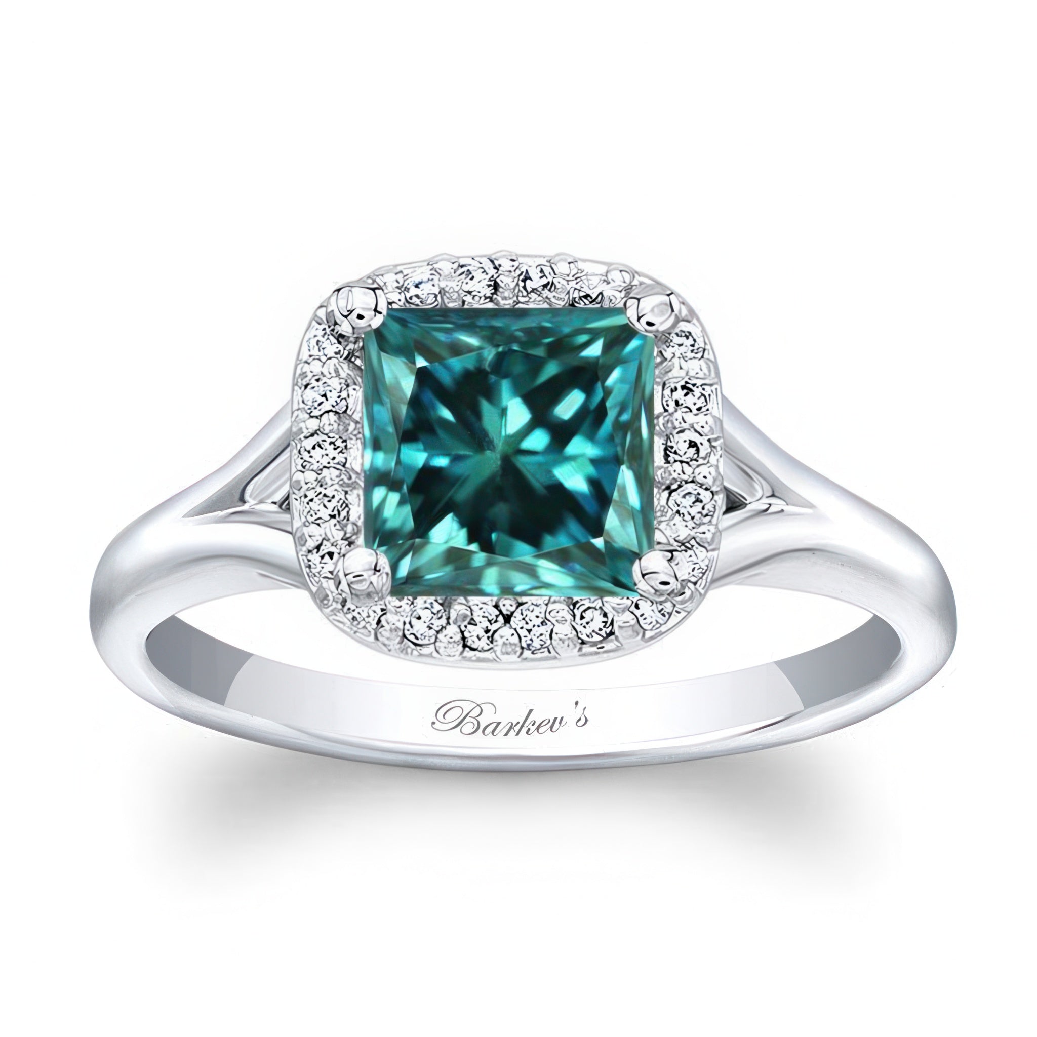This princess cut blue and white diamond halo ring will capture the eye of many admirers. Shared prong set diamonds encircle the center with a bright polished dainty split shank for a look of sheer elegance.