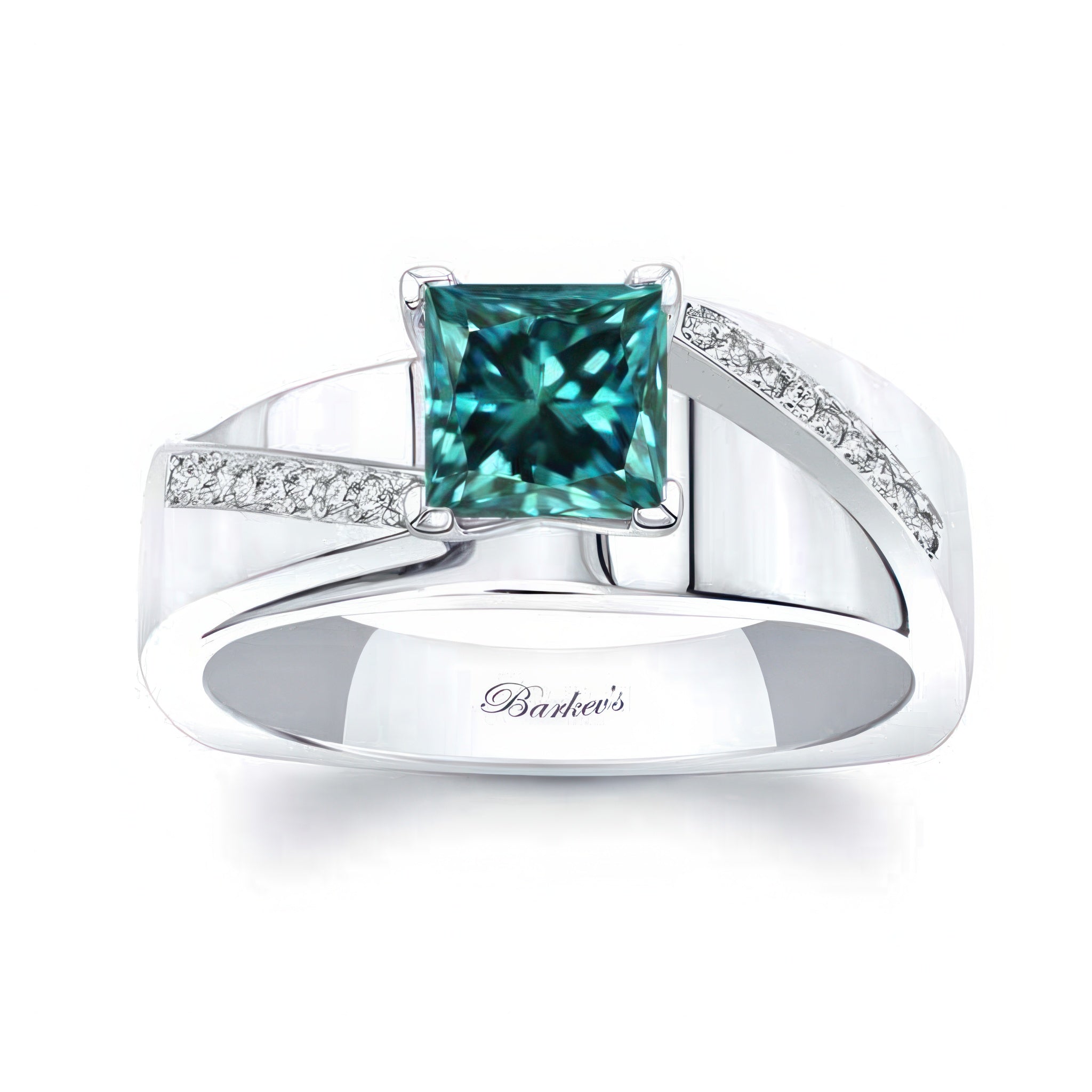 This princess cut blue diamond pave engagement ring is beautifully built to feature the center. The sides are tastefully set with diamond melees that add a hint of sparkle.
