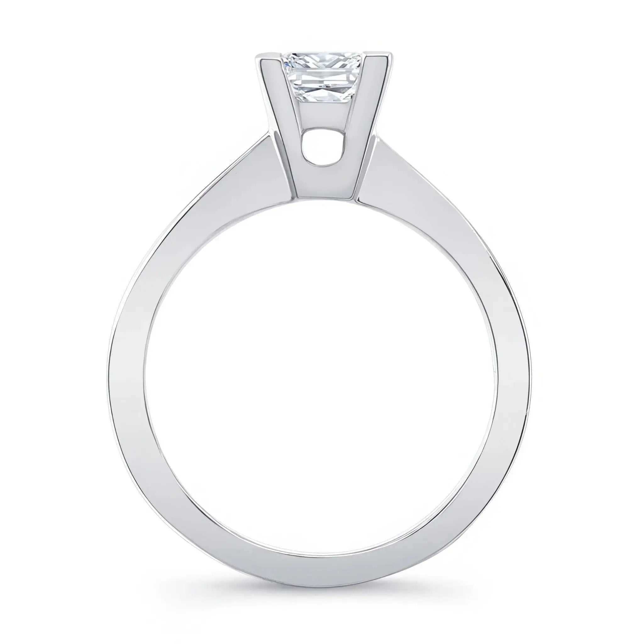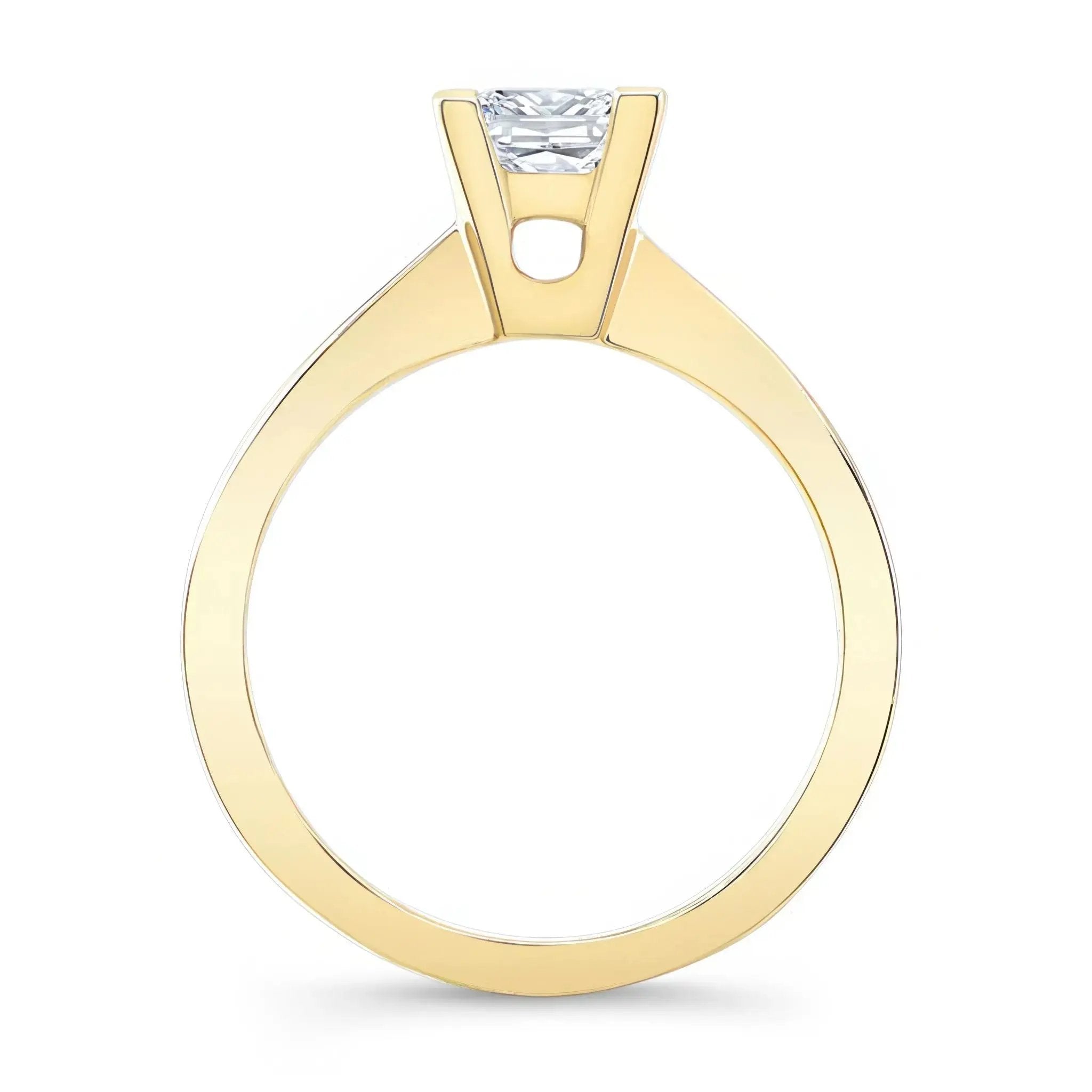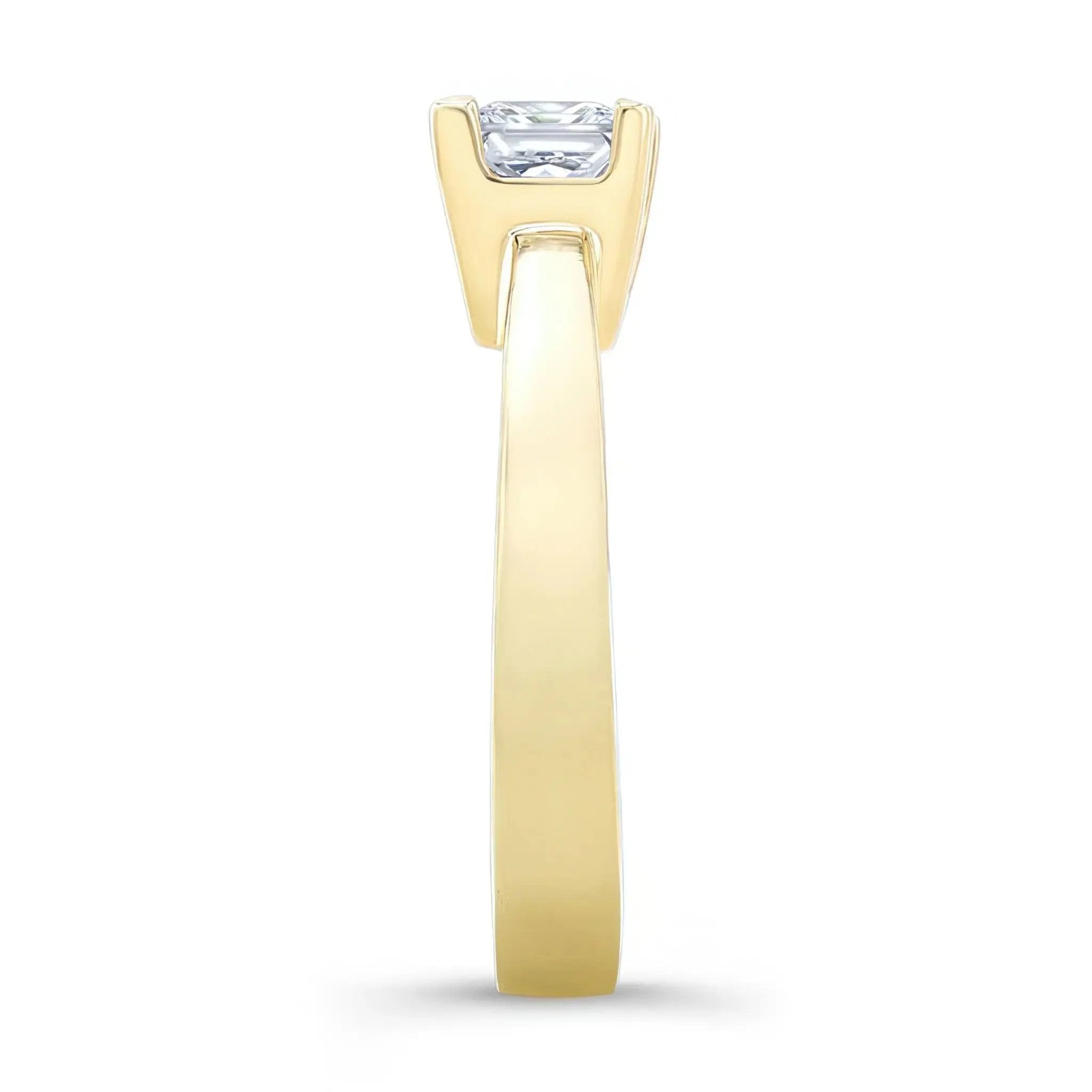 An elegant princess cut solitaire moissanite ring featuring a 1 carat center stone sitting on a gold band.