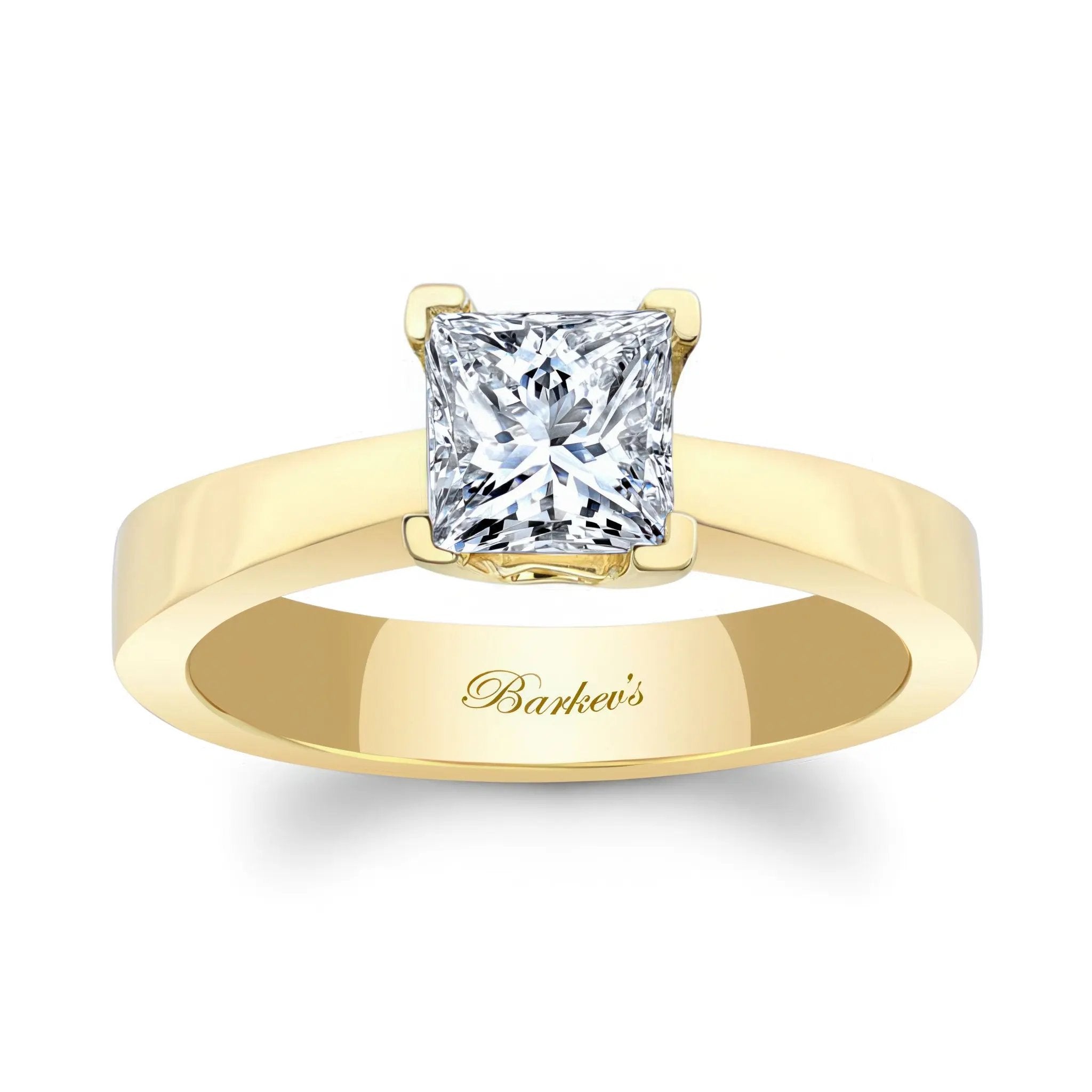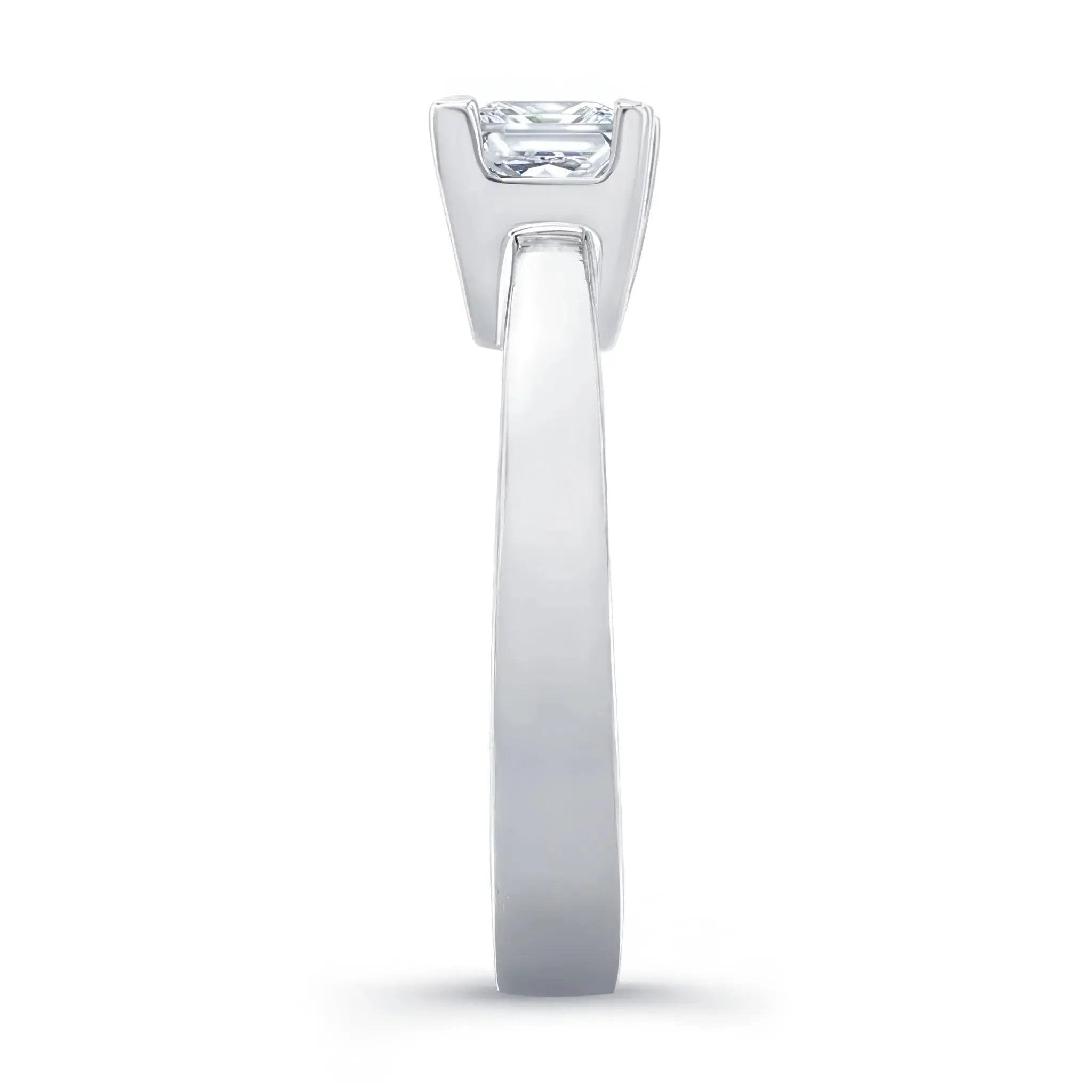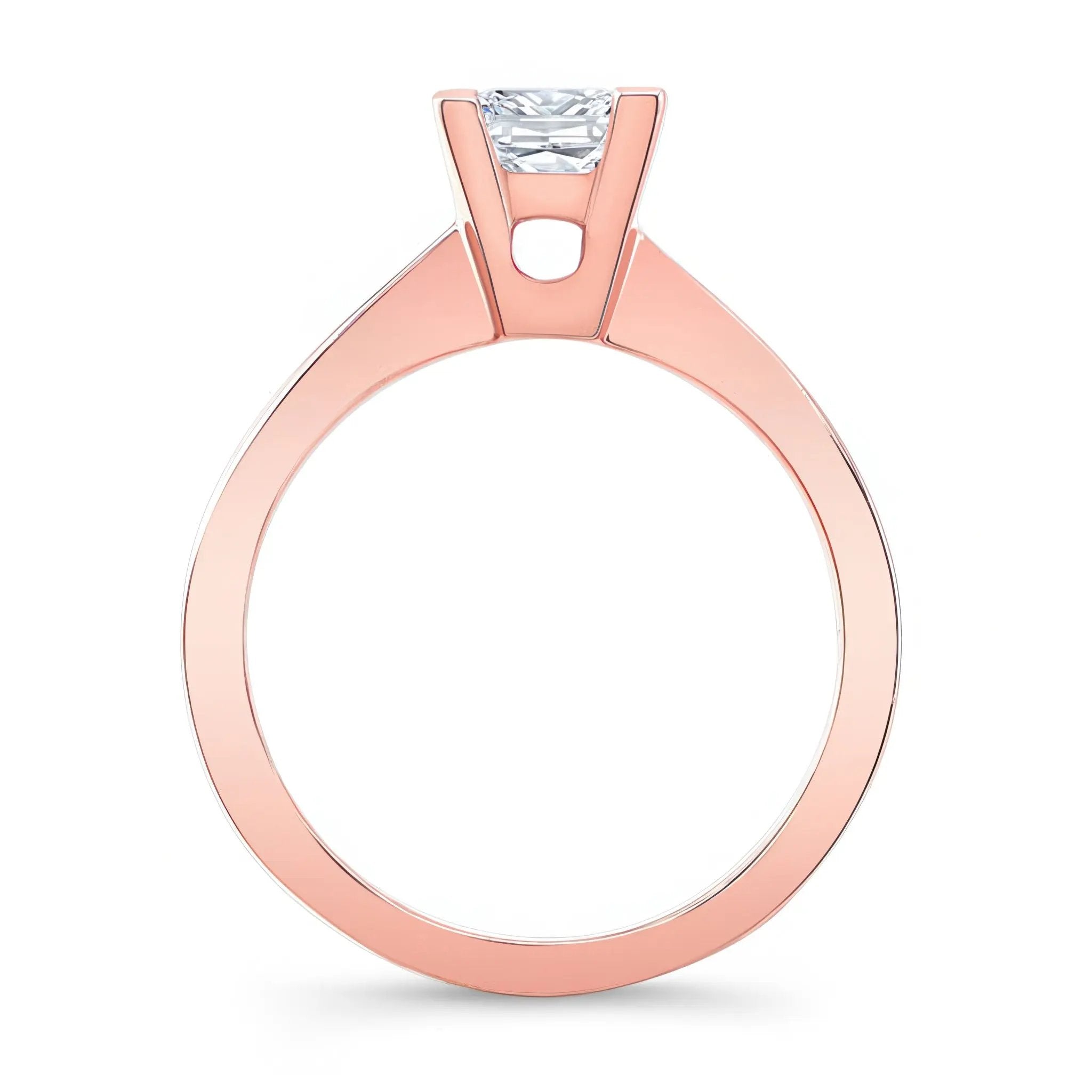 An elegant princess cut solitaire moissanite ring featuring a 1 carat center stone sitting on a gold band.