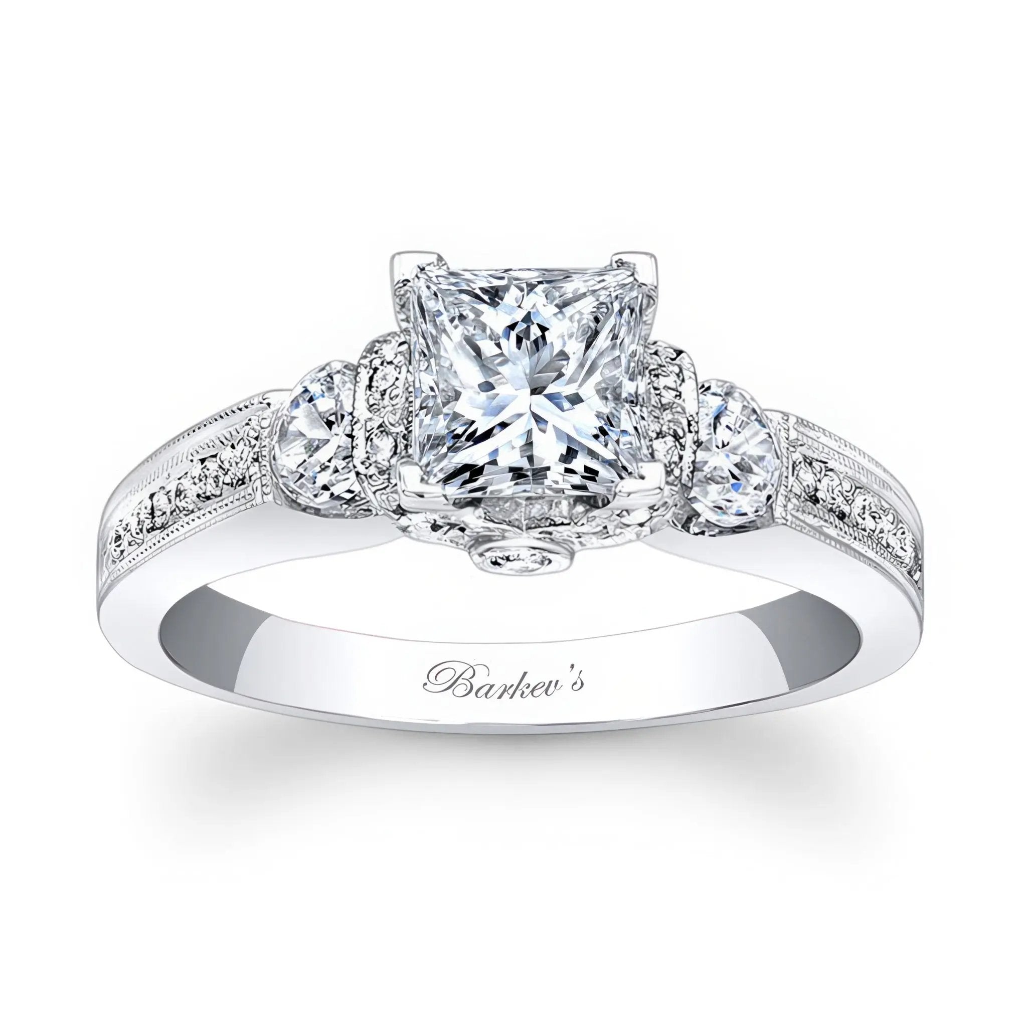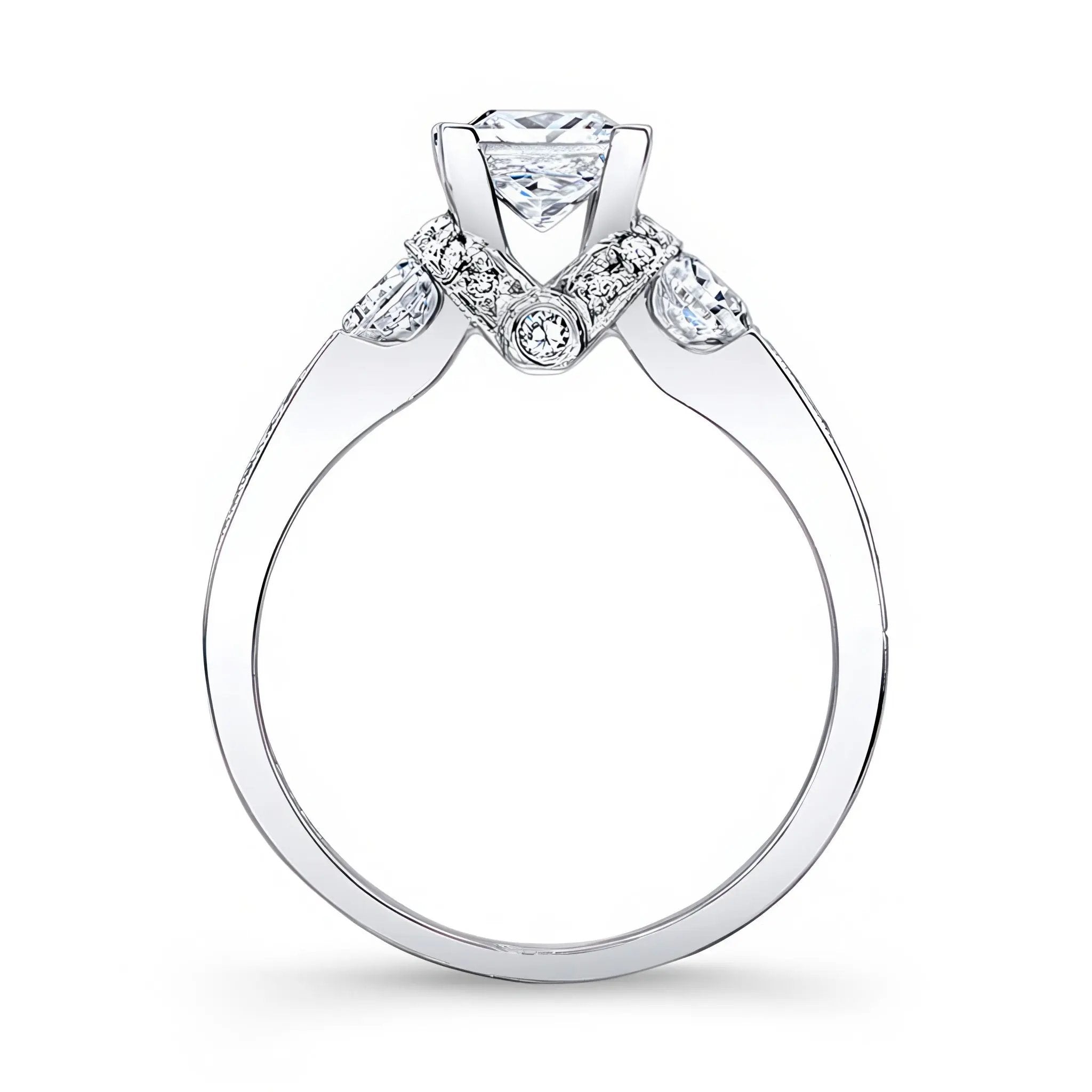 This princess cut three stone ring features a prong set center with pave set diamonds flanking the sides graced by diamonds on the walls with a milgrain finishing touch.