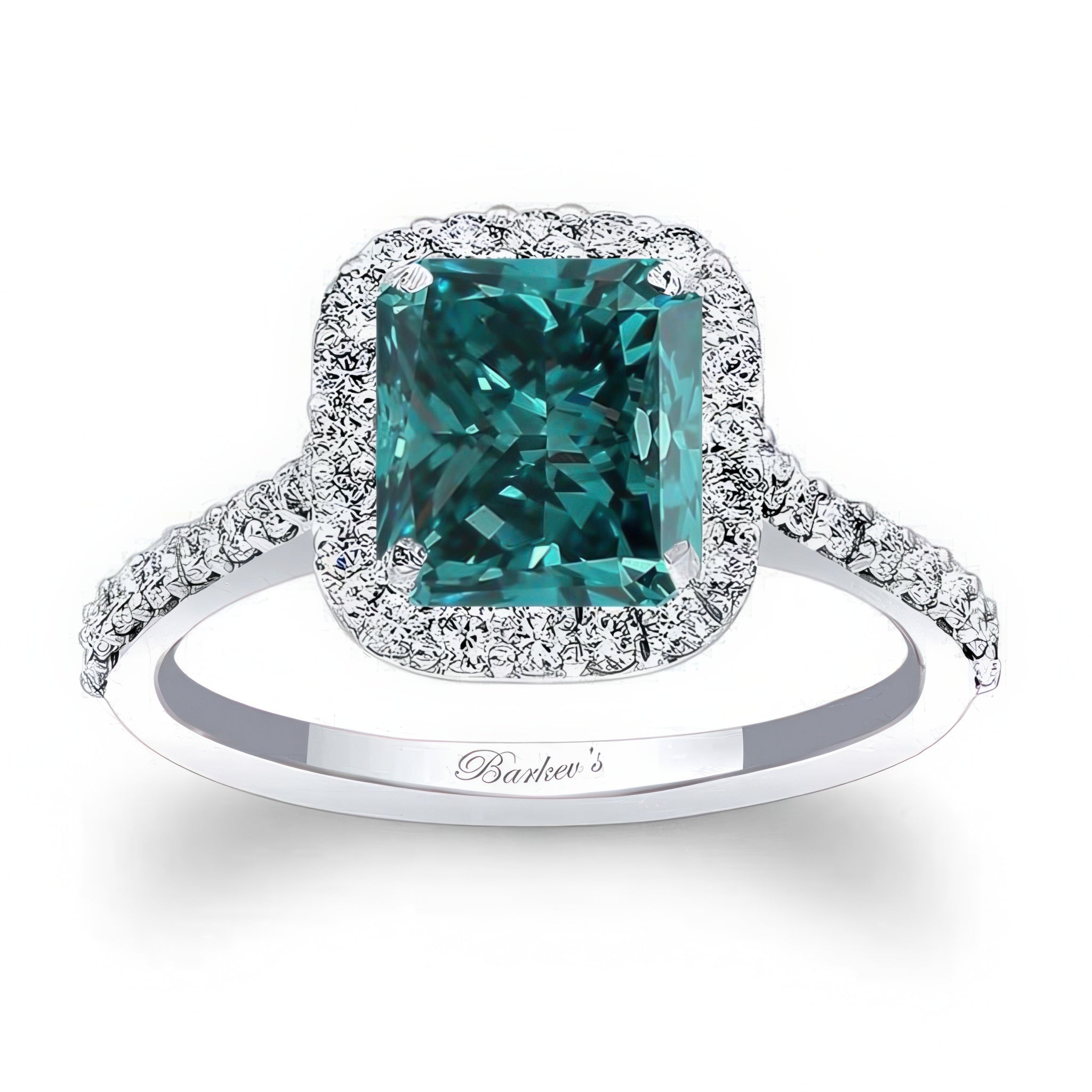 This radiant cut blue and white diamond halo ring features shared prong set diamonds encircling the center with additional diamonds cascading down the dainty shank for a look of sheer elegance.
