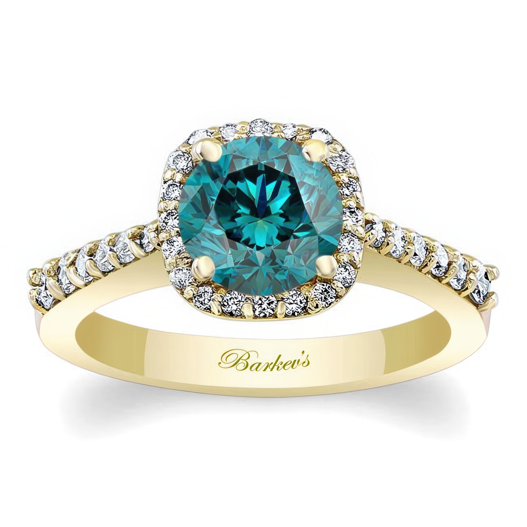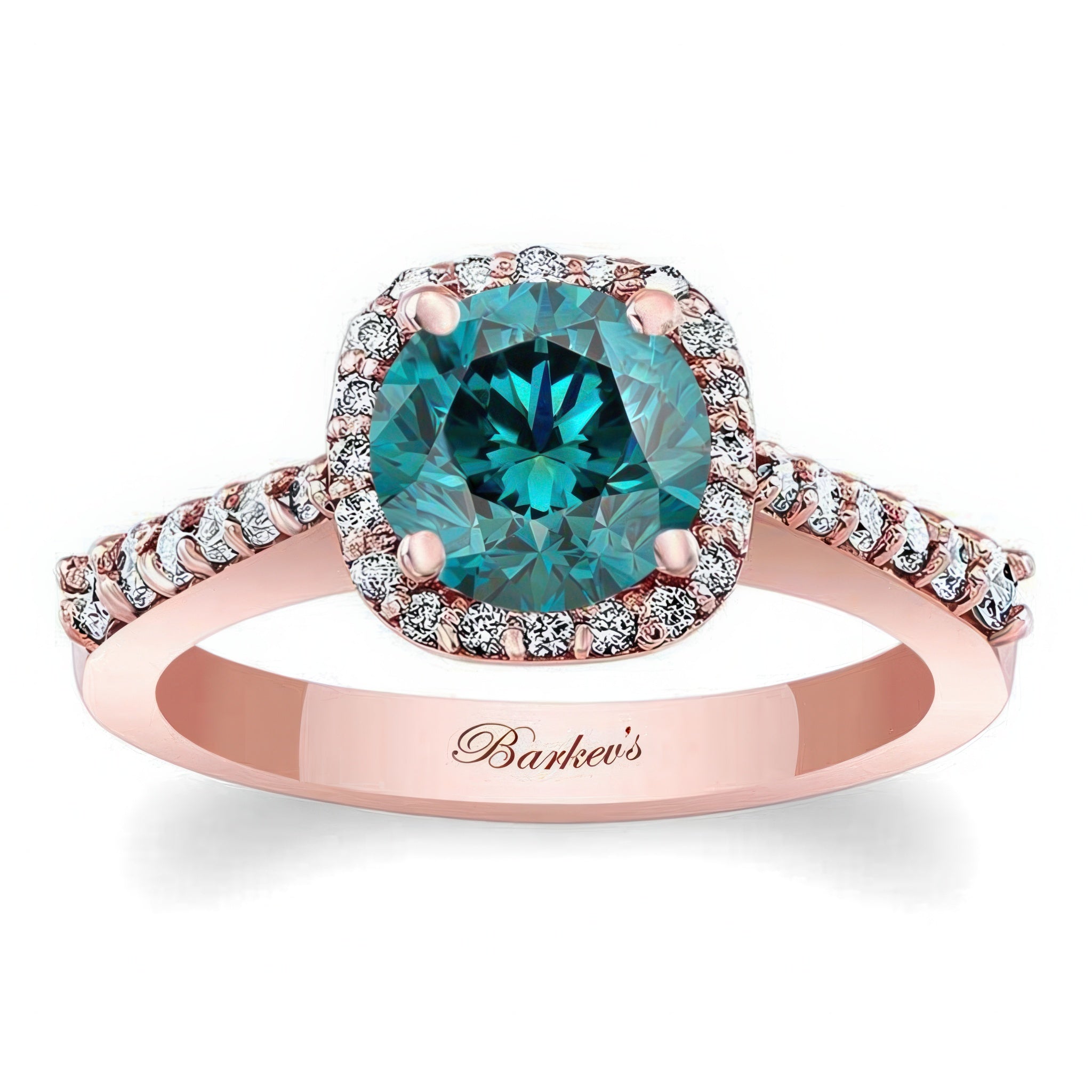 This round blue and white diamond halo ring features a cathedral shank with a prong set round center and a cushion halo while shared prong set diamonds graduate up the dainty tapering shank for a look of sheer elegance.