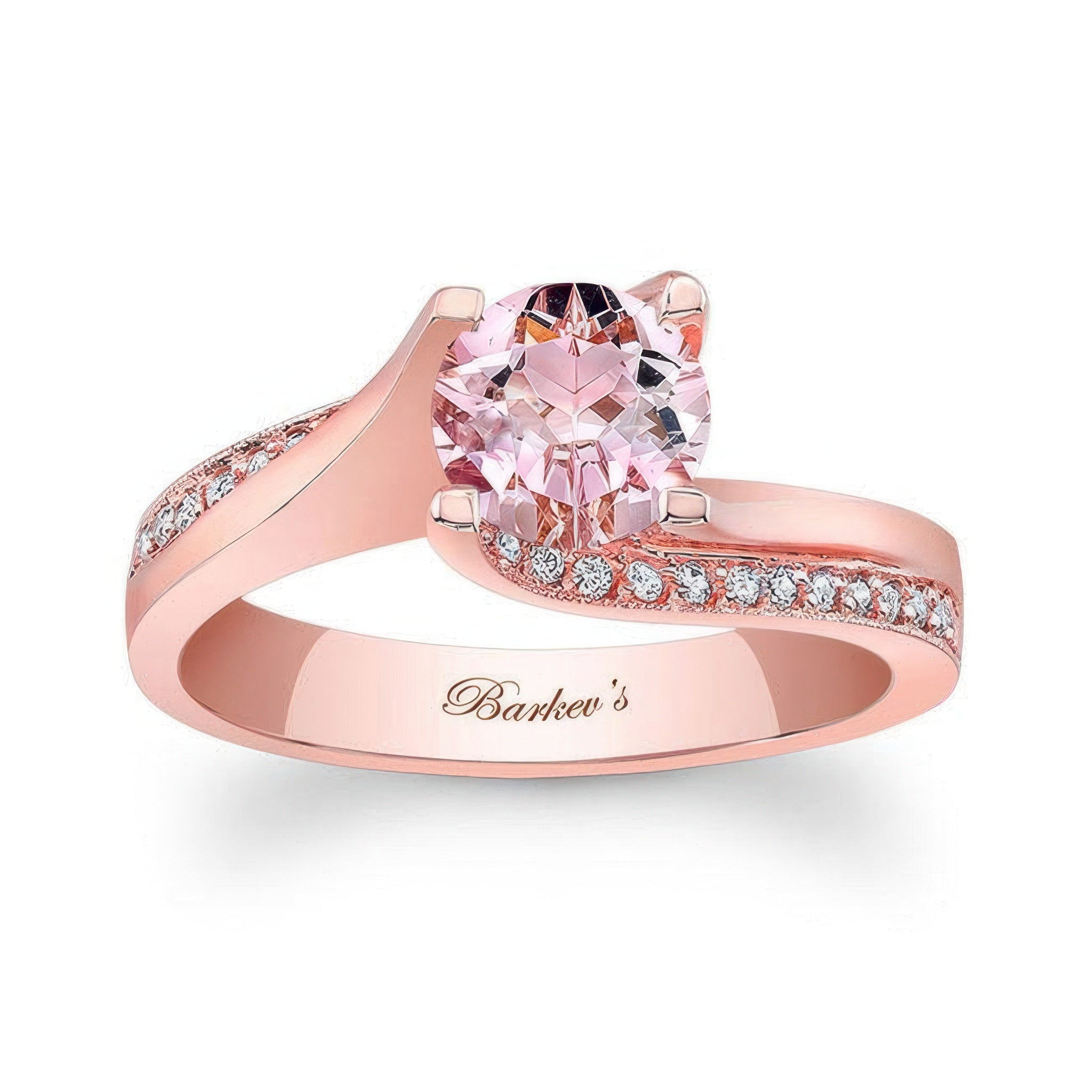 This timeless round cut morganite ring features a 1 carat center stone with pave set diamonds on sides and milgrain detailing for a sophisticated aura.