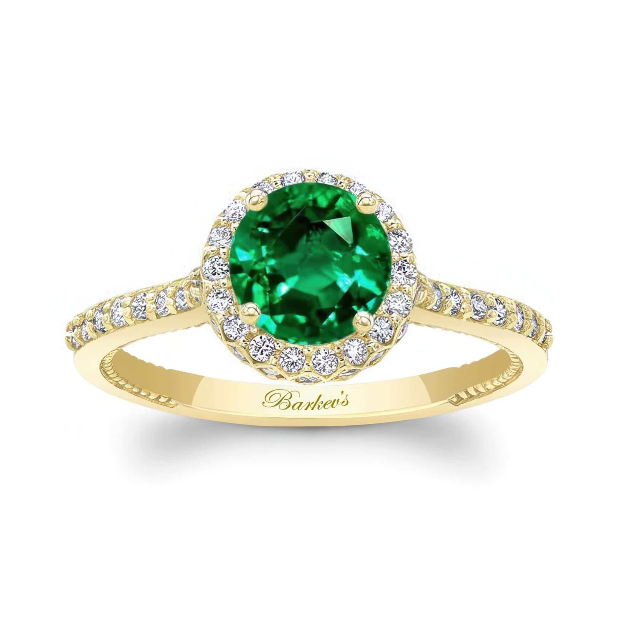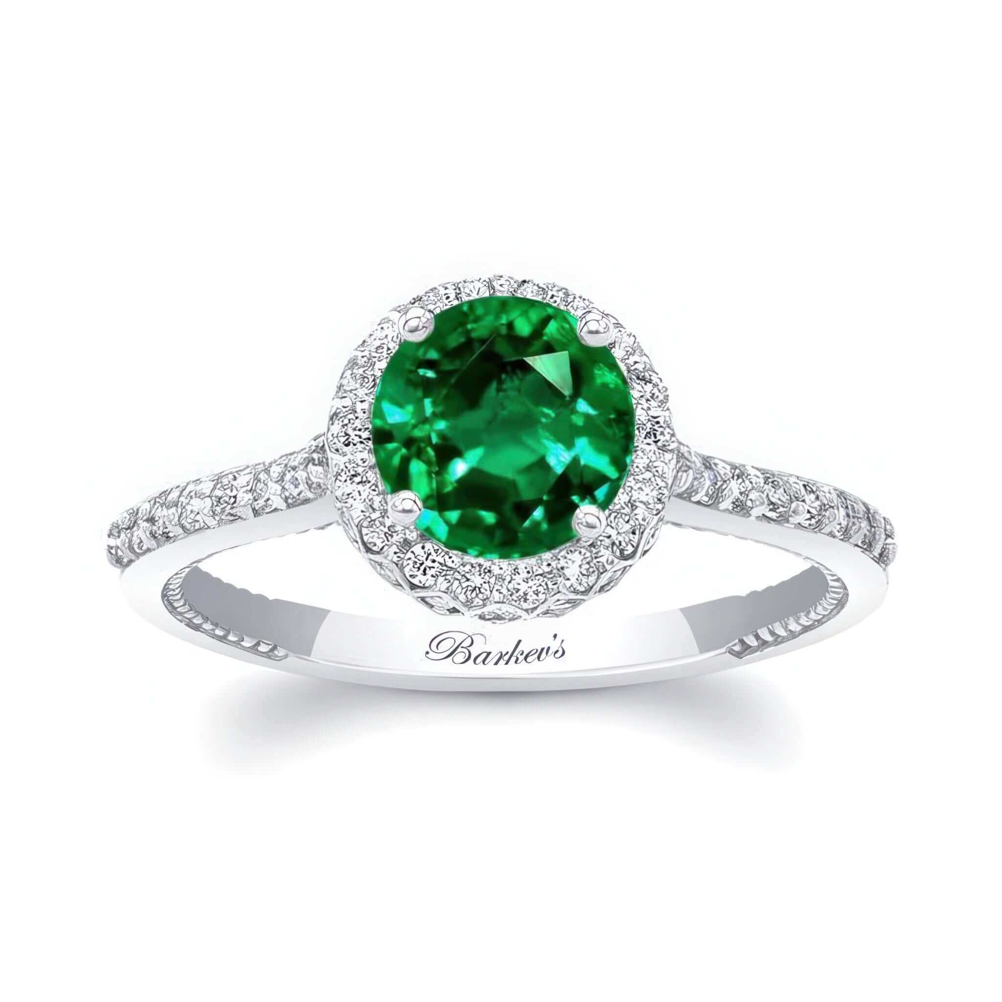 An exquisite round halo emerald and diamond ring with a center surrounded by shared prong diamonds that continue down the shoulders. The profile view reveals a second hidden halo around the sides and two larger bezel set diamonds sitting just beneath the center.