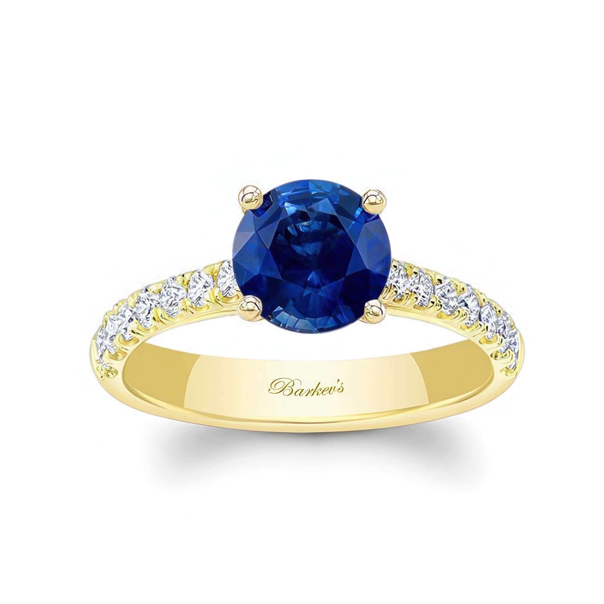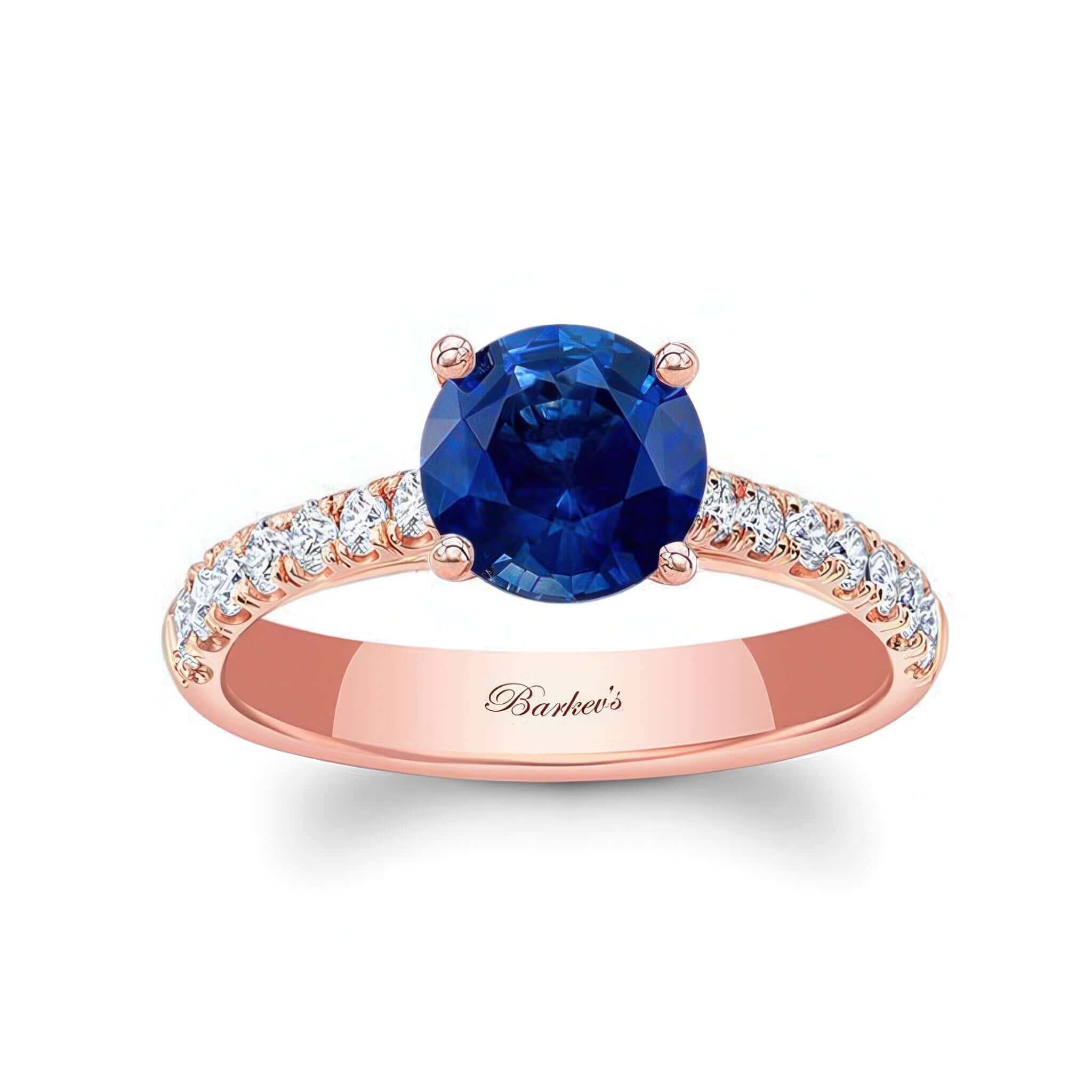 A beautiful round lab grown blue sapphire and diamond engagement ring featuring a prong set round center with french cut pave set diamonds on the sides for extra sparkle.