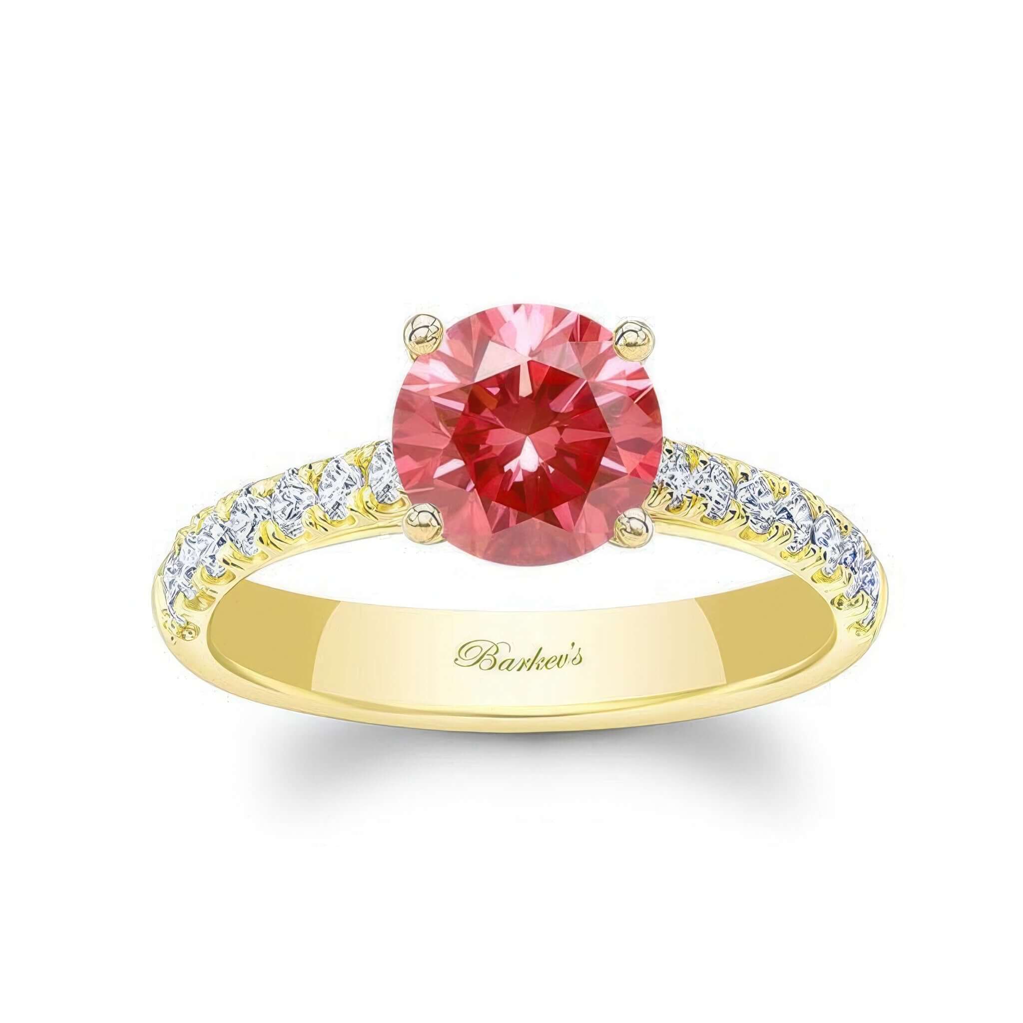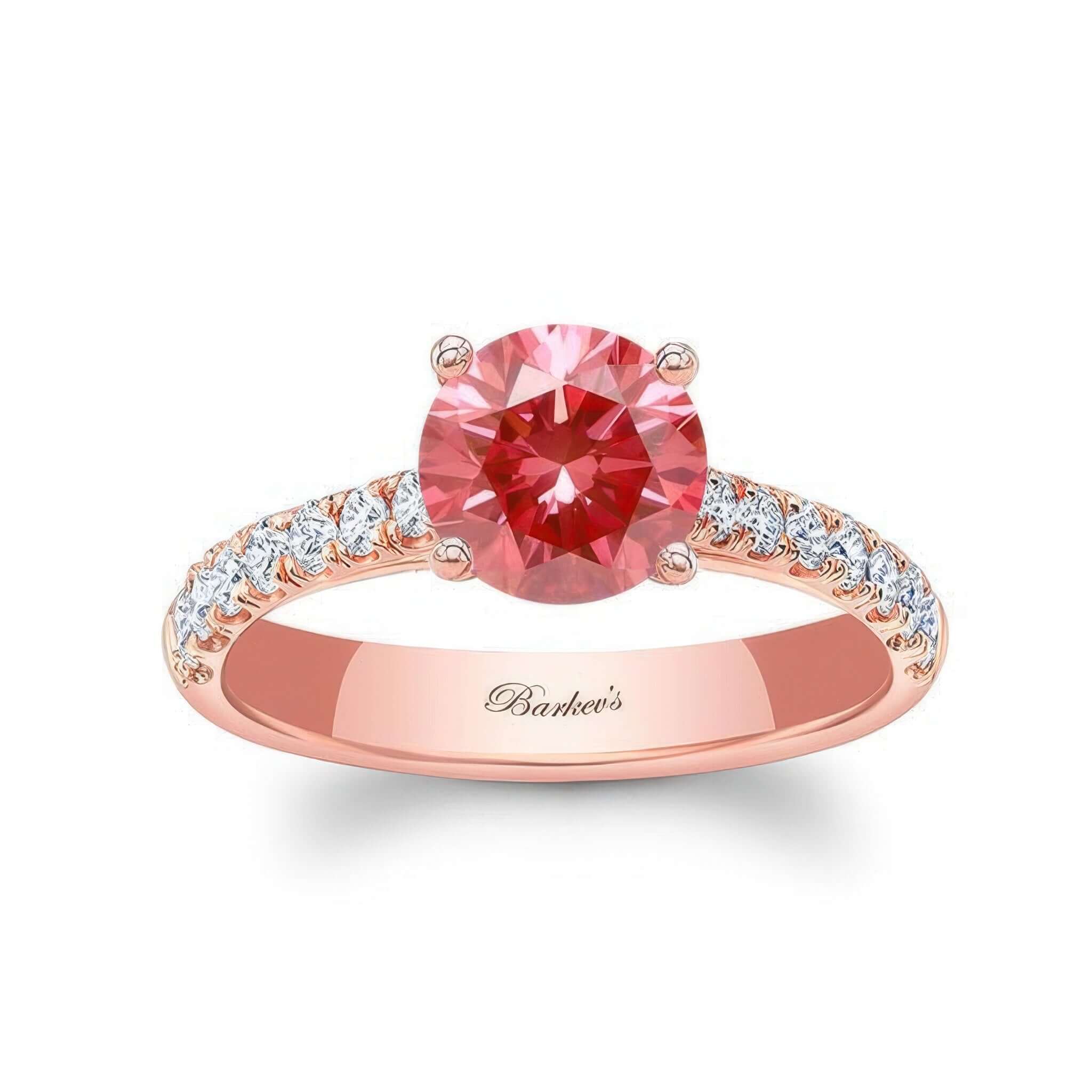 A beautiful round lab grown pink diamond engagement ring featuring a prong set round center with french cut pave set diamonds on the sides for extra sparkle.