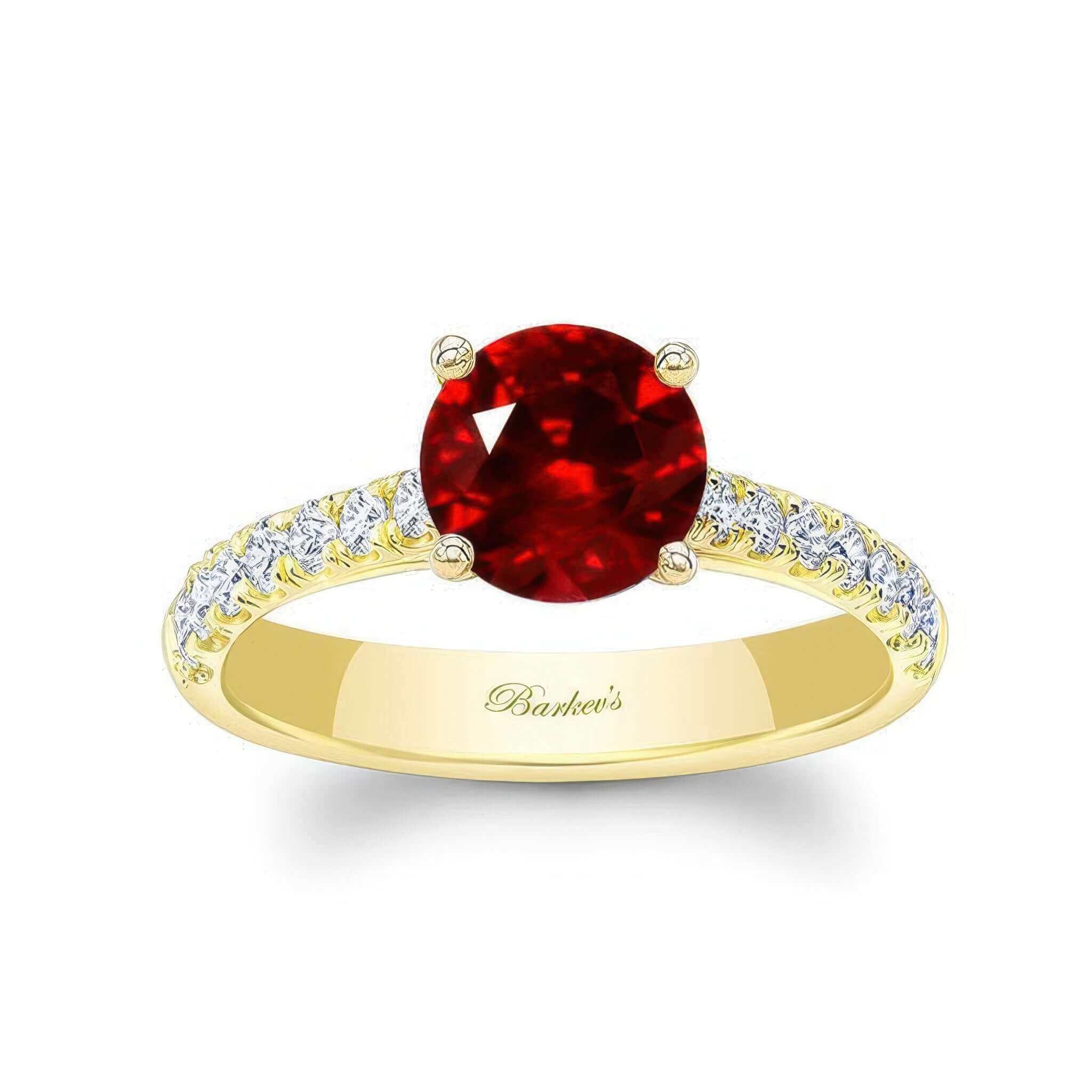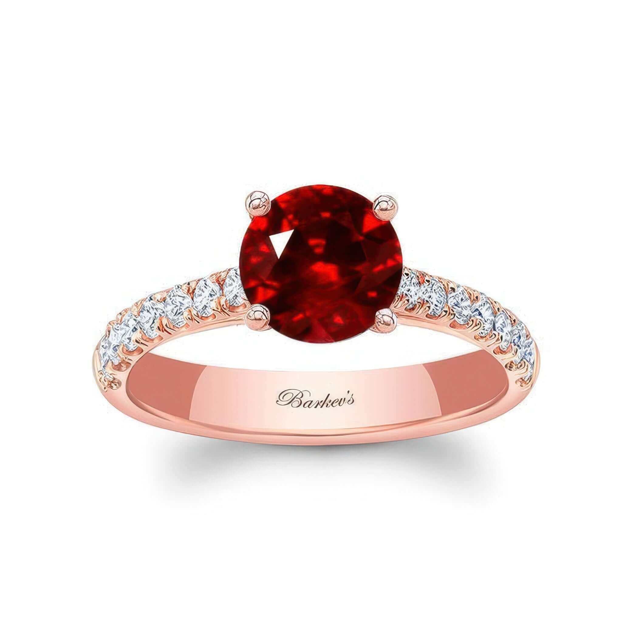 A beautiful round ruby and diamond engagement ring featuring a prong set round center with french cut pave set diamonds on the sides for extra sparkle.
