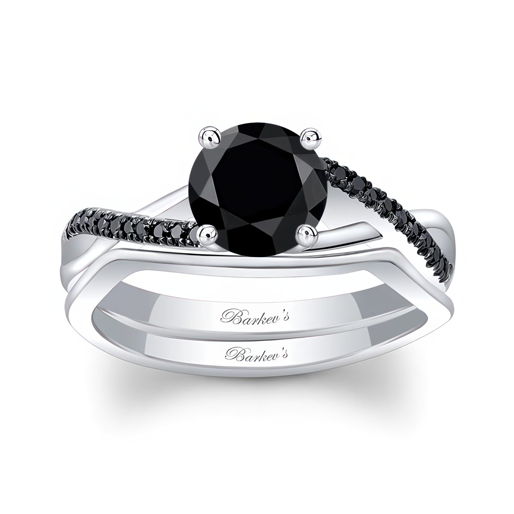 This stunning simple black diamond bridal set features a prong set round center with intertwining shoulders adorned with shared prong set black diamond melees. Comes with a matching wedding band.