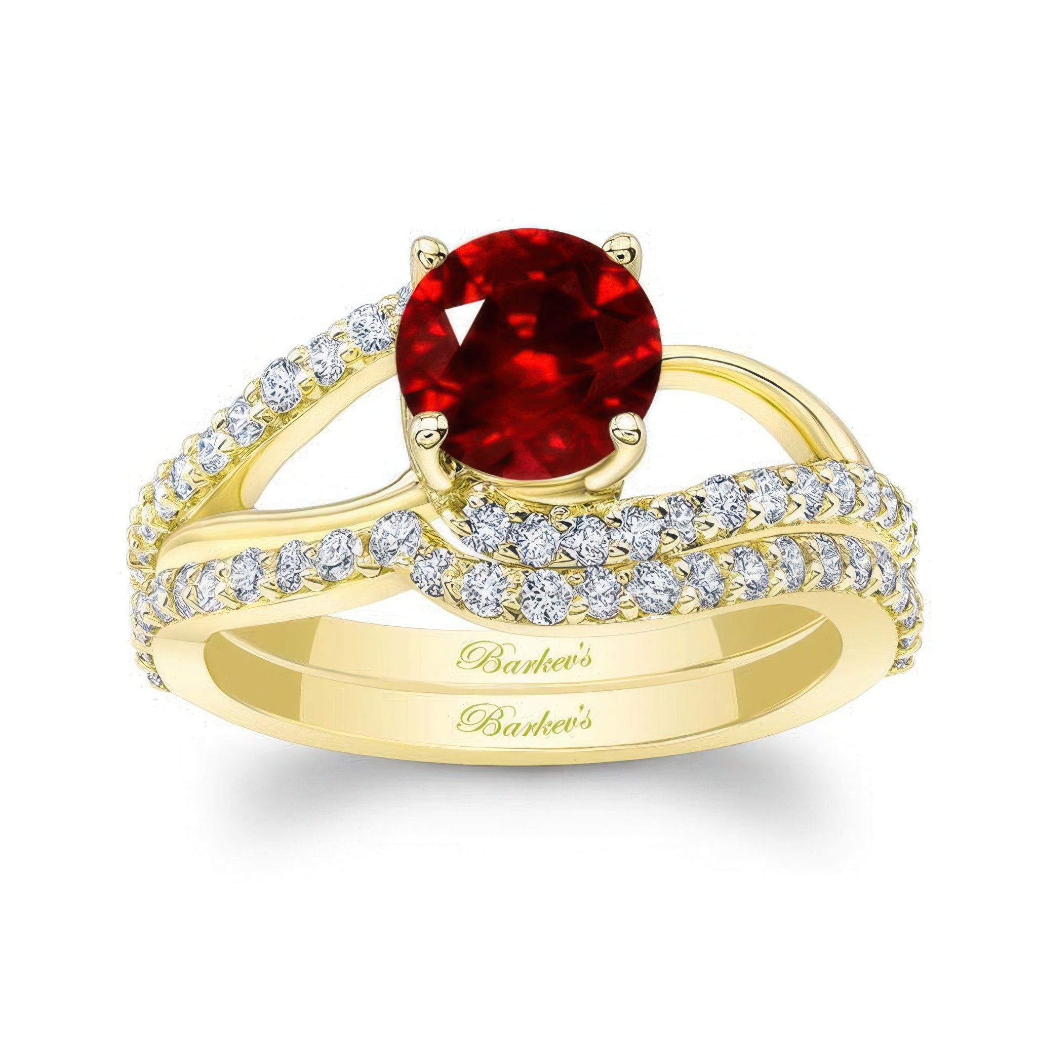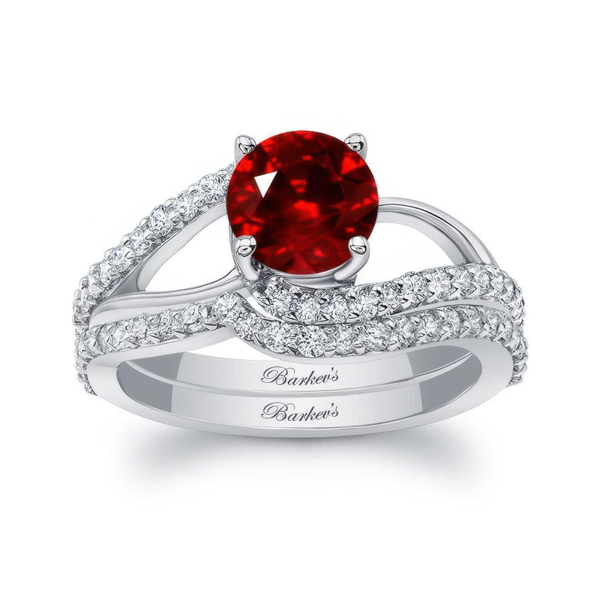 This split shank lab grown ruby and diamond bridal set features a round center, while it's split shoulders are adorned with diamonds. The matching diamond wedding band follows the curves of the ring for a flawless final look.