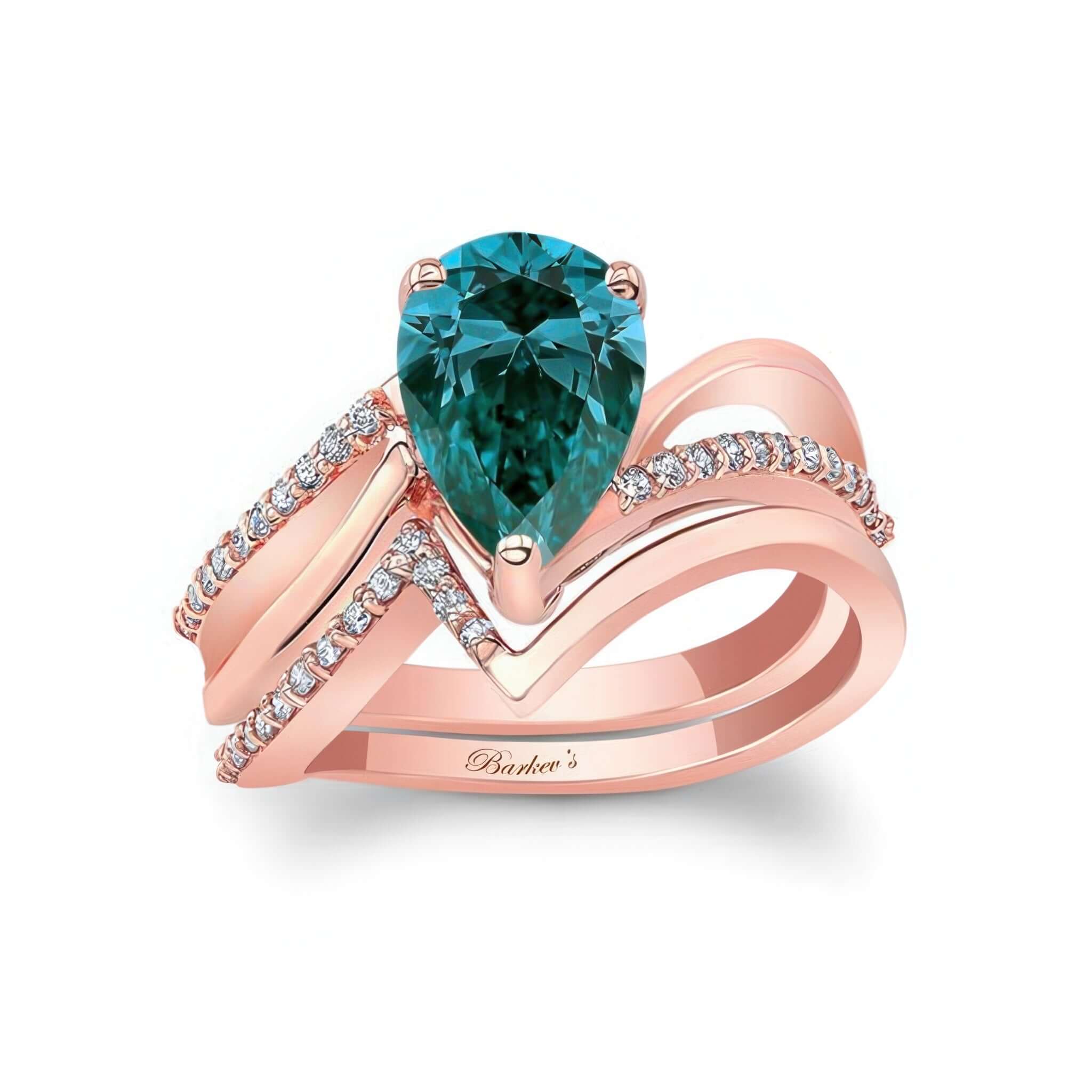 This split shank pear blue and white diamond bridal set features a center glorified by two graceful swirls, one of which is decorated by a row of prong set diamonds and a matching wedding band adding the final touch to its overall glamorous effect.