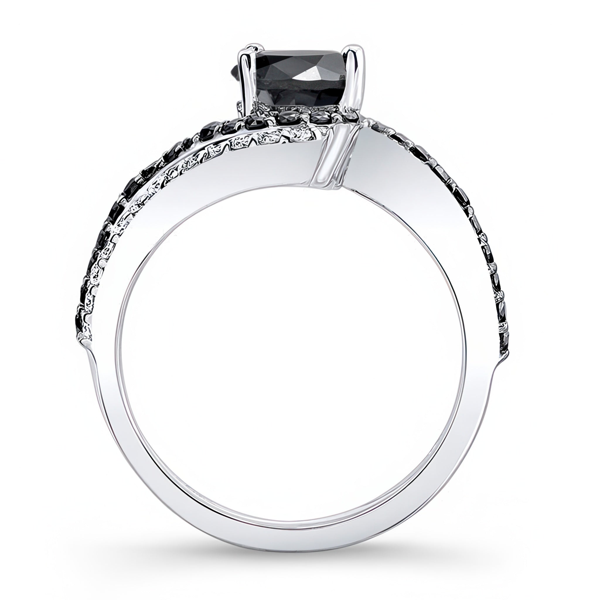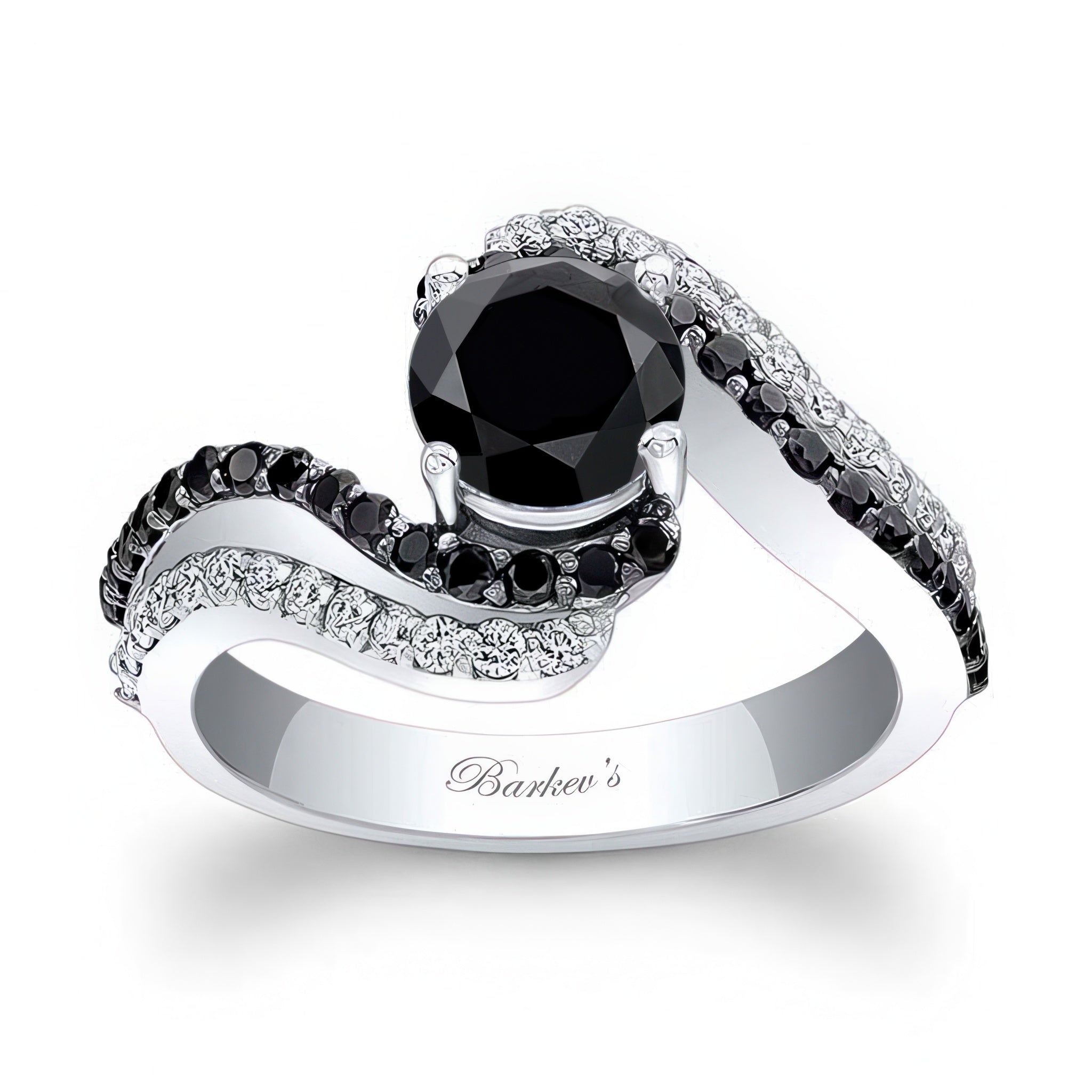 This swirl black diamond engagement ring features a double row of shared prong set black and white diamonds swirling around the prong set round center for a classic sophisticated look.