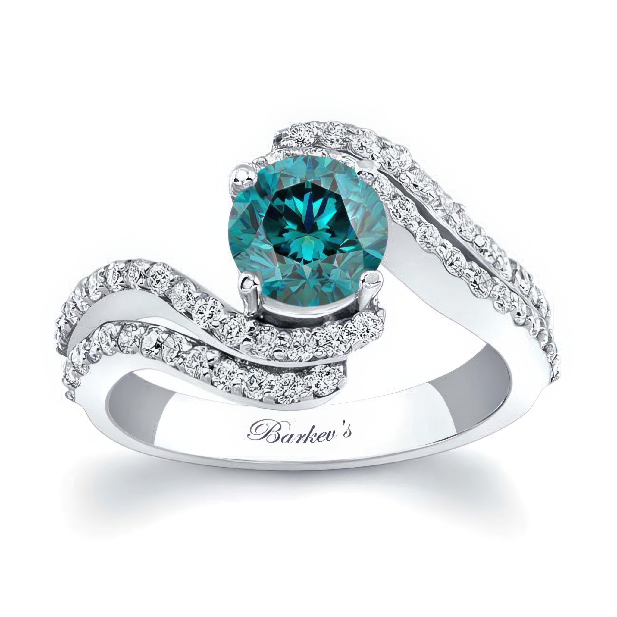 This swirl blue and white diamond engagement ring features a double row of shared prong set diamonds swirling around the prong set round center for a classic sophisticated look.