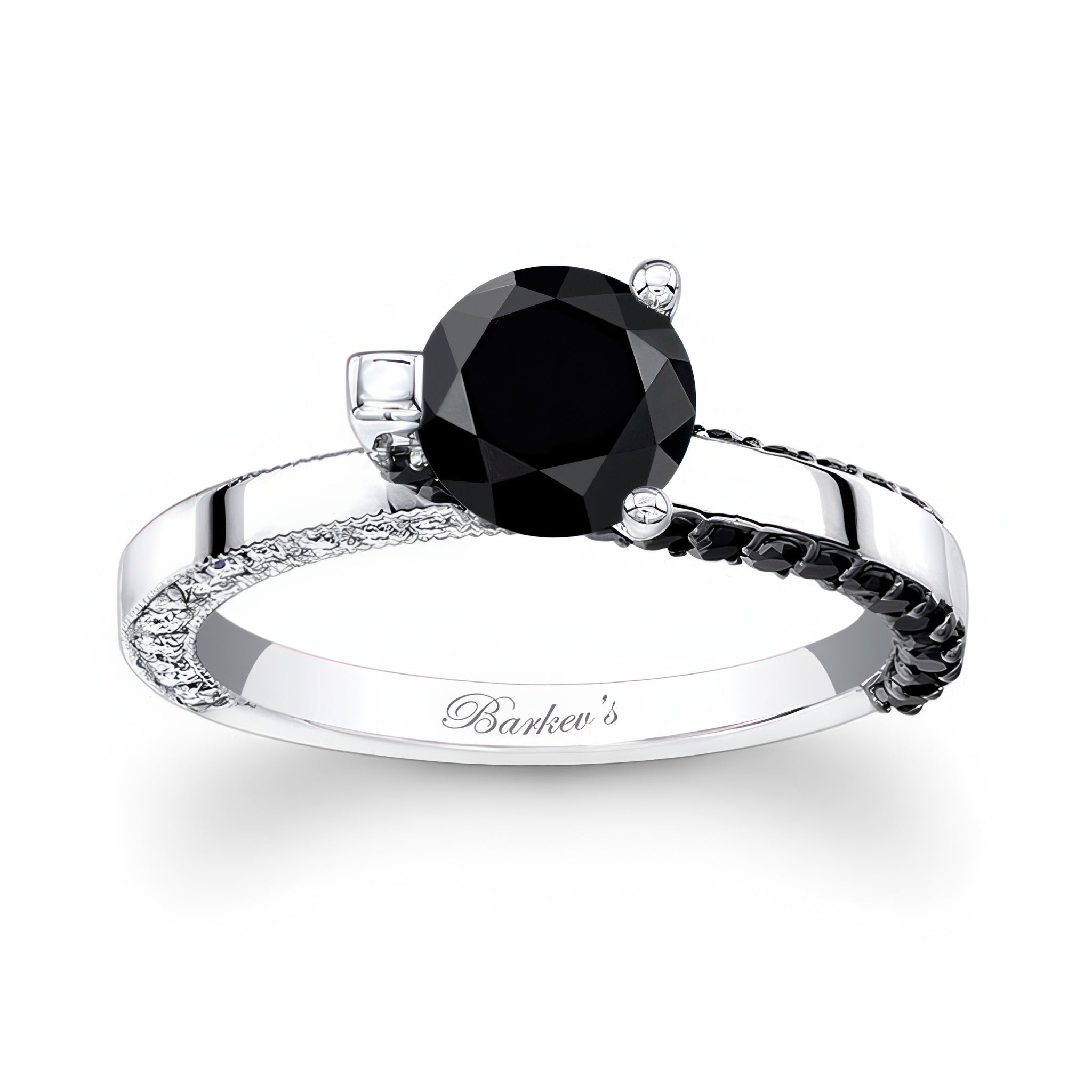This daringly edgy three prong black diamond ring features a round center with pave set black and white diamonds artfully cascading down the sides for a dramatic look from every angle.