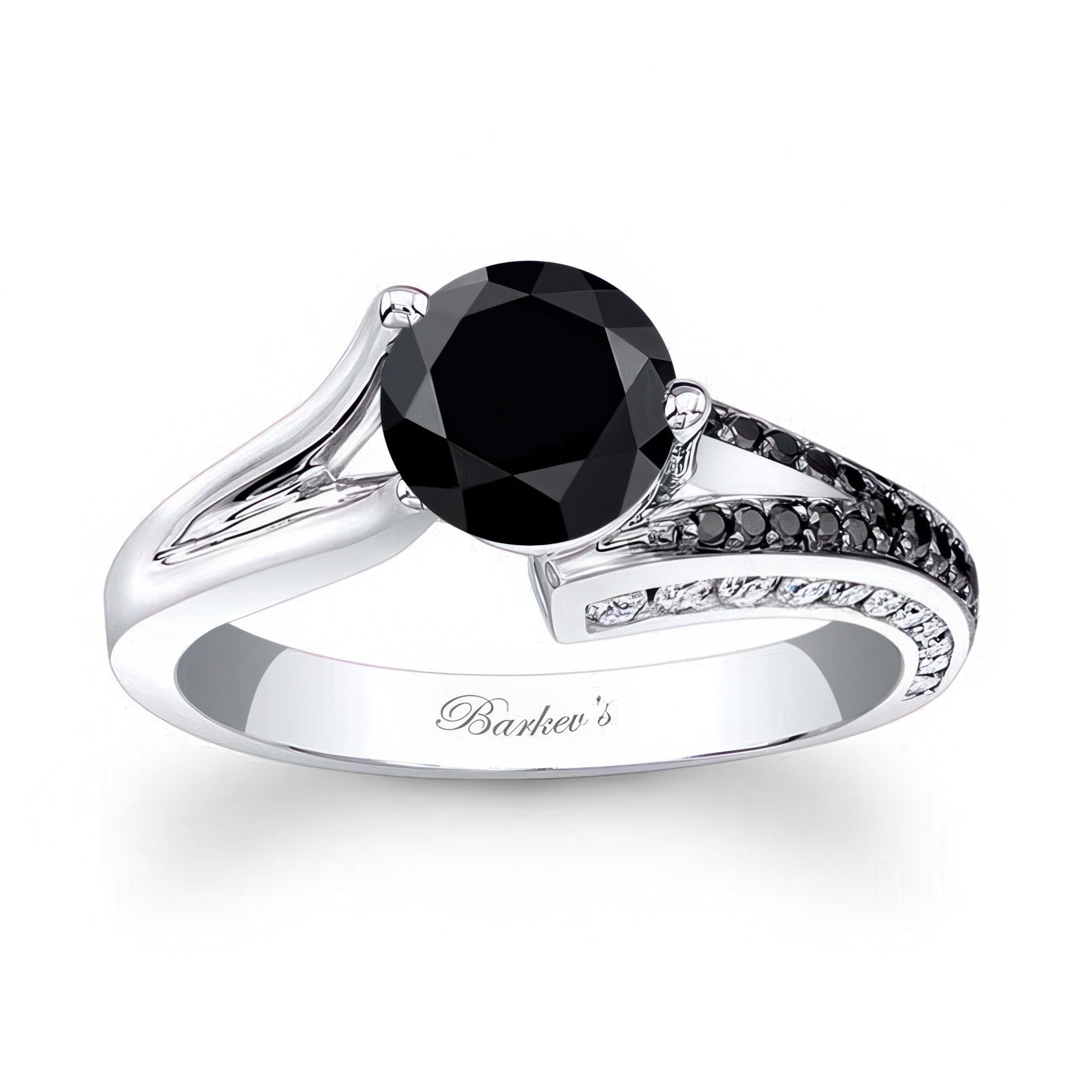 This three prong split shank black diamond ring features a round center with pave set black diamonds and channel set white diamonds cascading down the side gallery.
