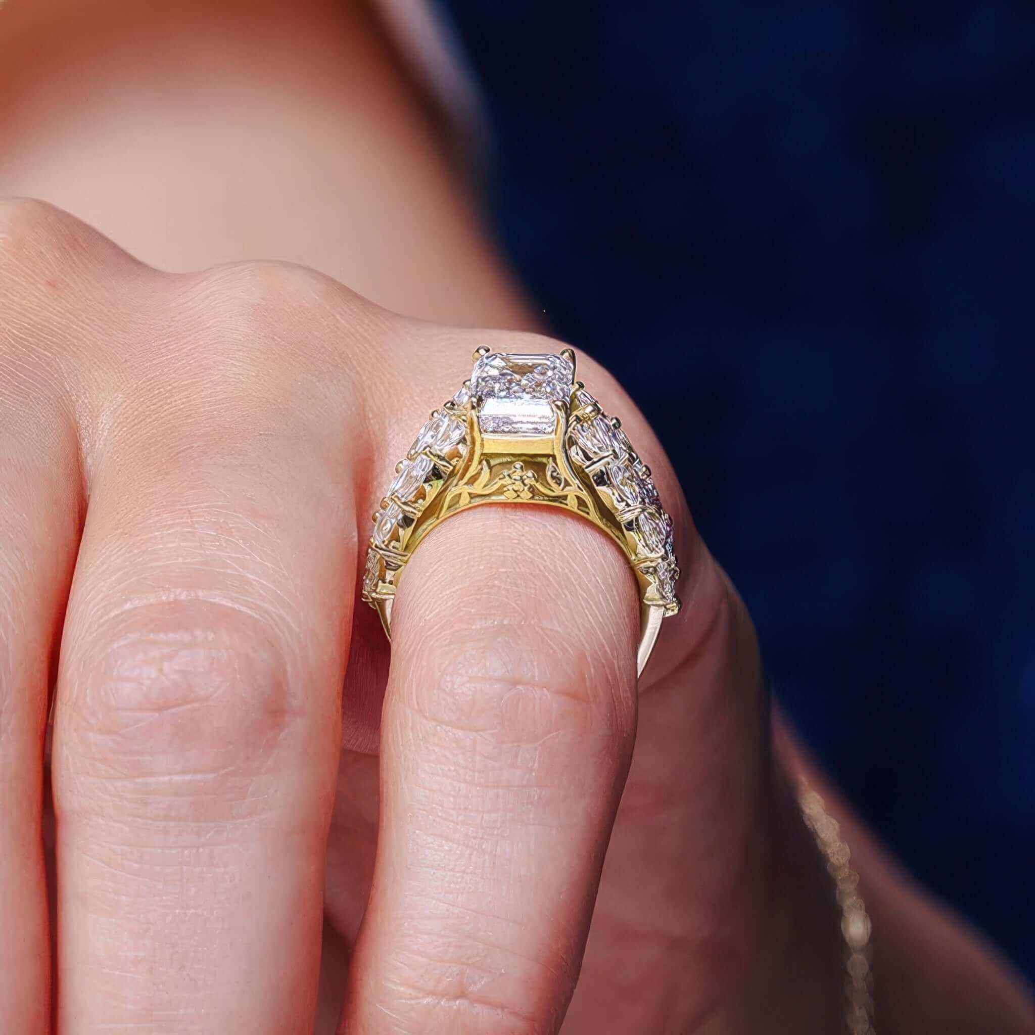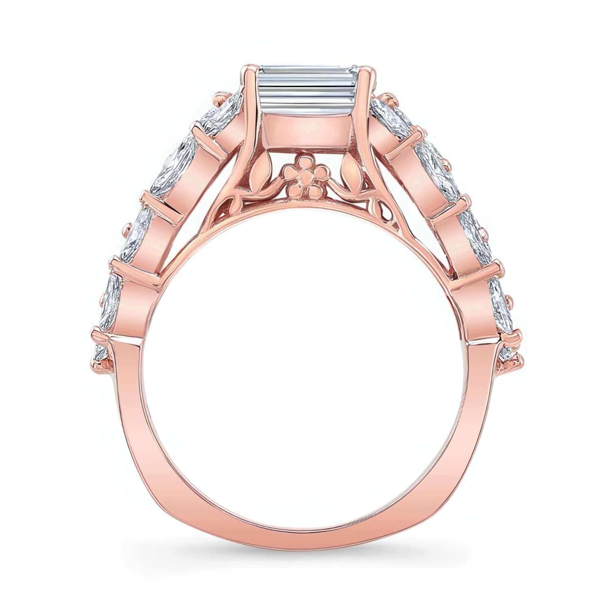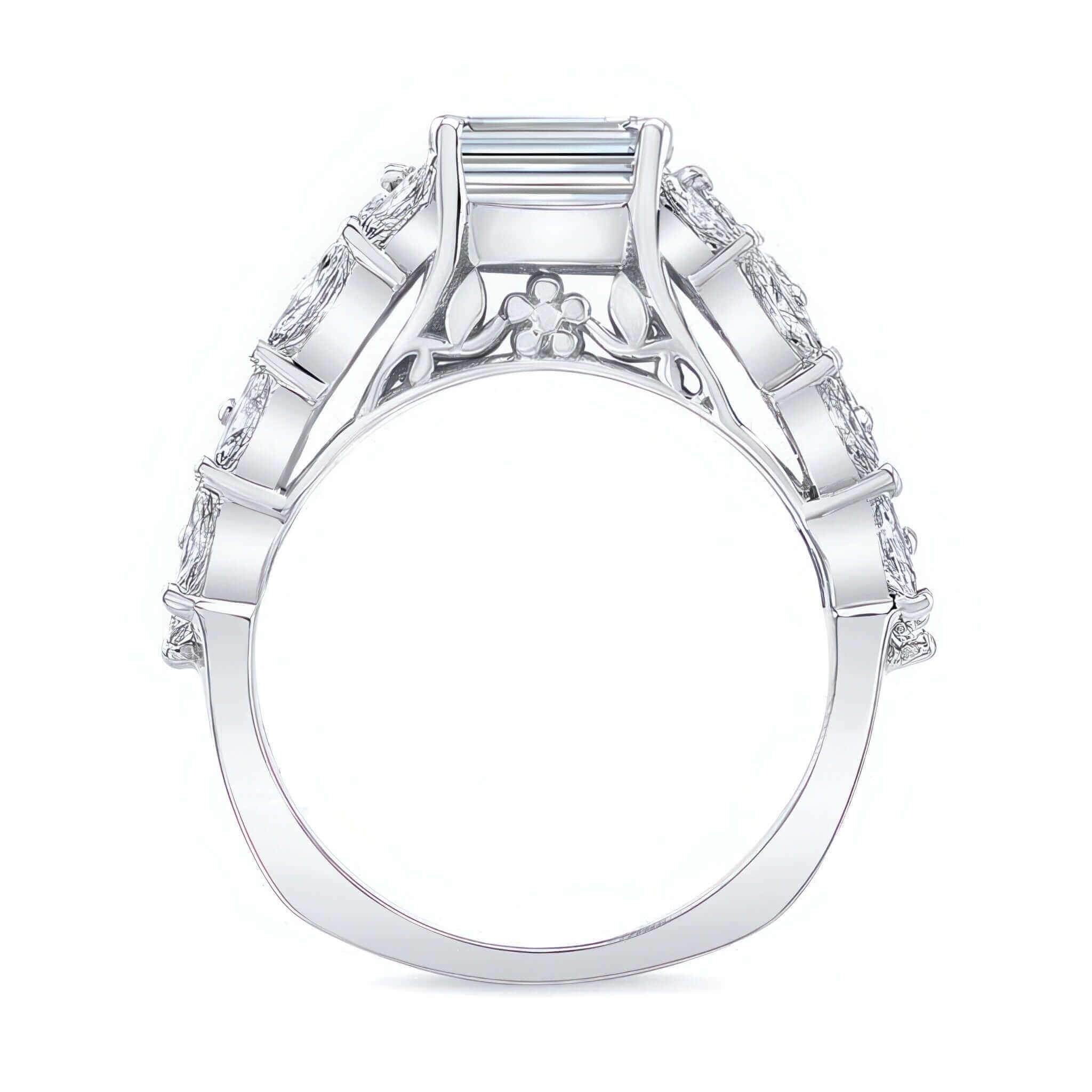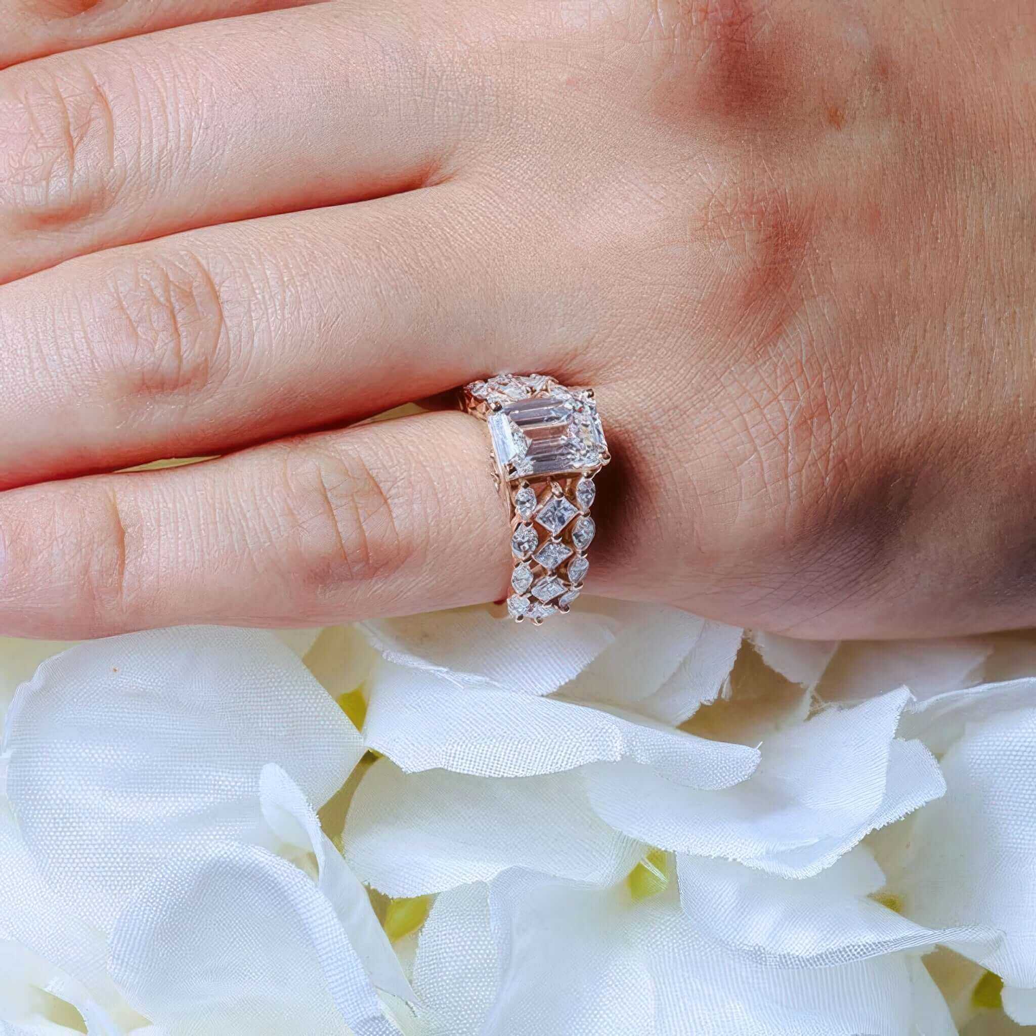 A bold three row diamond emerald cut moissanite ring lined with stunning pave set marquise and princess cut diamonds around the shank. The ring is topped with a shimmering emerald cut center featuring a surprise peekaboo flower design.