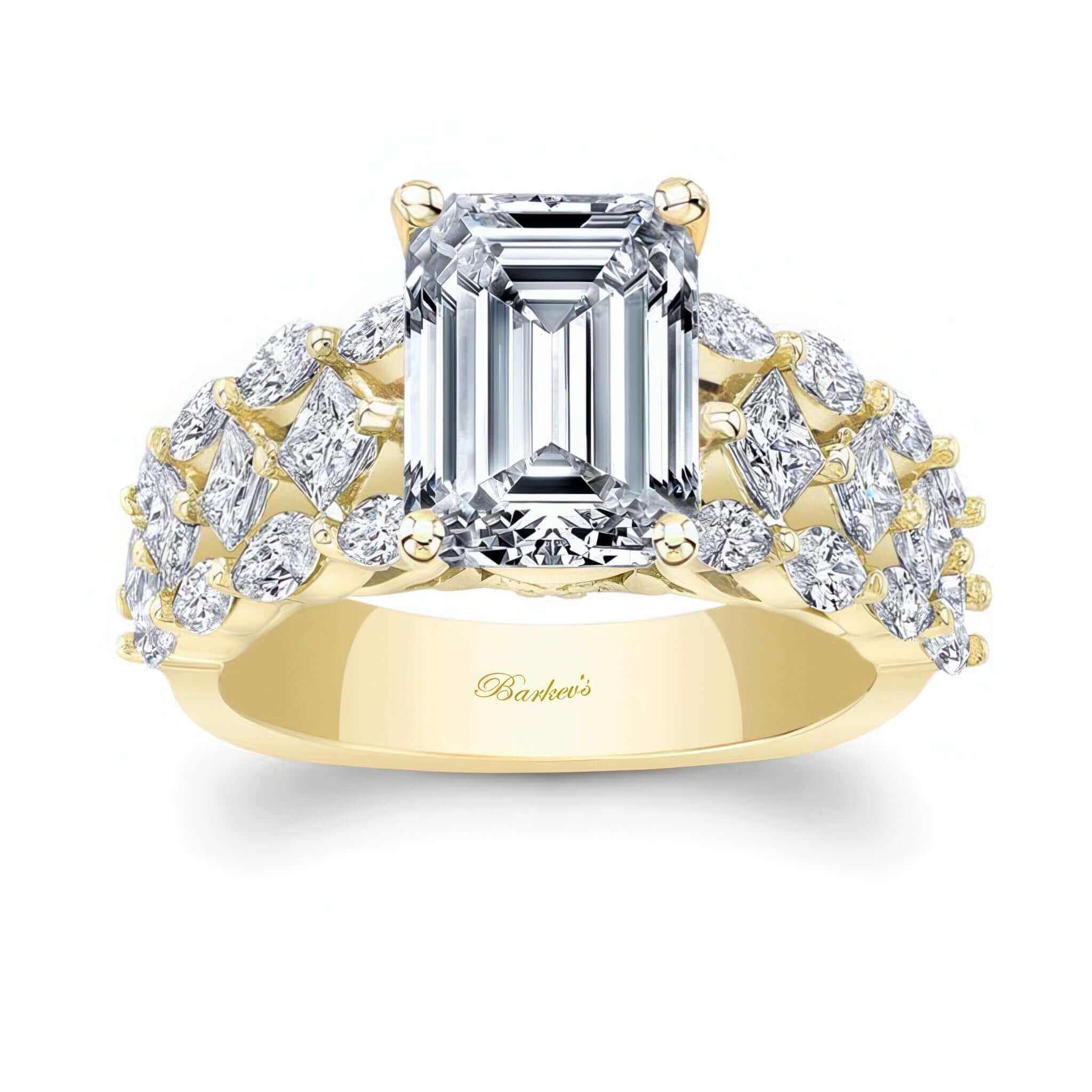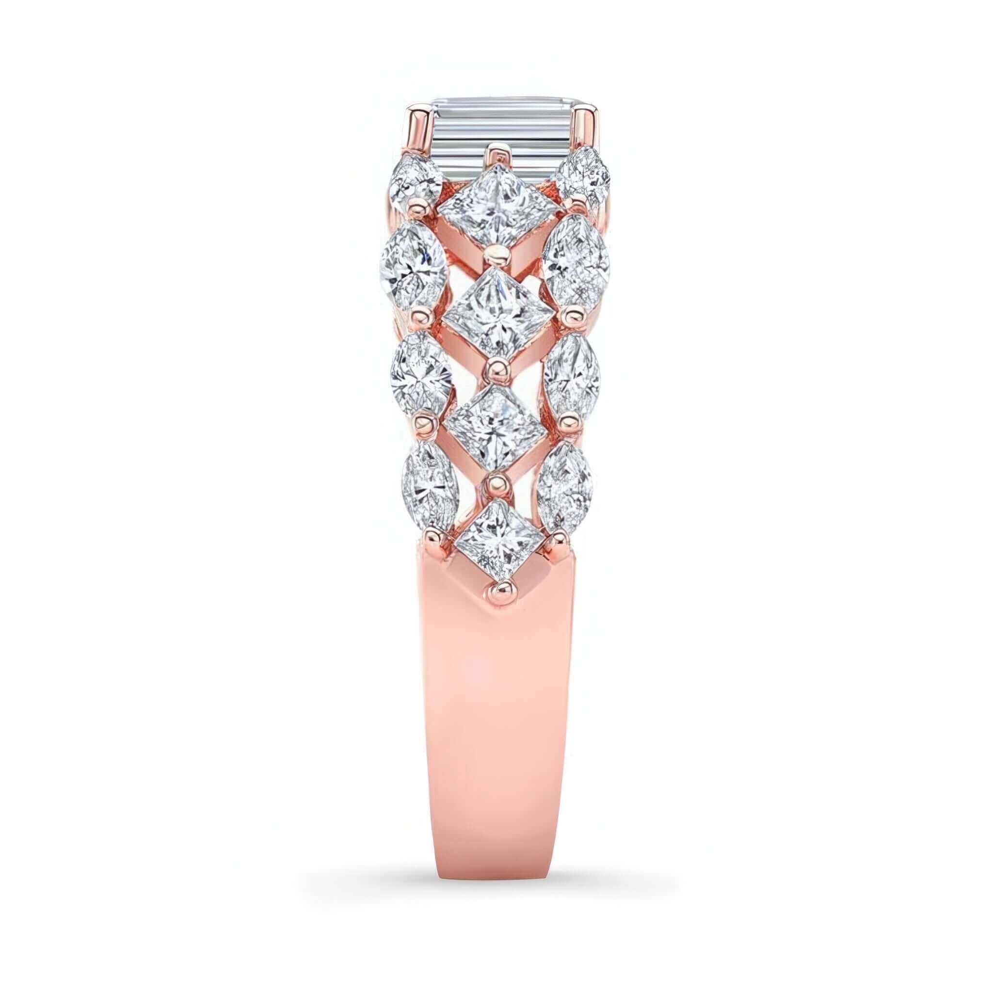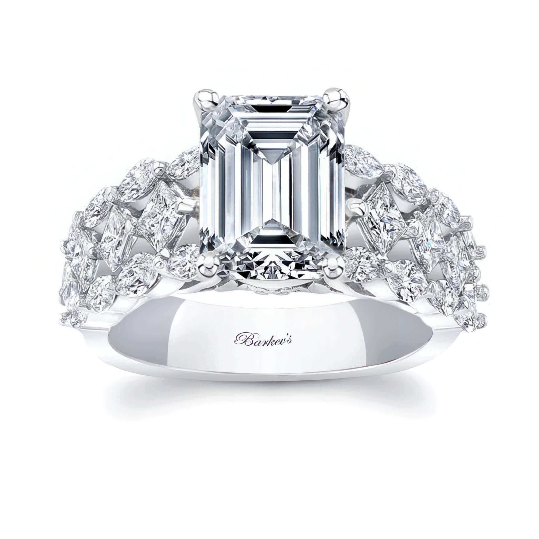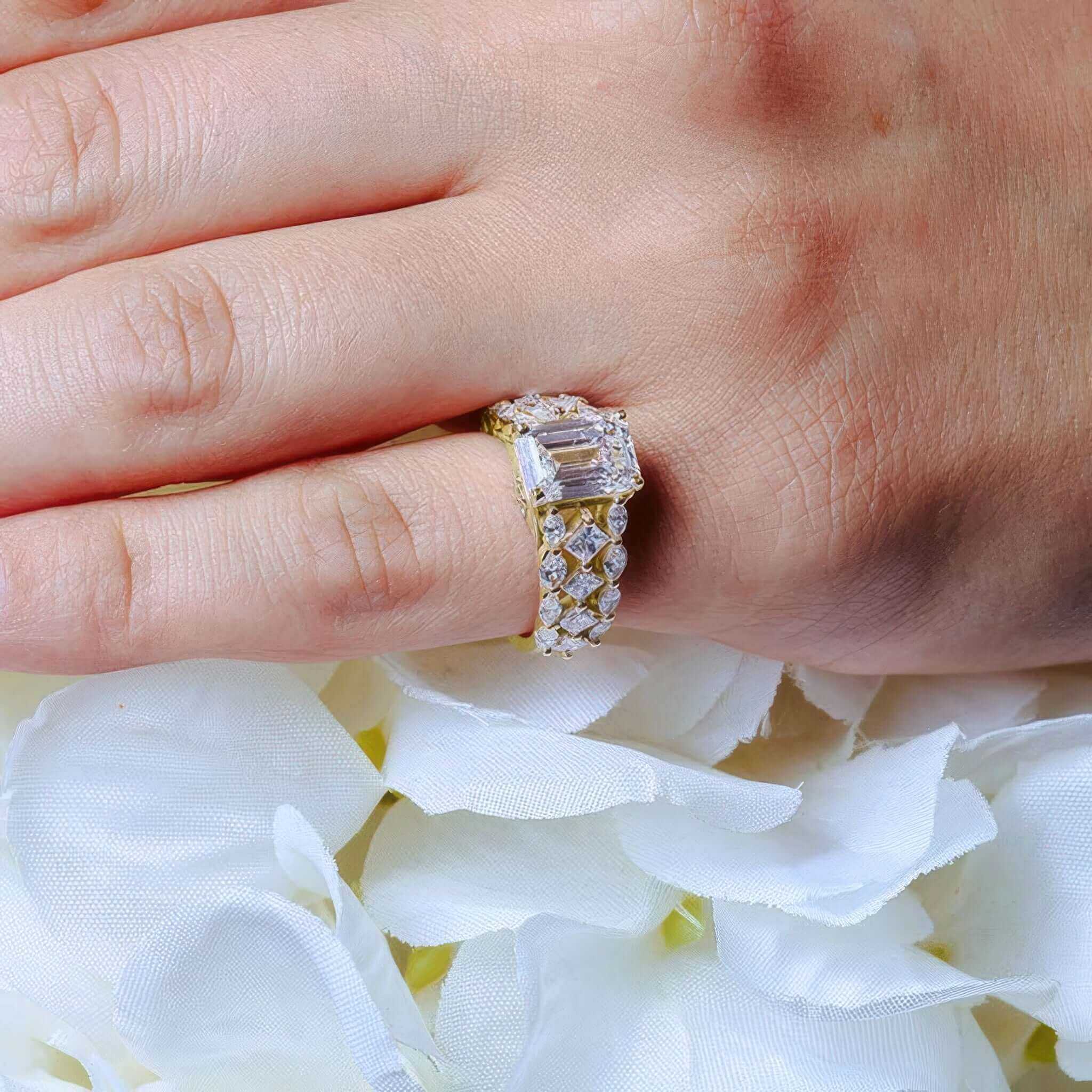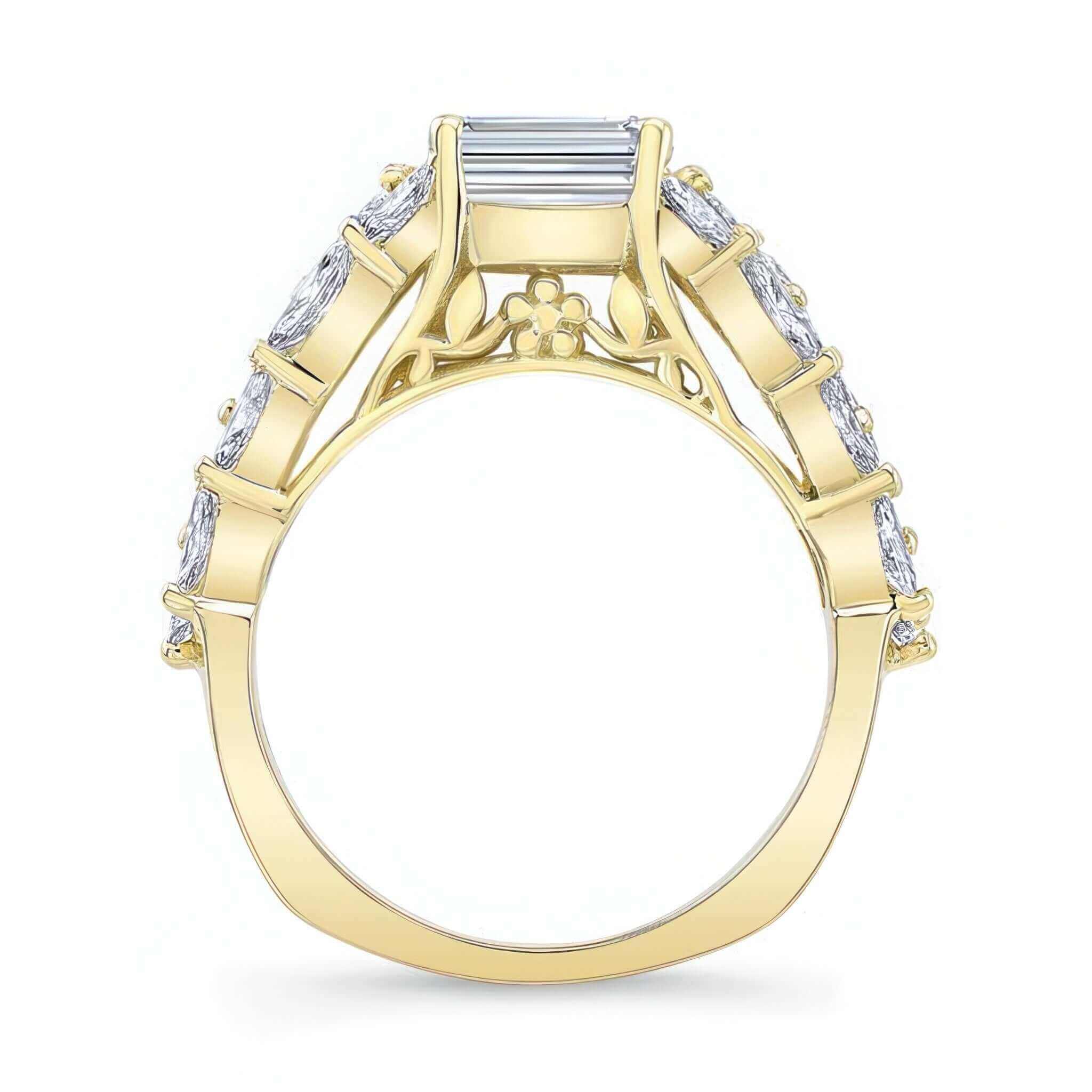 A bold three row diamond emerald cut moissanite ring lined with stunning pave set marquise and princess cut diamonds around the shank. The ring is topped with a shimmering emerald cut center featuring a surprise peekaboo flower design.