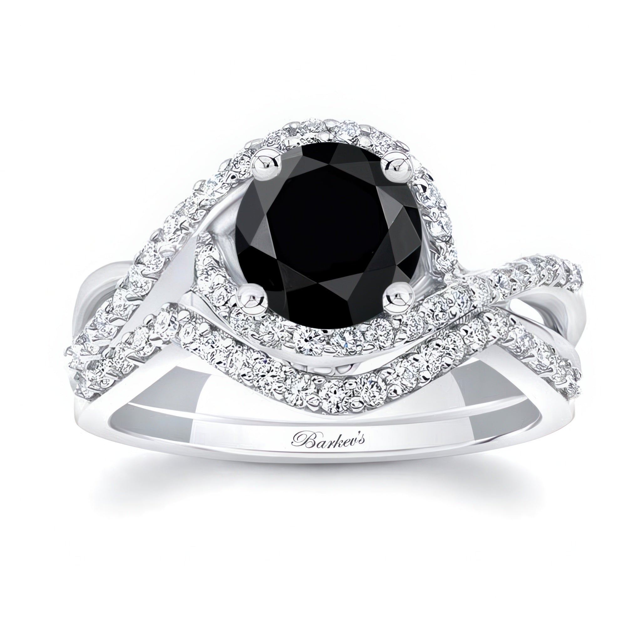 A stunning twisted halo black and white diamond wedding set giving off a classic nature vibe with a round center that is encircled by diamonds that flow down the entwined shoulders and reveal a simple flower pattern on the profile view. A sparkling wedding band snuggly embraces the sides with an elegant curve.