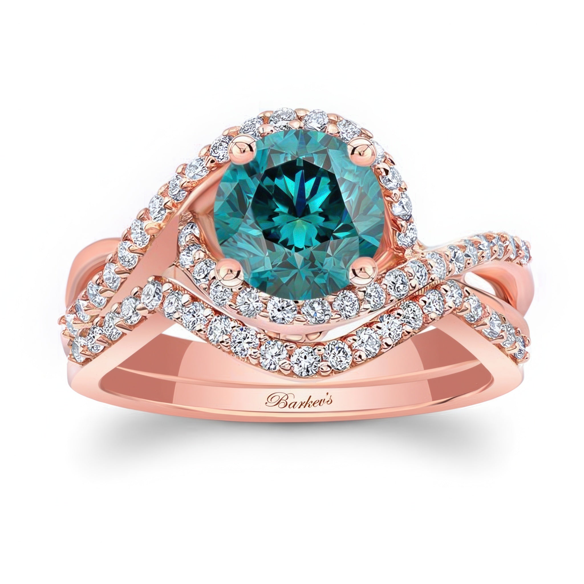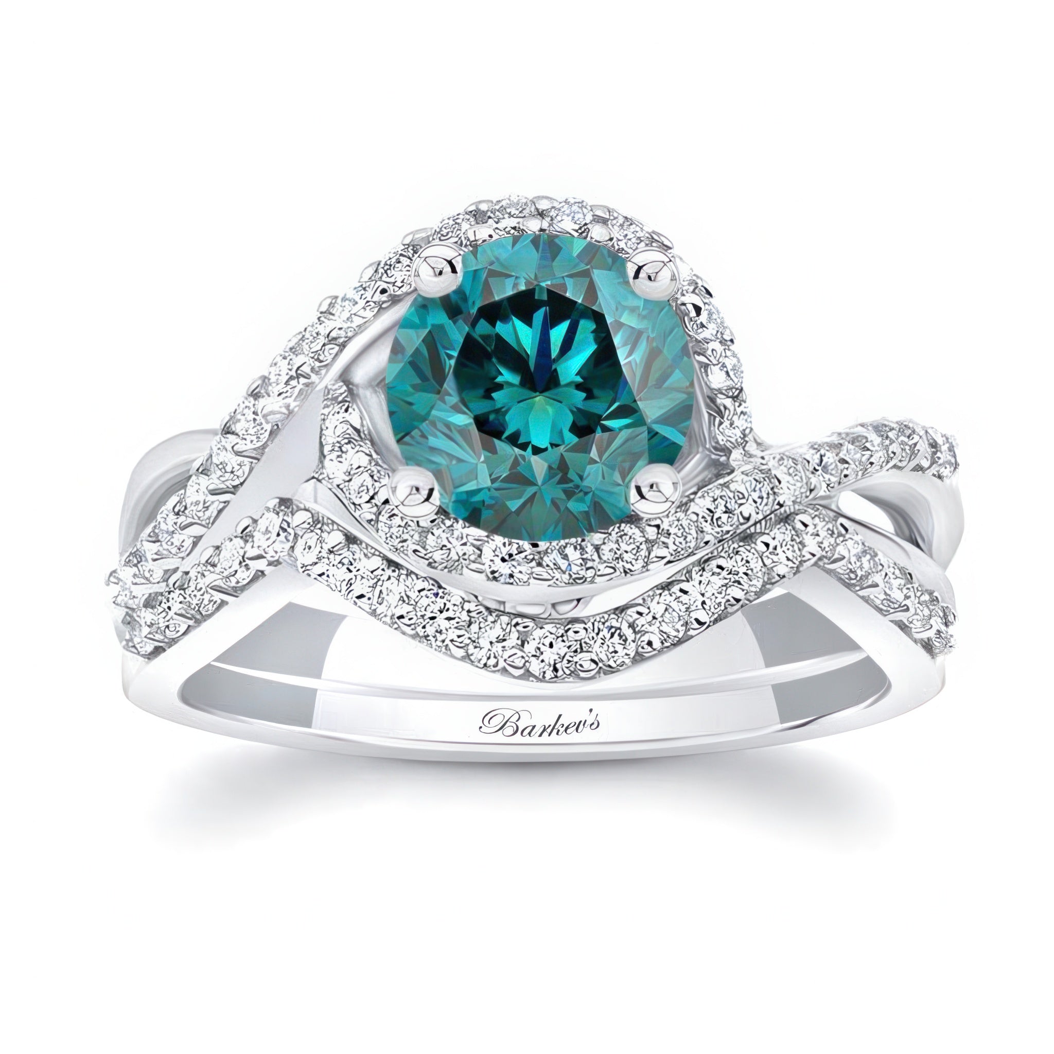 A stunning twisted halo blue and white diamond wedding set giving off a classic nature vibe with a round center that is encircled by diamonds that flow down the entwined shoulders and reveal a simple flower pattern on the profile view. A sparkling wedding band snuggly embraces the sides with an elegant curve.