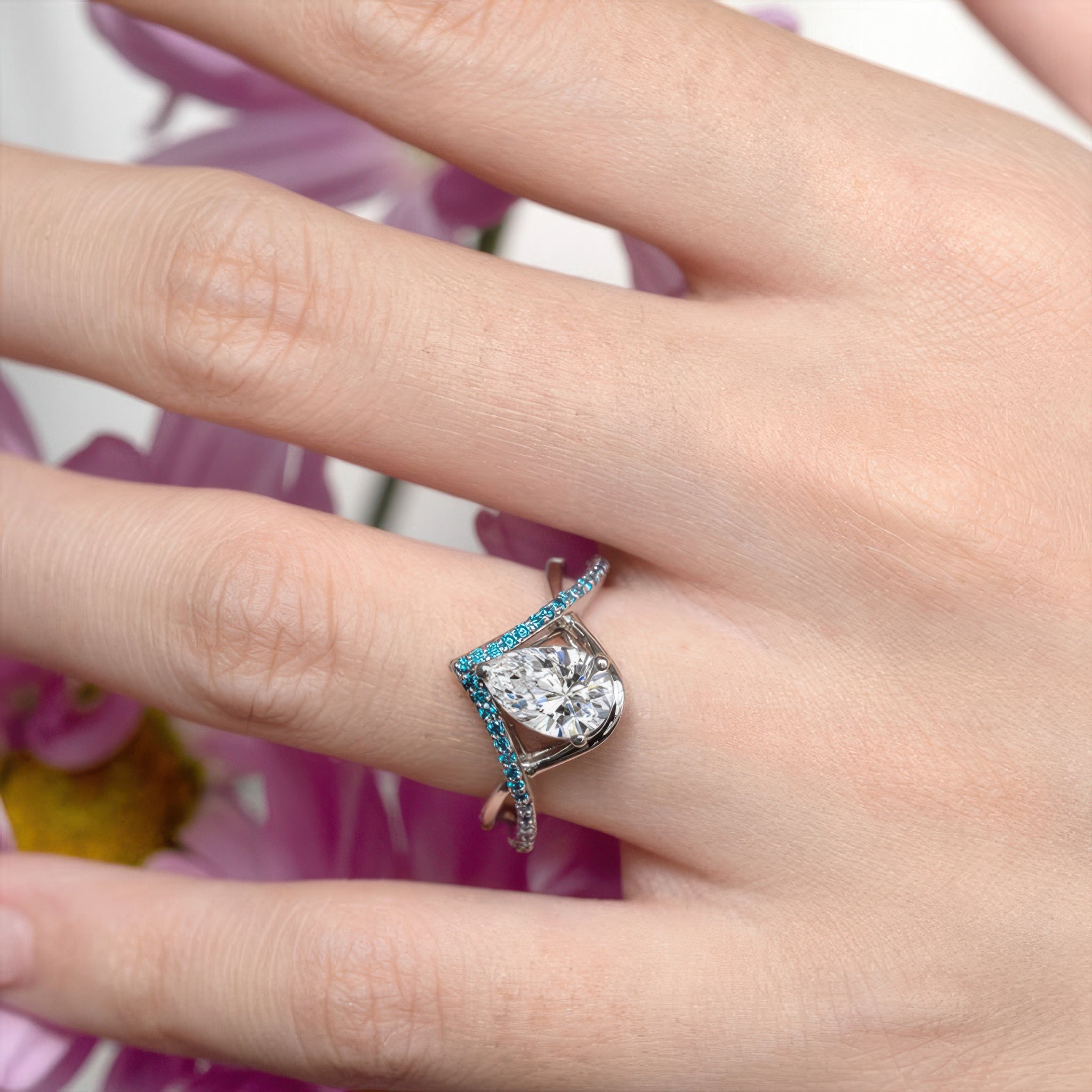 Celebrate elegance with a twist in the Unique Pear Shaped Lab Blue Sapphire Ring. Featuring a lab-grown pear-shaped blue sapphire, this ring dazzles with its rich, deep tones and 43 sparkling white diamond accents set along the twisted band for extra brilliance.