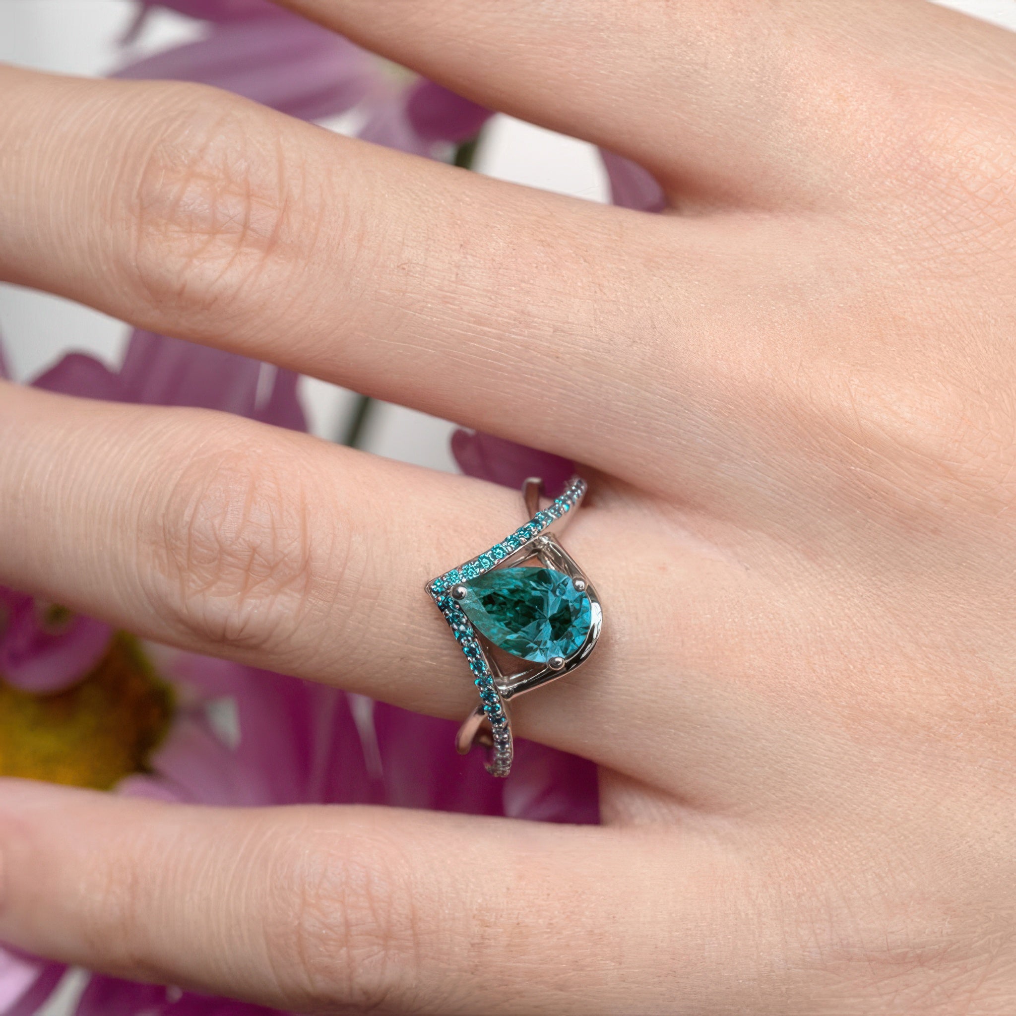 Dive into the depths of sophistication with the Unique Pear Shaped Blue Diamond Ring — a dazzling fusion of timeless elegance and rare beauty. The pear-shaped blue diamond steals the spotlight with its mesmerizing oceanic hues, while round white diamond accents sparkle along the twisted shank, adding radiant contrast and luxury.