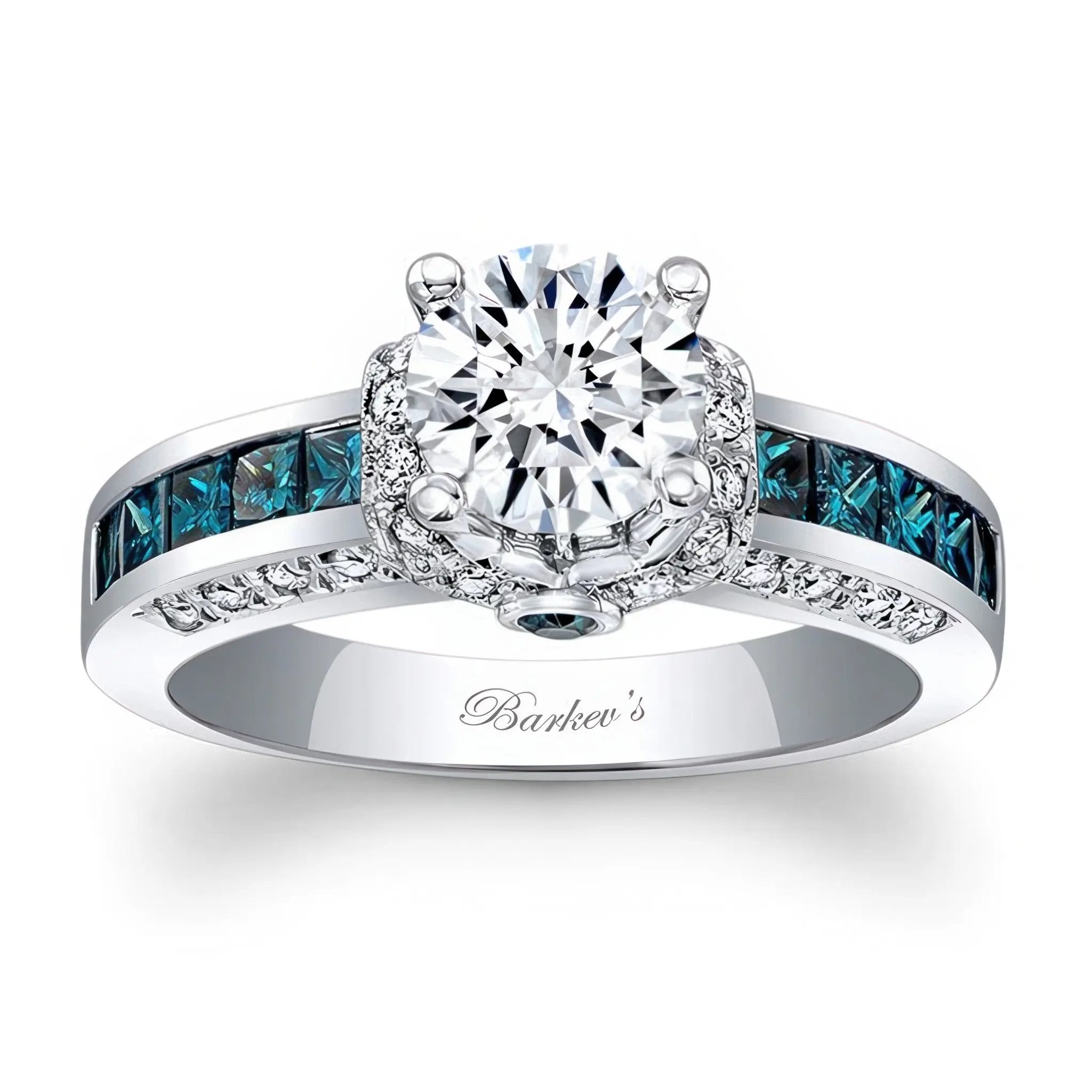 This unique vintage blue diamond accent moissanite ring features a round prong set center with channel set princess cut blue diamonds along with bezel set round blue diamonds visible from the profile view and pave set diamonds to complete the stunning look.