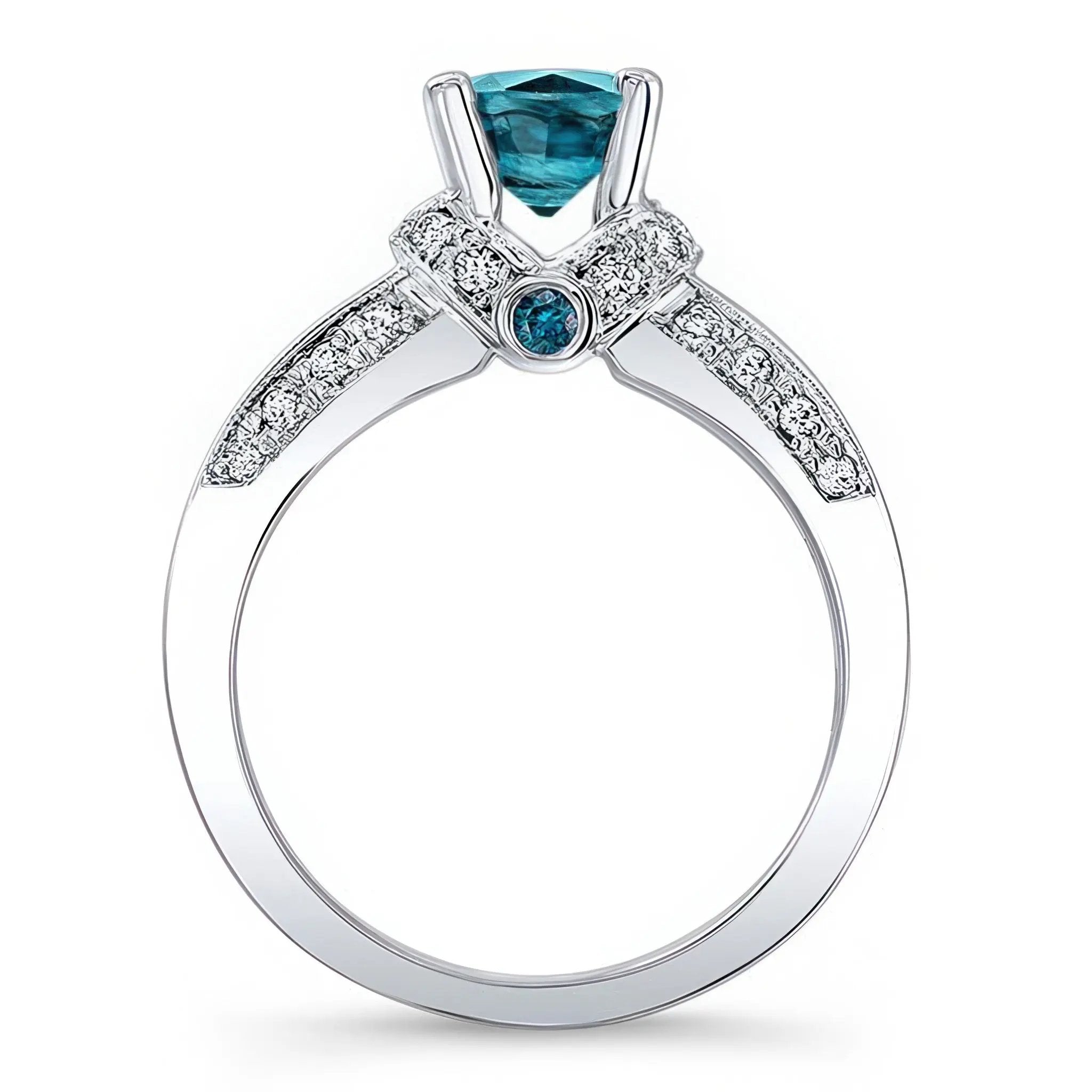 This unique vintage blue diamond ring features a round prong set center with channel set princess cut blue diamonds along with bezel set round blue diamonds visible from the profile view and pave set diamonds to complete the stunning look.