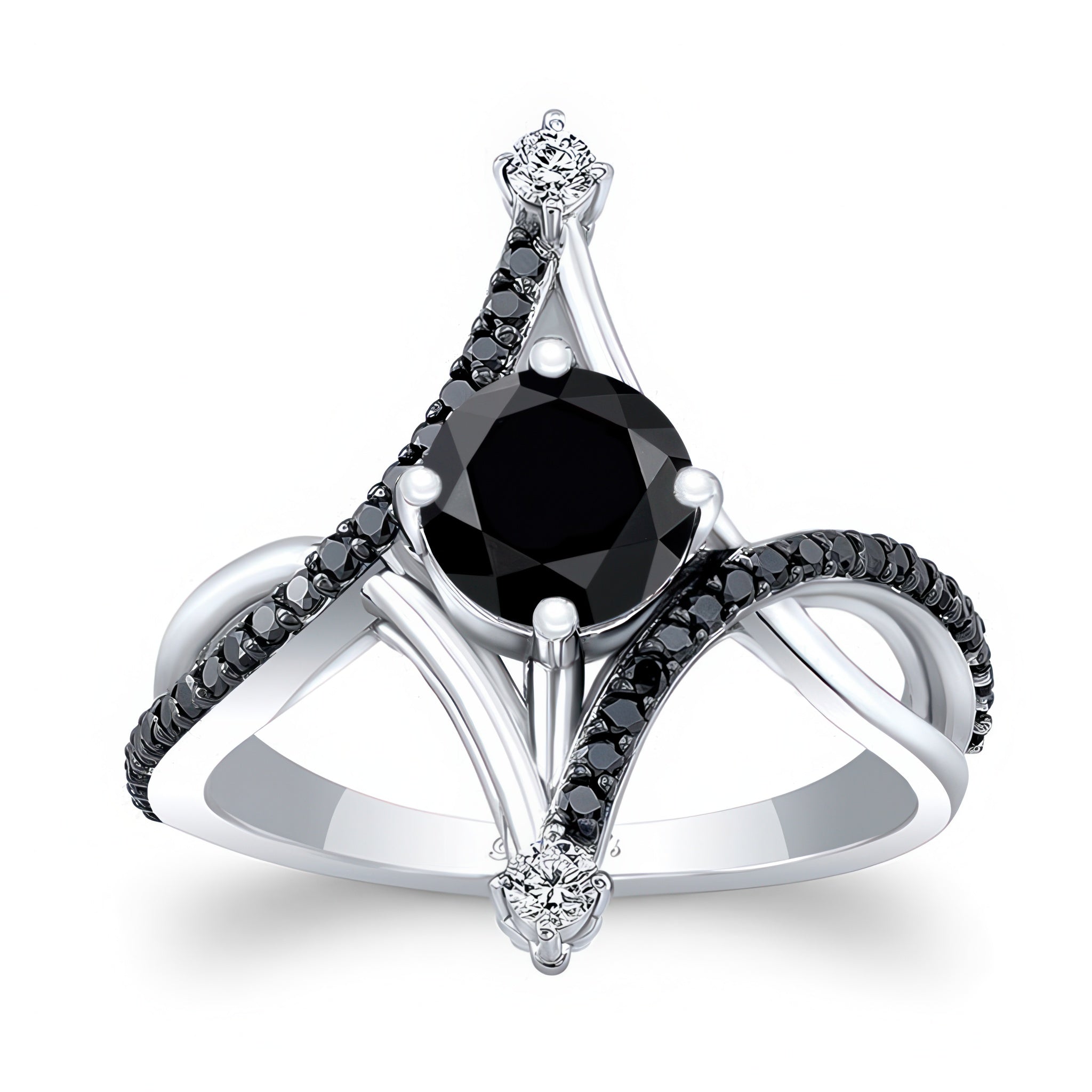 An unusual round black diamond ring with it's center glorified by two smaller diamonds set at 12 and 6 o'clock while elegant black diamond swirls decorate the sides for a dazzling look.