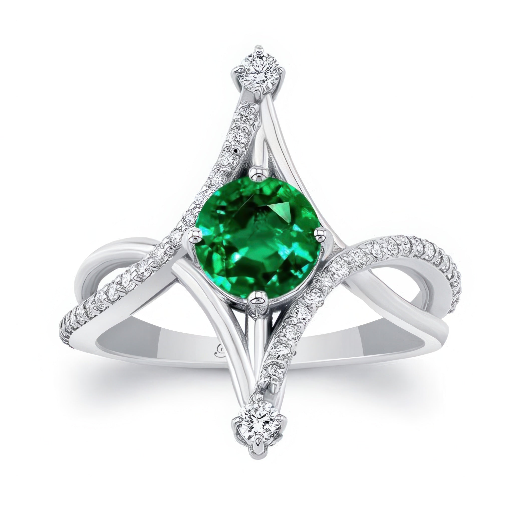An unusual round emerald and diamond ring with it's center glorified by two smaller diamonds set at 12 and 6 o'clock while elegant diamond swirls decorate the sides for a dazzling look.