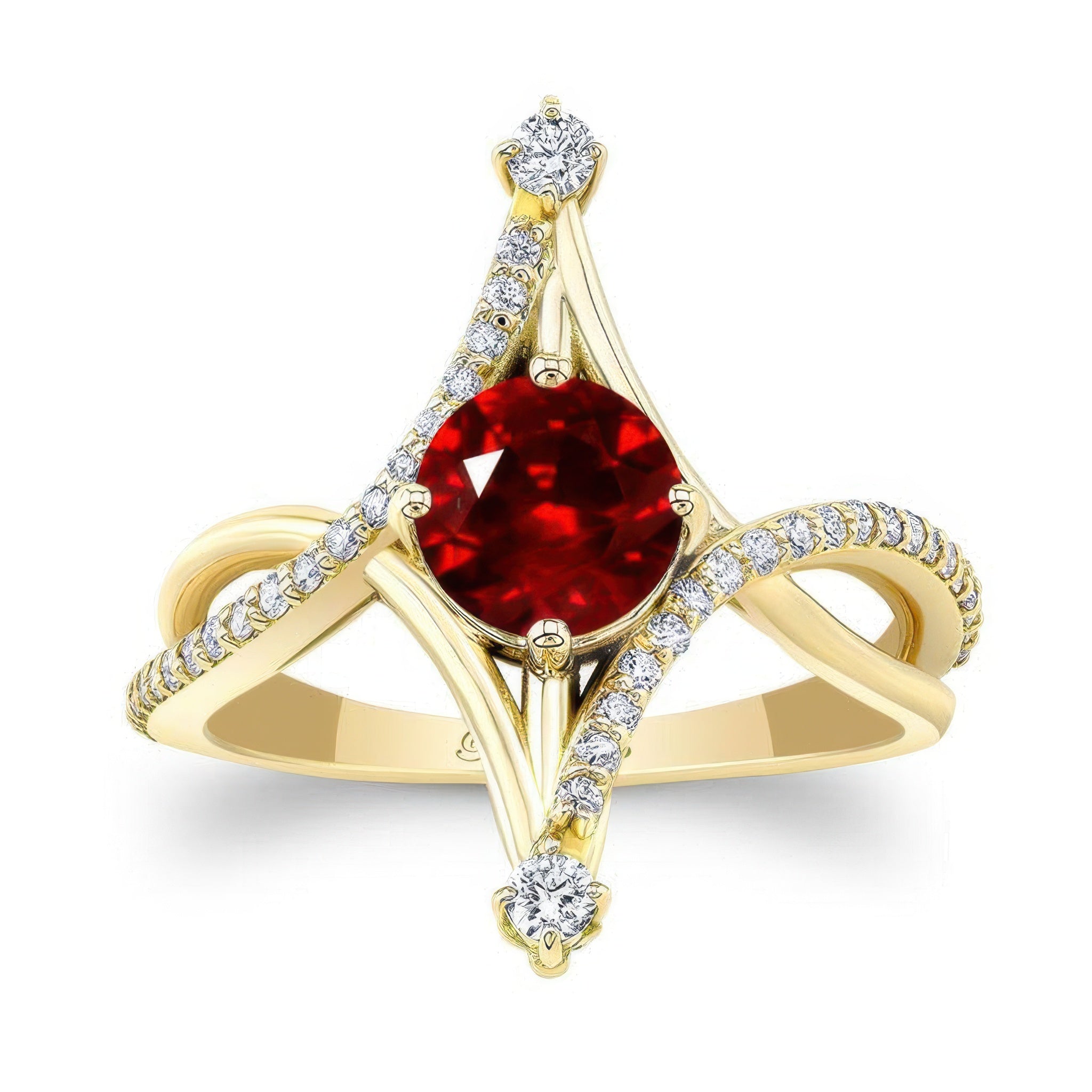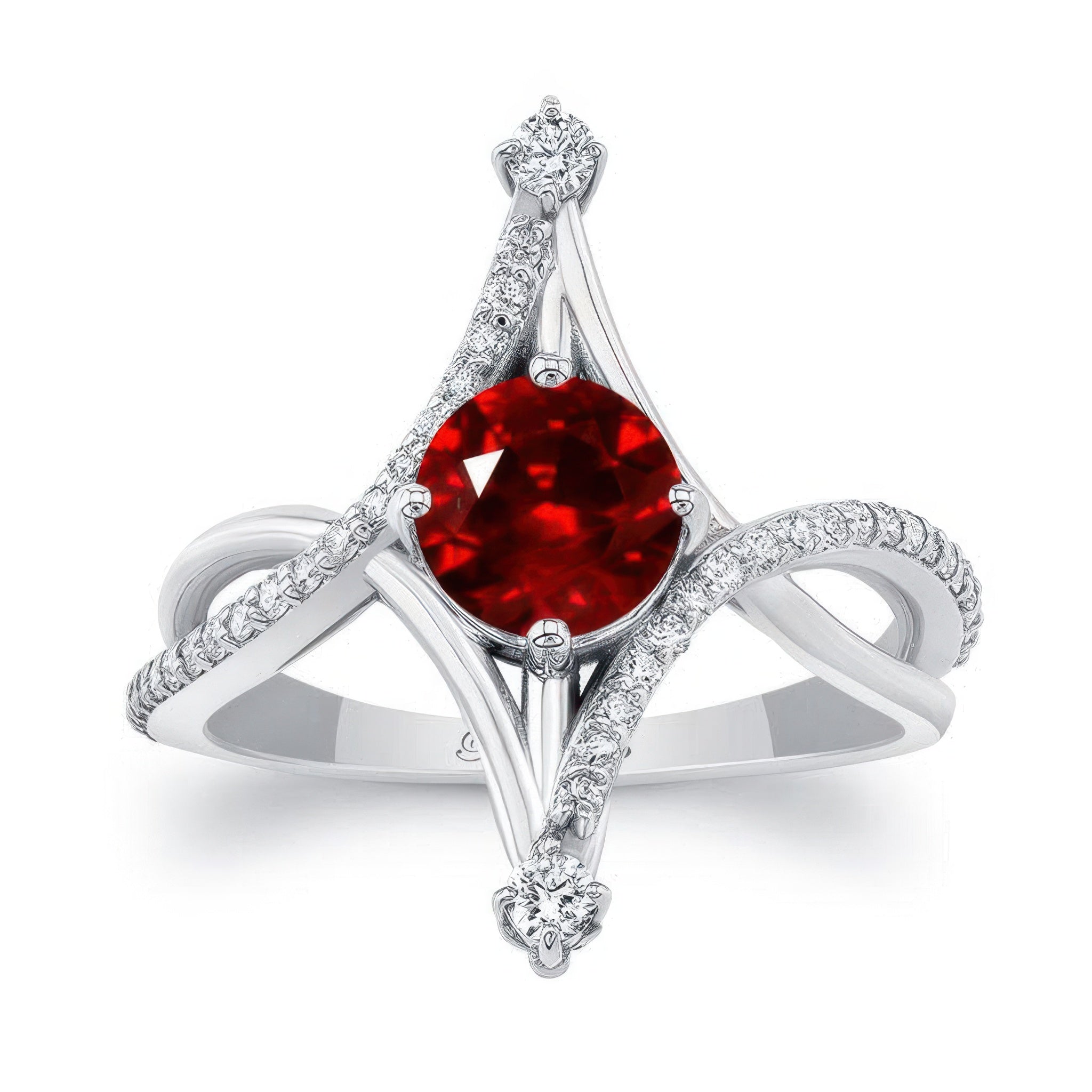 An unusual round lab grown ruby and diamond ring with it's center glorified by two smaller diamonds set at 12 and 6 o'clock while elegant diamond swirls decorate the sides for a dazzling look.