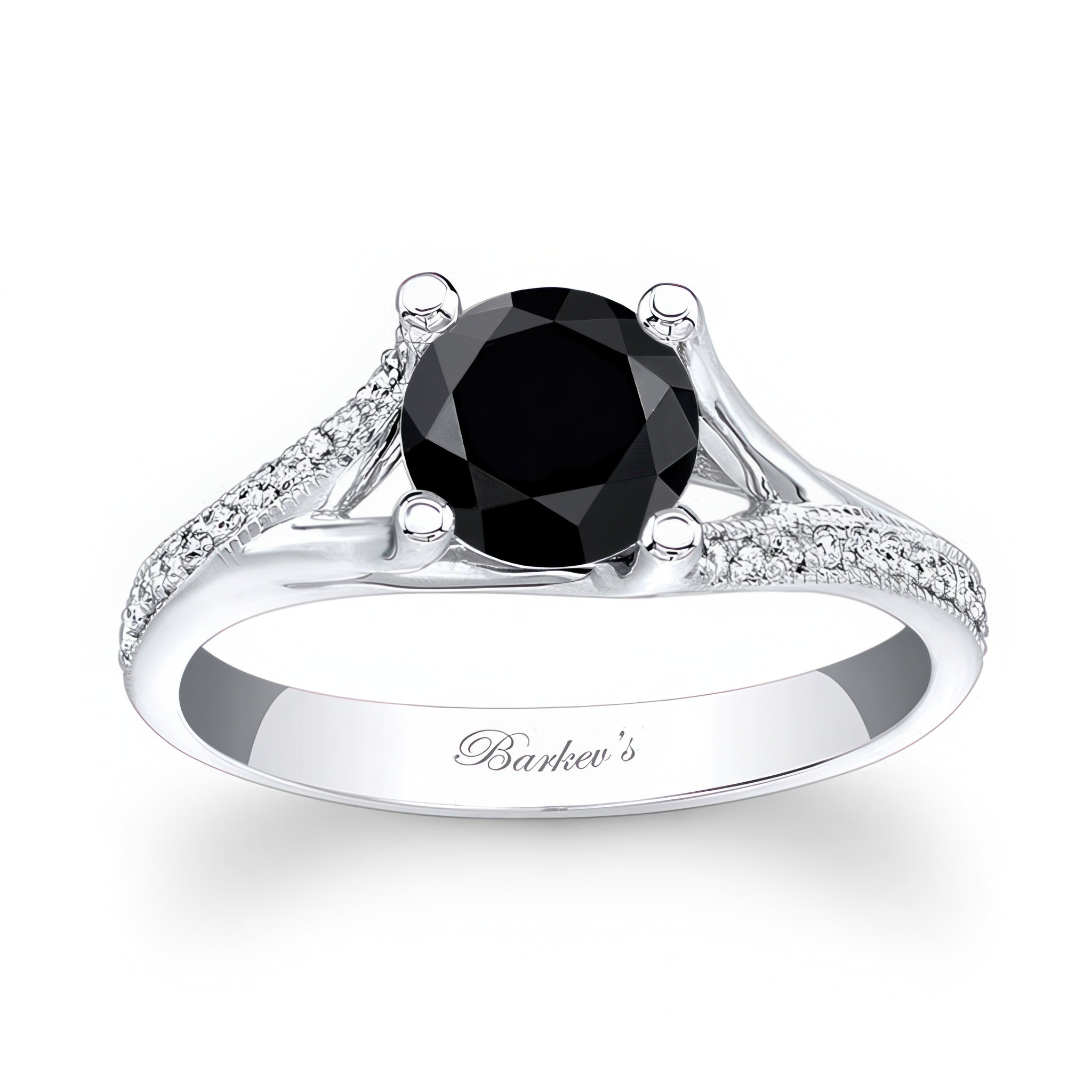 This classic v shaped black and white diamond engagement ring creates a soft feminine look with traditional styling. A split shank rises to the prong set round center while pave set diamonds grace opposing shoulders.