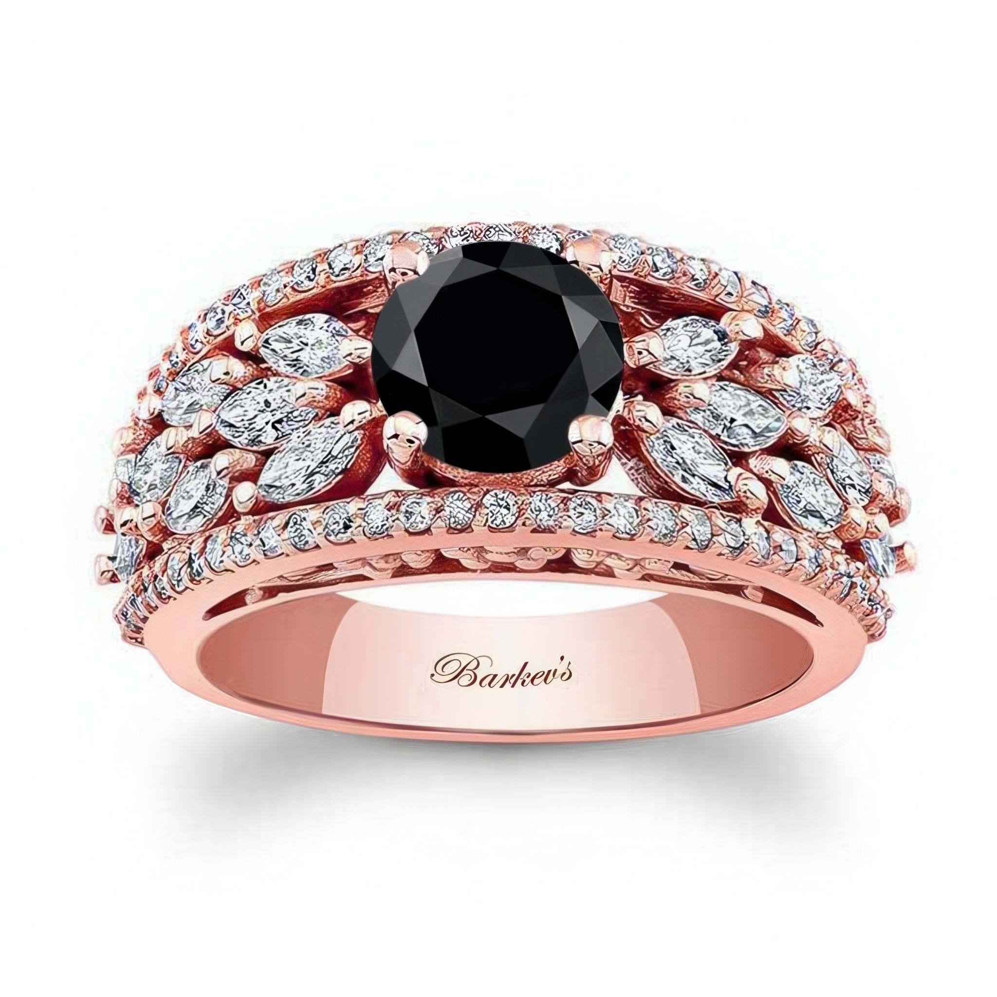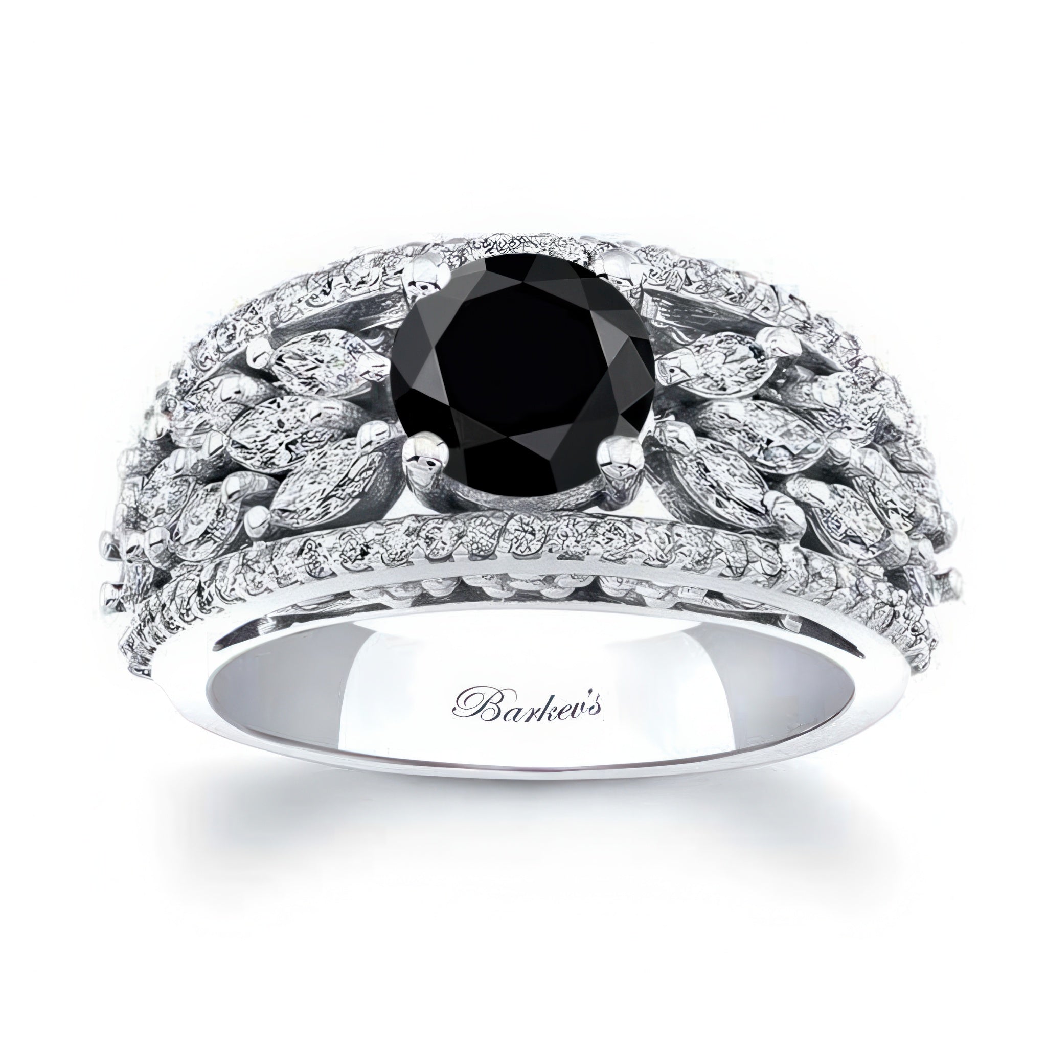 This vintage black and white diamond cluster ring features a prong set round center with a spray of marquise diamonds artfully cascading down the sides and a ridge of shared prong set diamonds on the shoulders for an elegant touch of glamour.