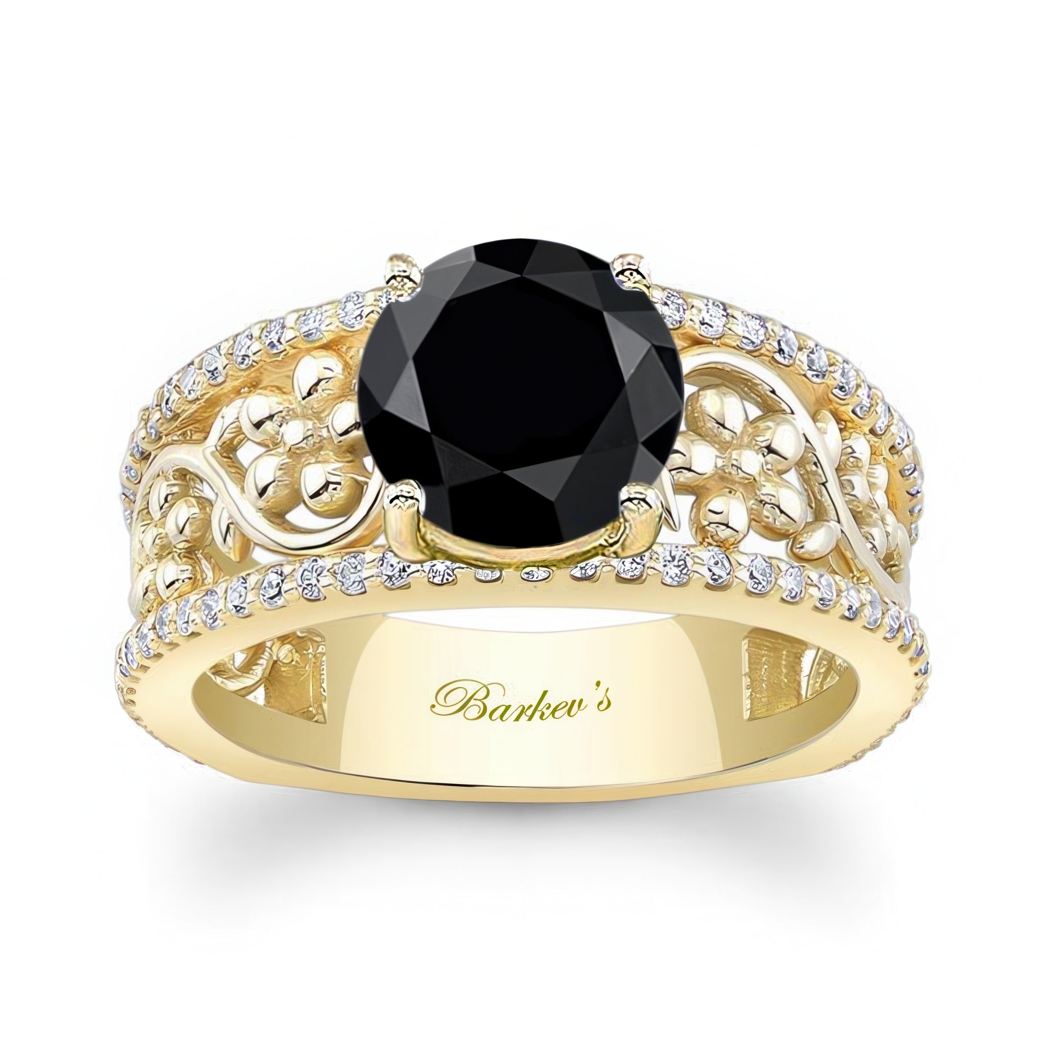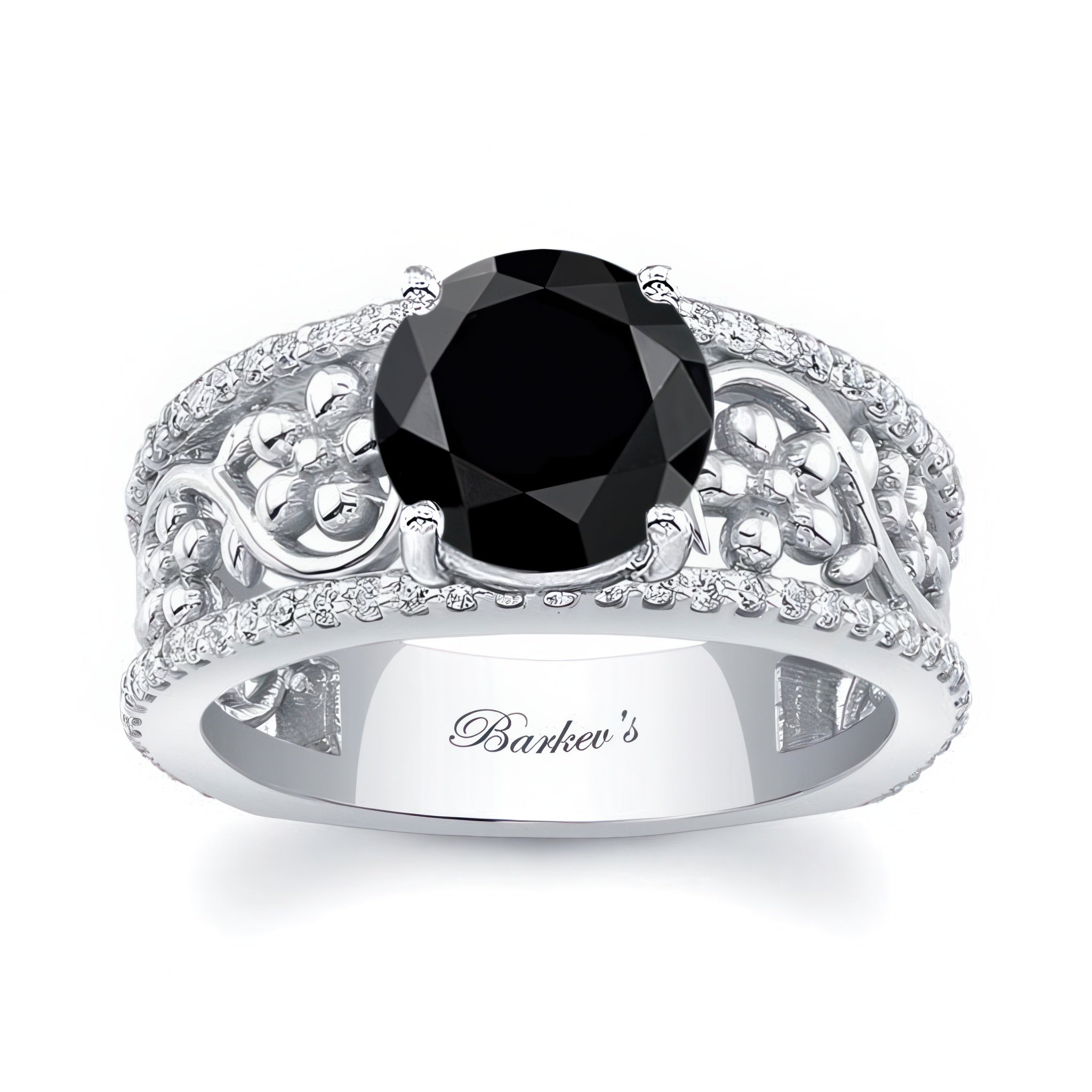 This vintage floral 3 carat black and white diamond engagement ring features a prong set round center with shared prong set diamonds on the outside ridges and an intricate flower and vine pattern in the middle for an elegant wide band look.