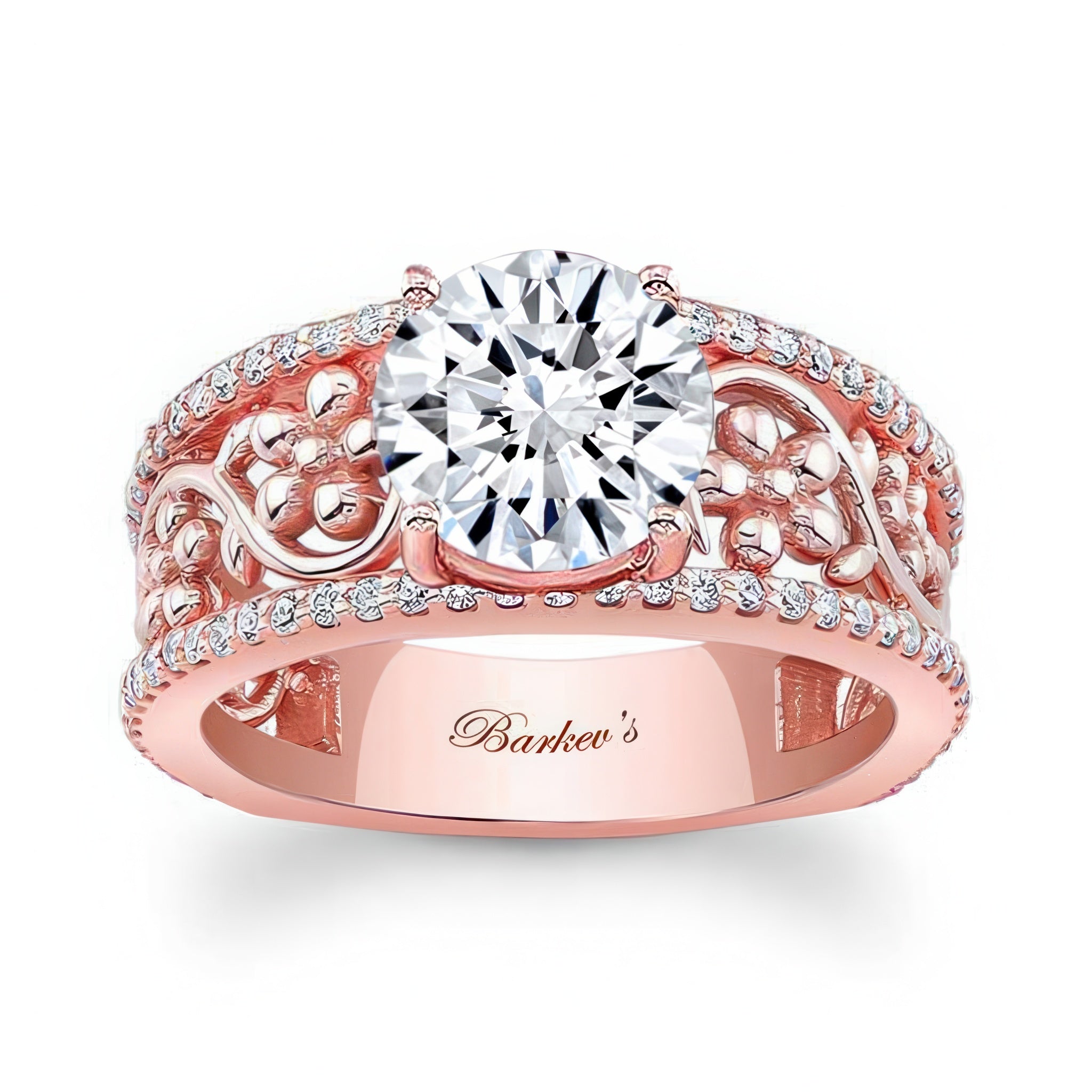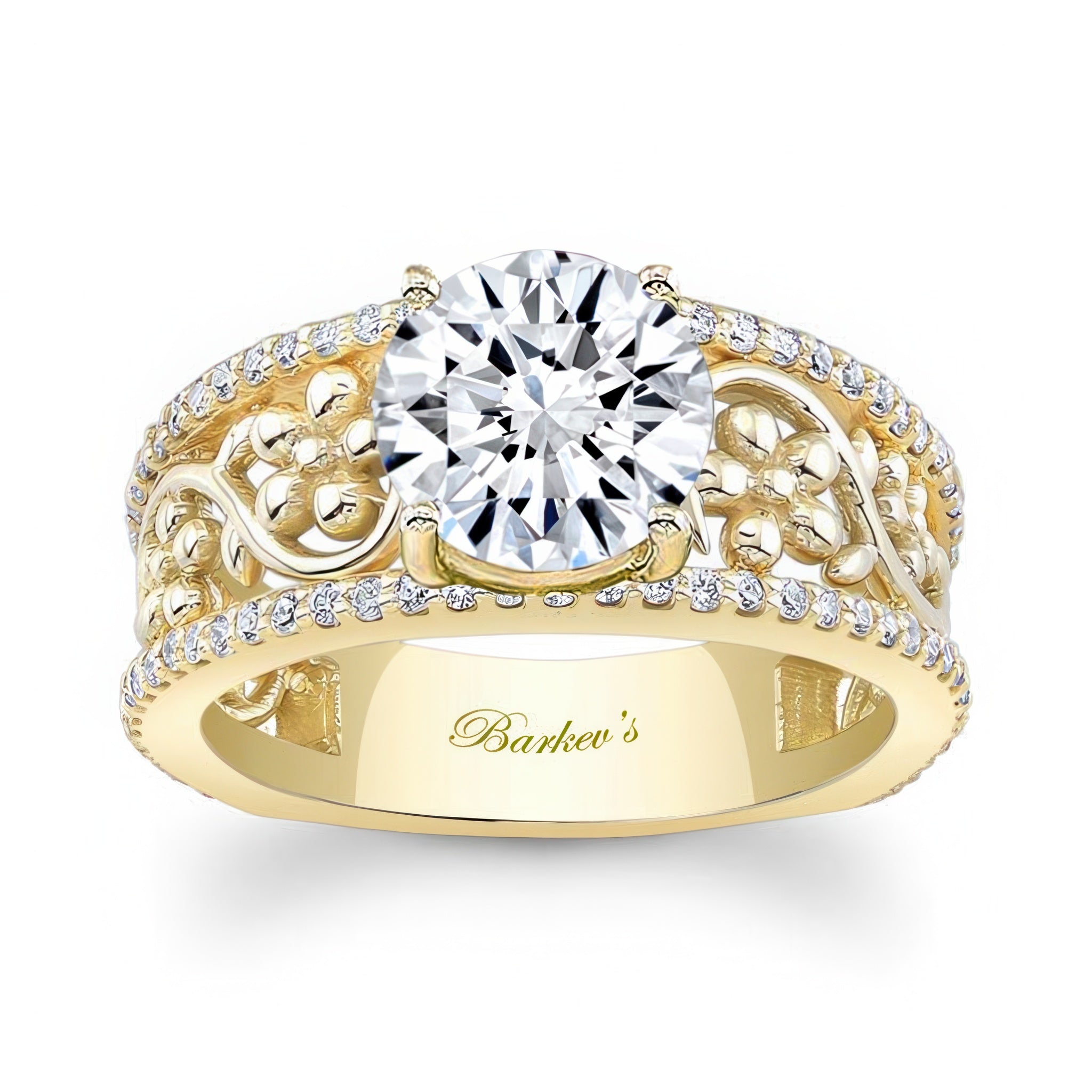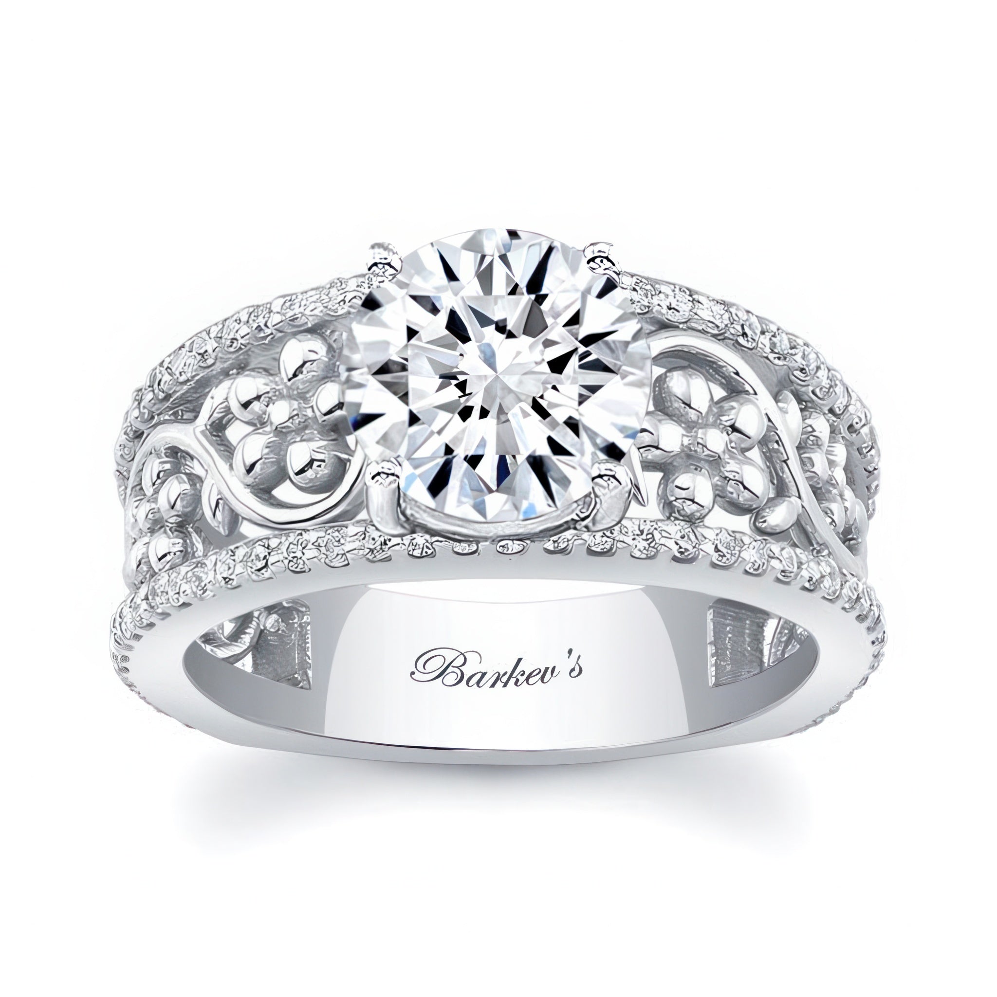This vintage floral 3 carat moissanite engagement ring features a prong set round center with shared prong set diamonds on the outside ridges and an intricate flower and vine pattern in the middle for an elegant wide band look.