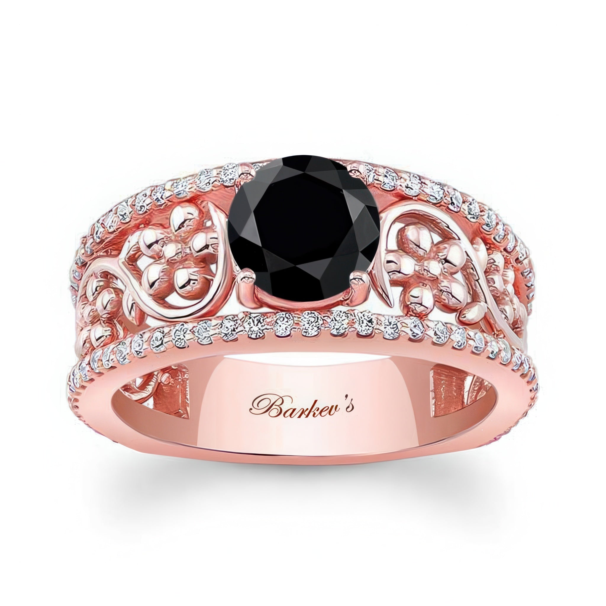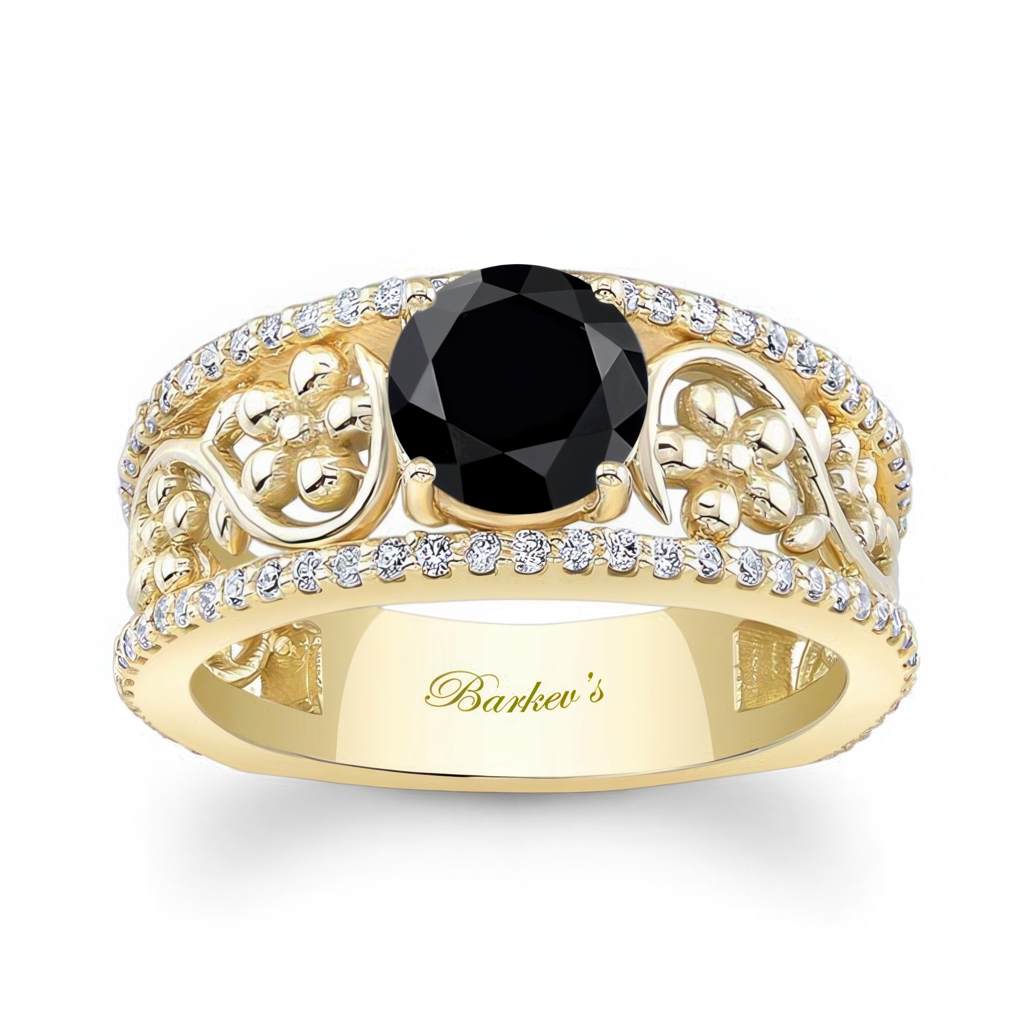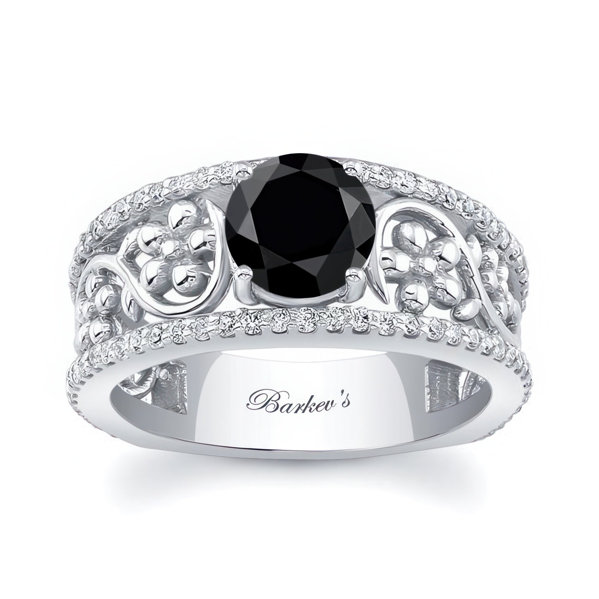 This vintage floral black and white diamond engagement ring features a prong set round center with shared prong set diamonds on the outside ridges and an intricate flower and vine pattern in the middle for an elegant wide band look.