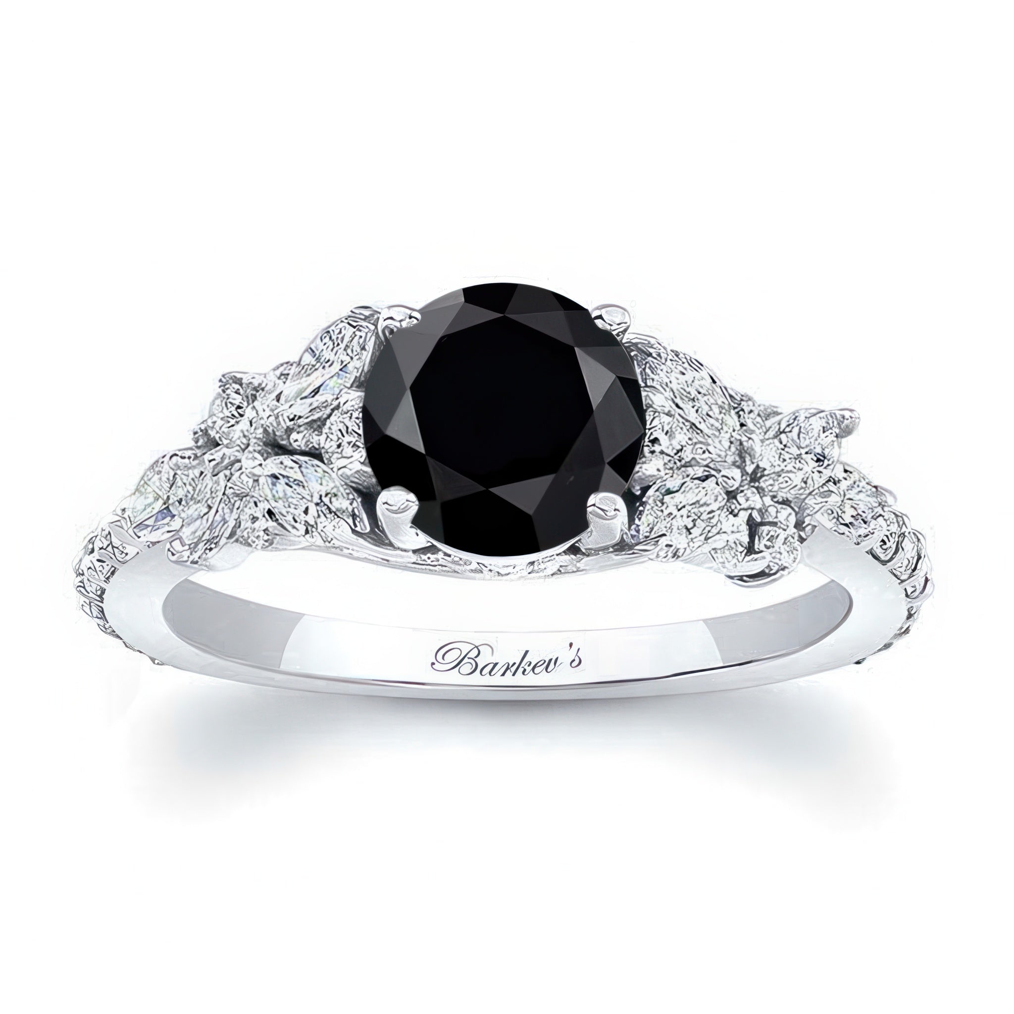 An exquisite vintage marquise black and white diamond engagement ring featuring a prong set round center and cathedral shoulders artfully adorned with marquise and round diamonds.