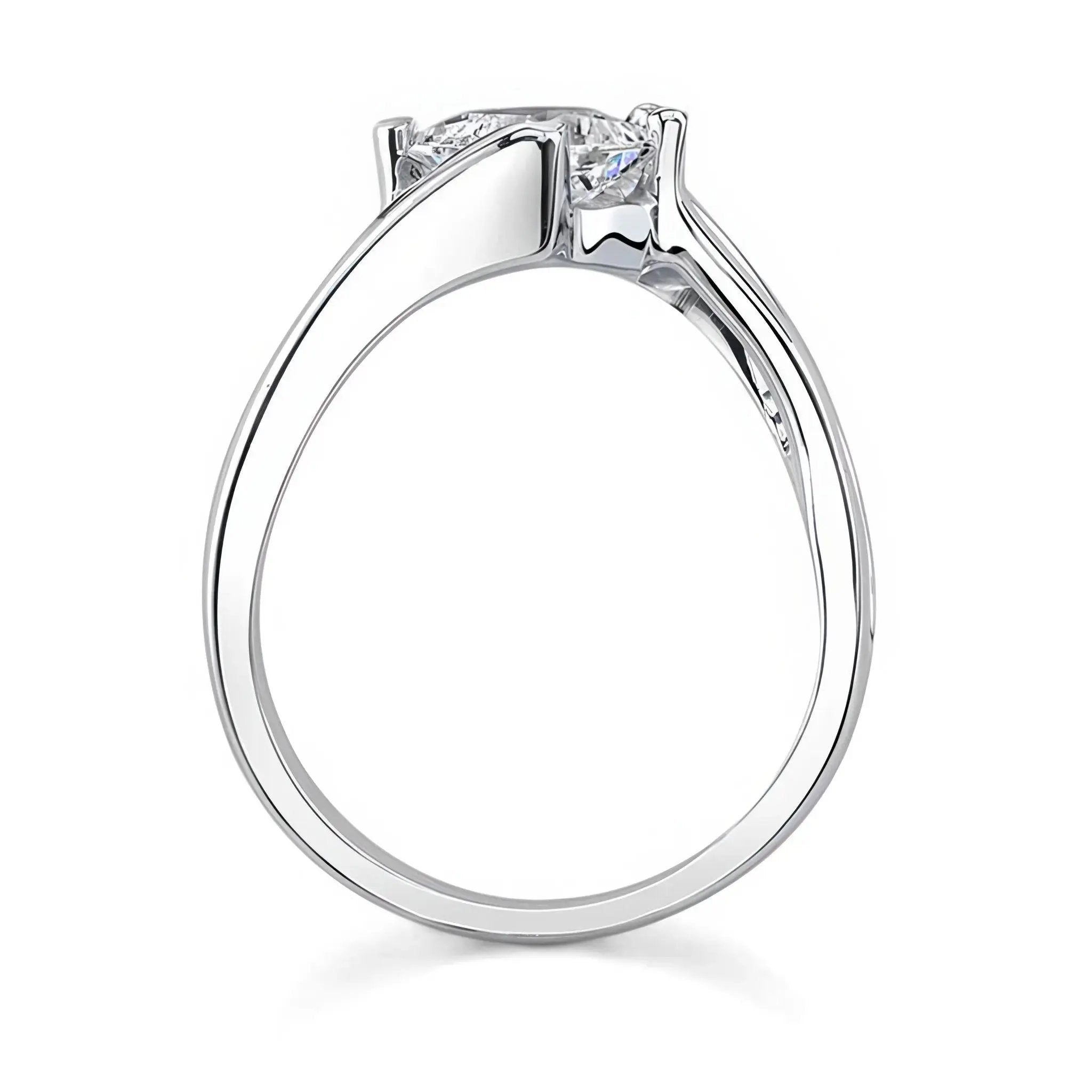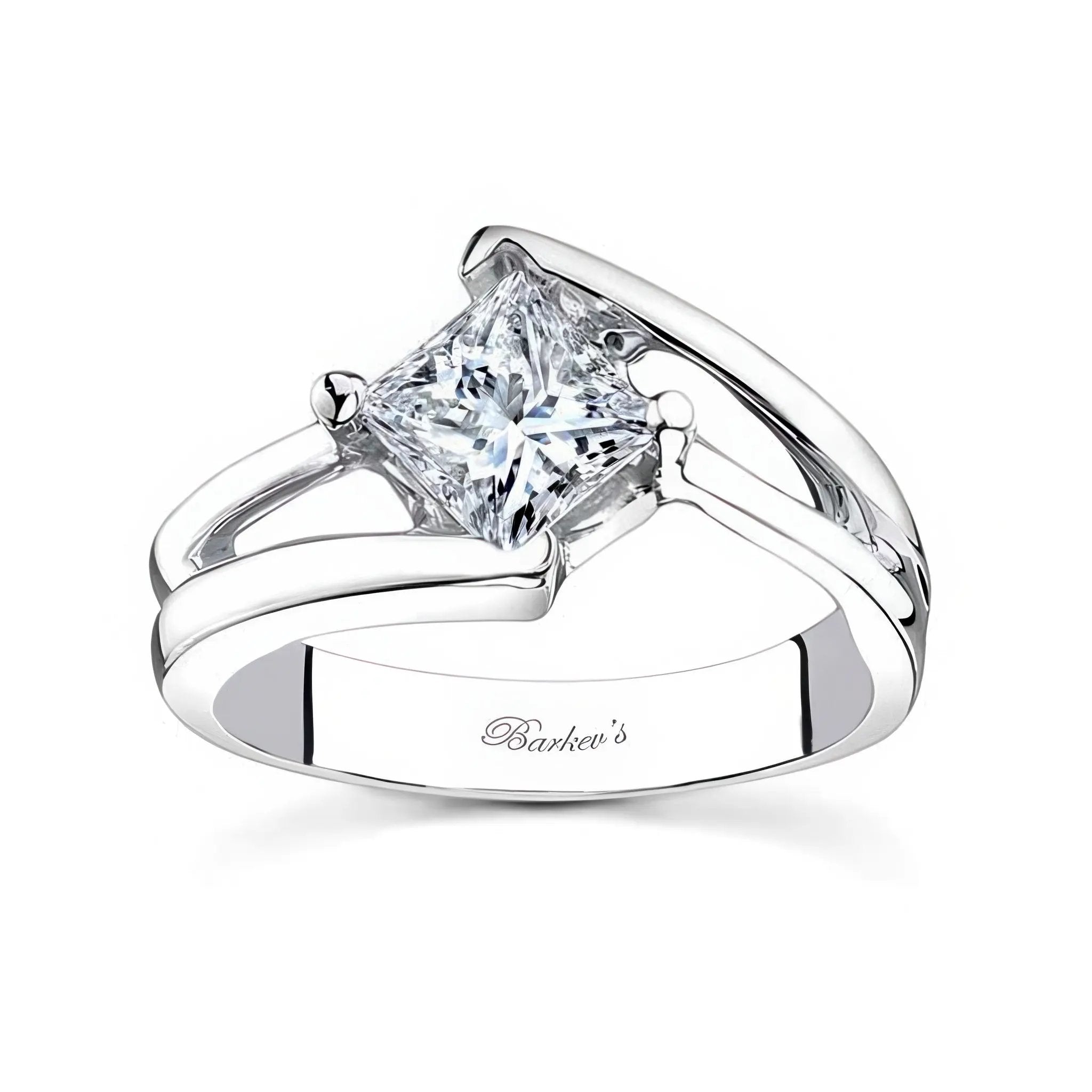 This half "v" prong princess cut solitaire ring features a half prong half v shaped prong set princess cut center with a split shank for a unique look.