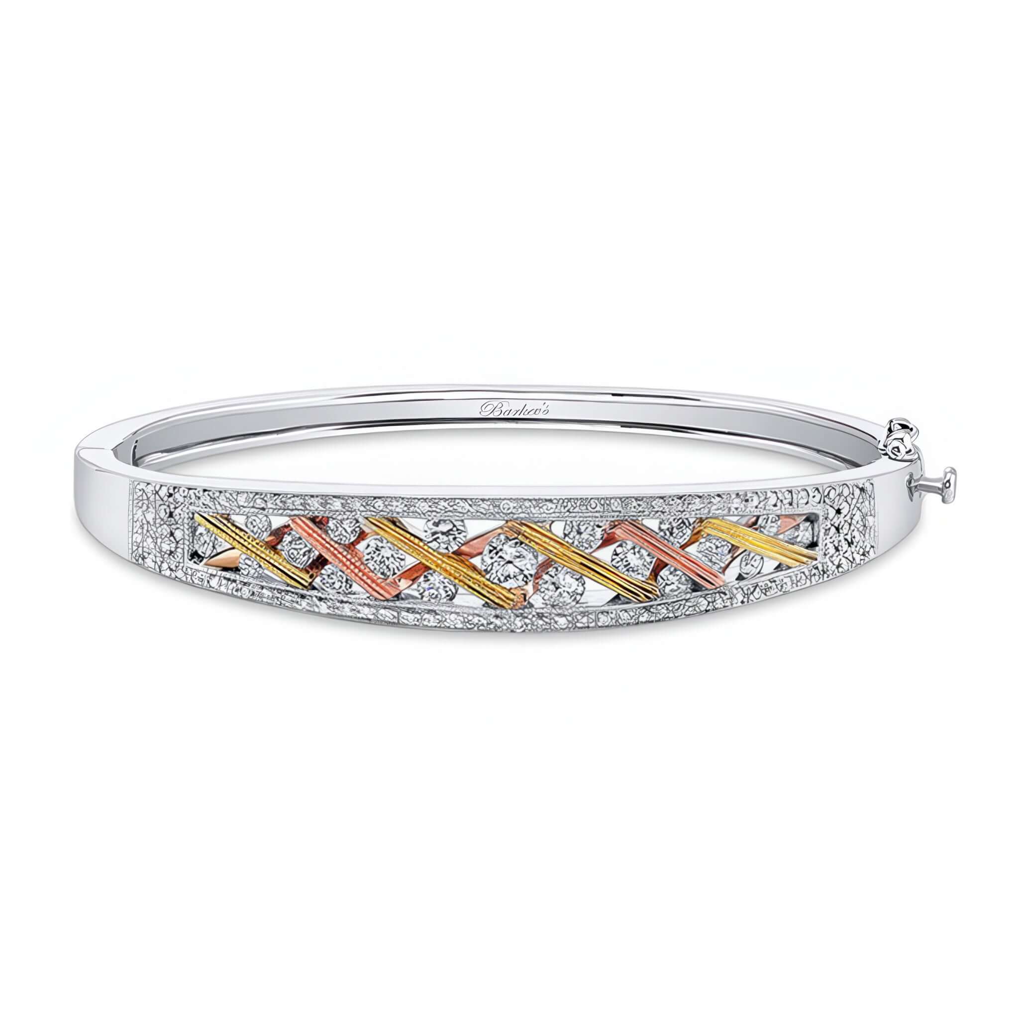 This unique diamond bangle bracelet features a white gold shank channel set with diamonds in criss crossing rose and yellow gold bars while pave set diamonds adorn the outside ridges for an elegant finishing touch.
