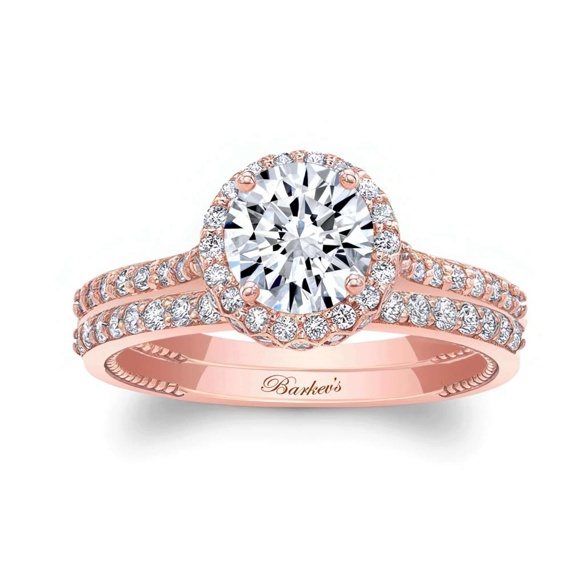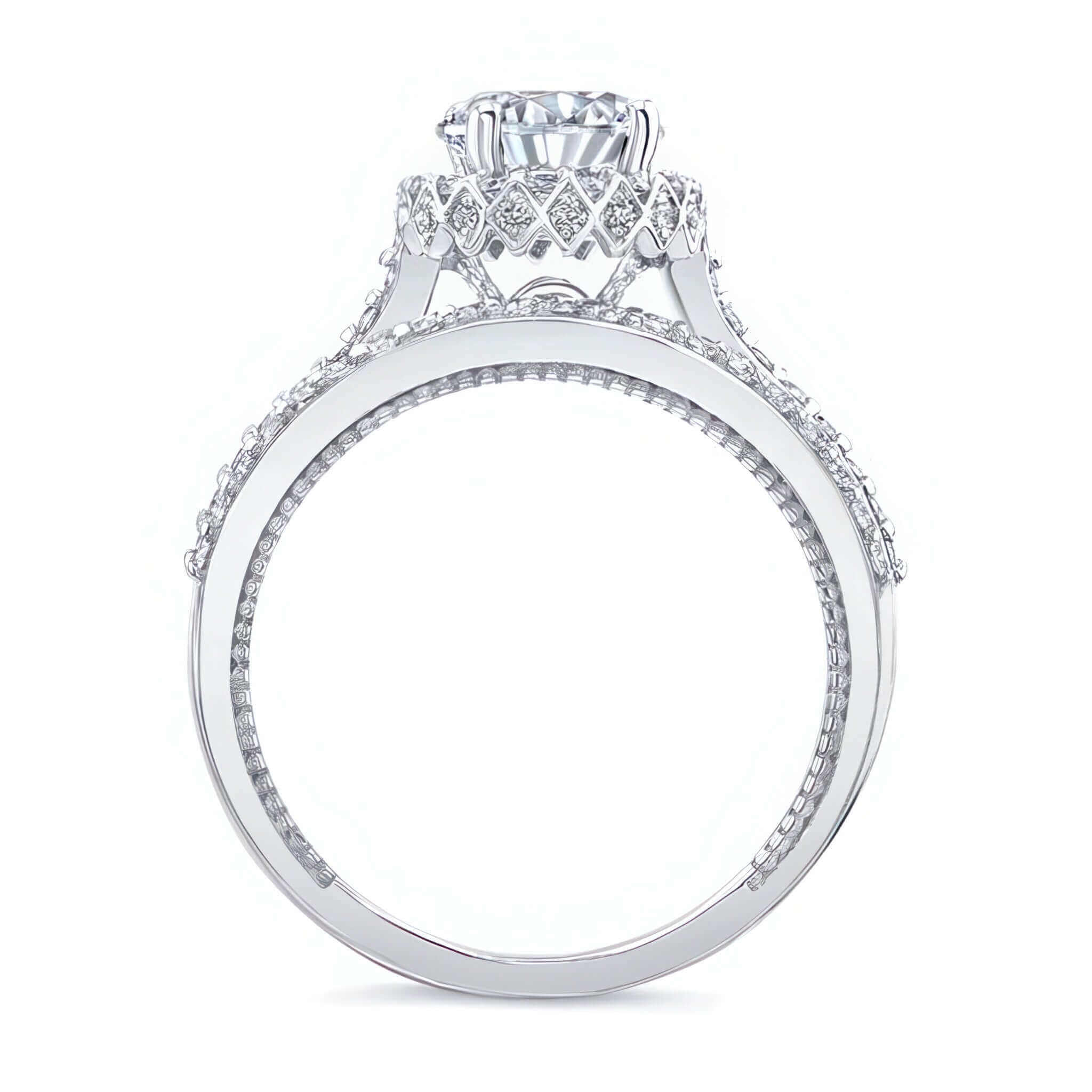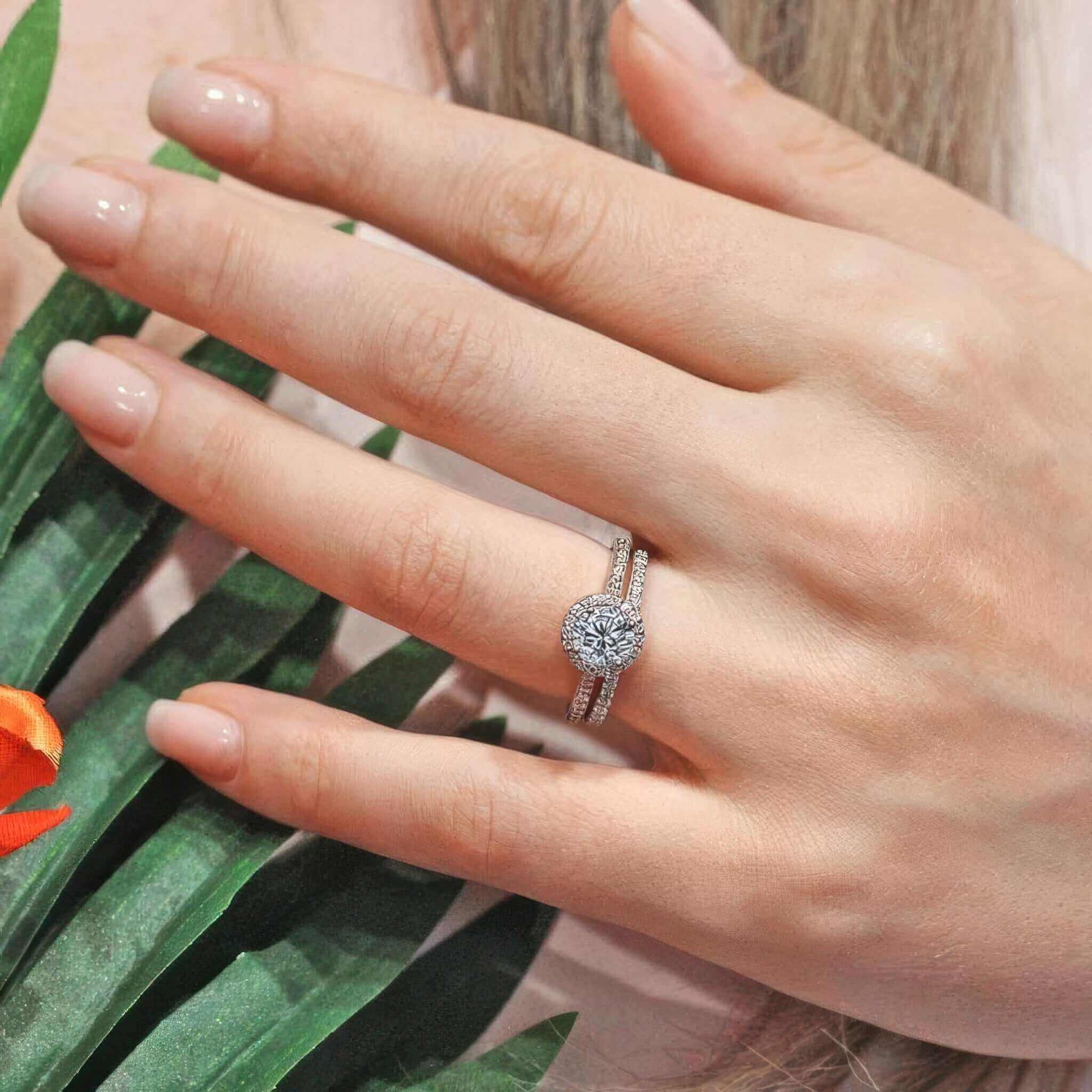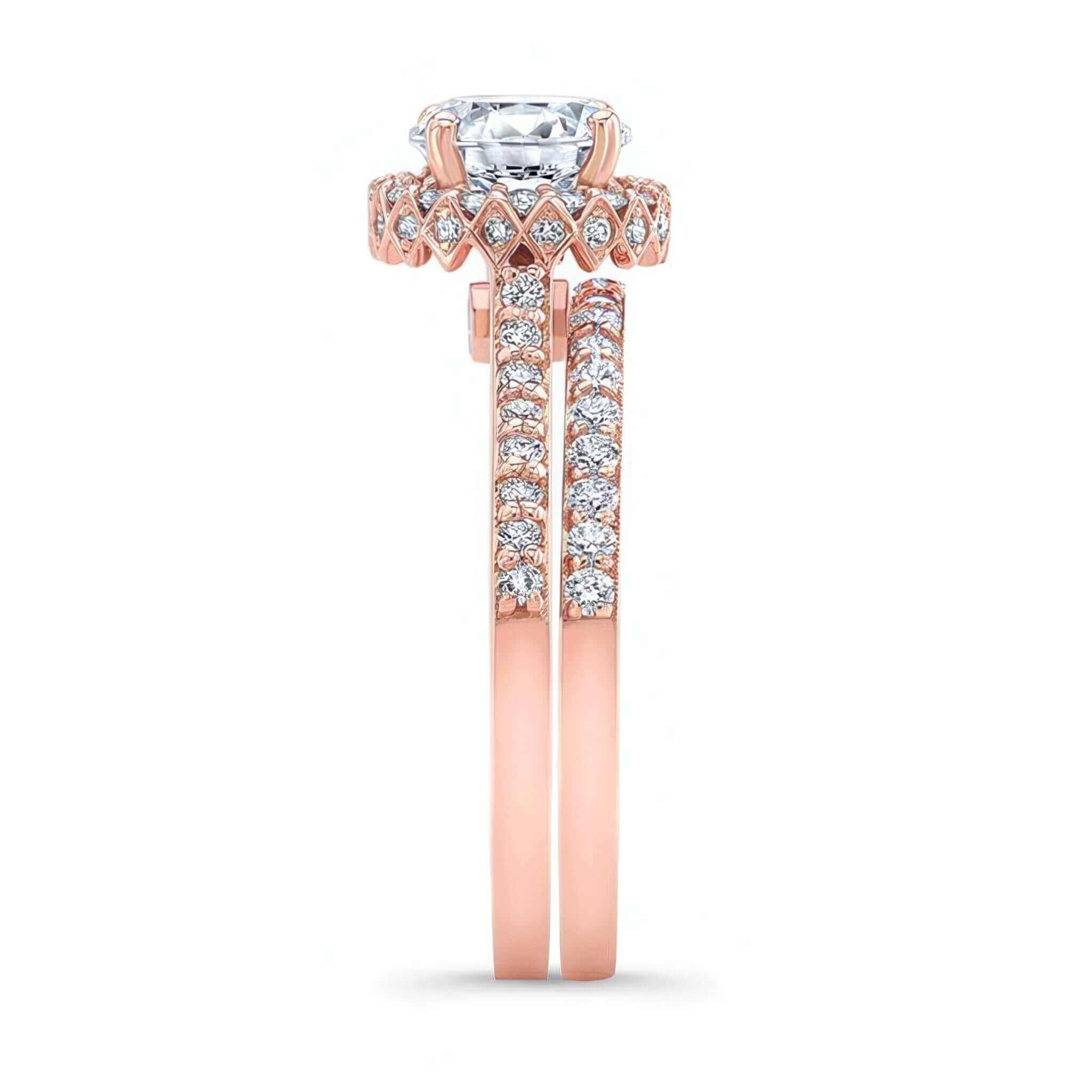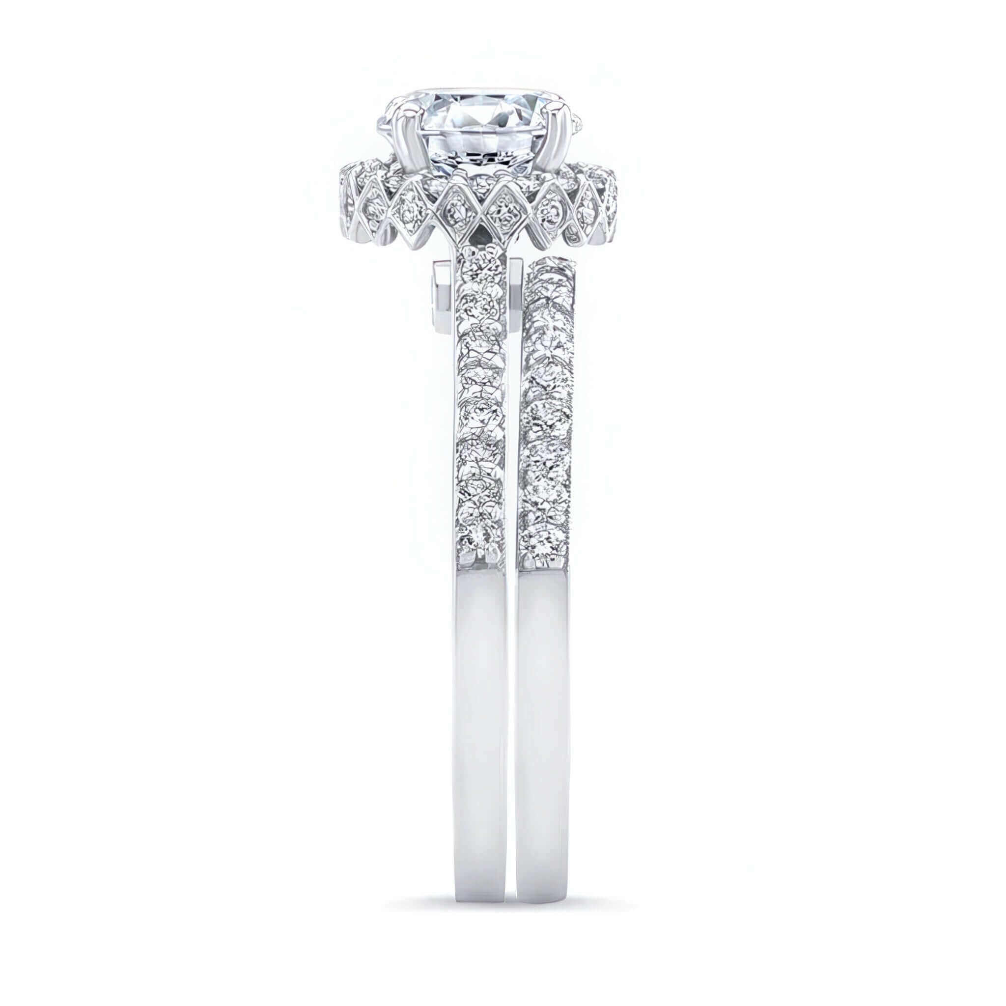An exquisite round halo diamond wedding set with a center surrounded by shared prong diamonds that continue down the shoulders. The profile view reveals a second hidden halo around the sides and two larger bezel set diamonds sitting just beneath the center. A matching wedding band sits up closely on the side to emphasize the design.