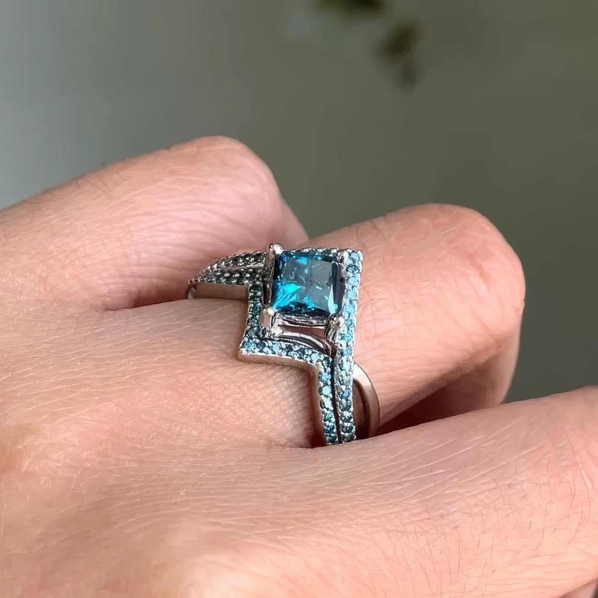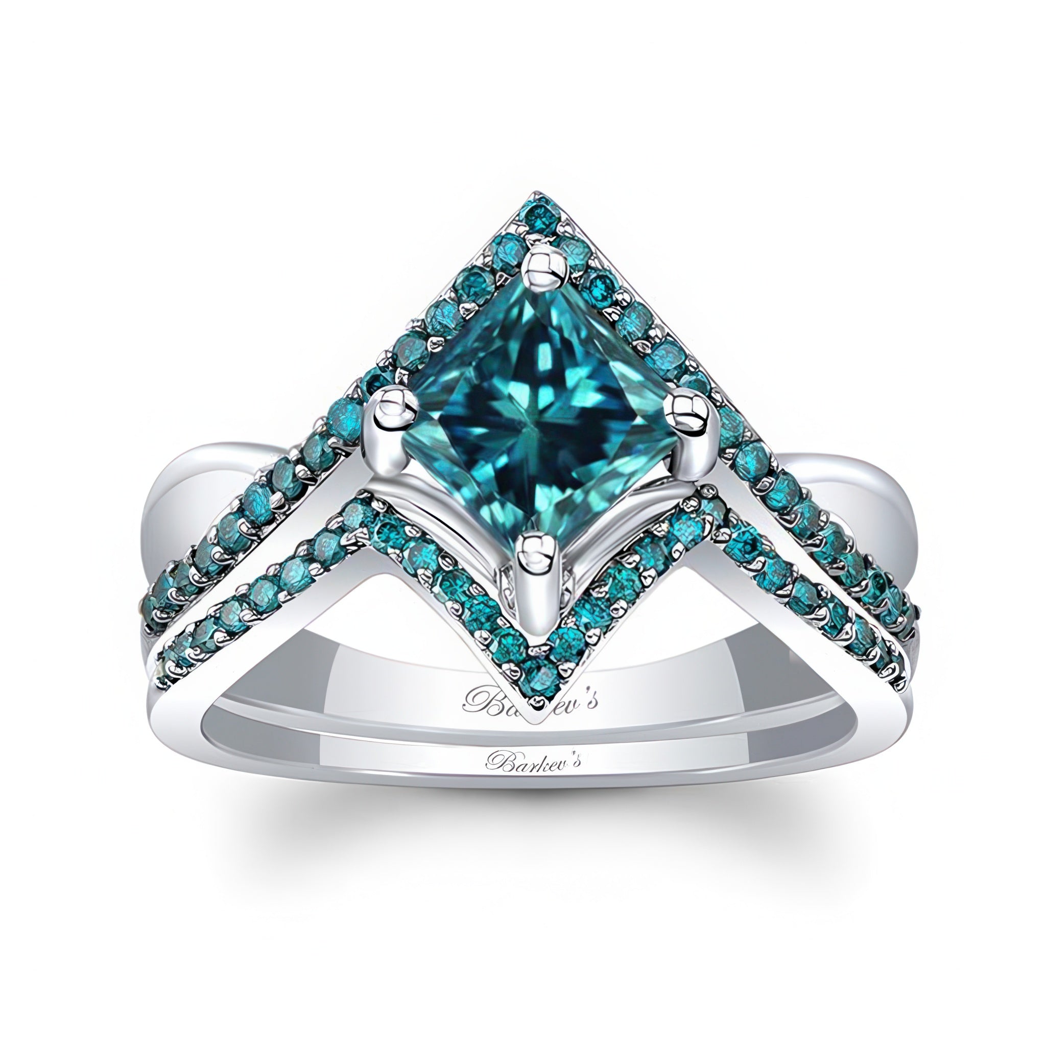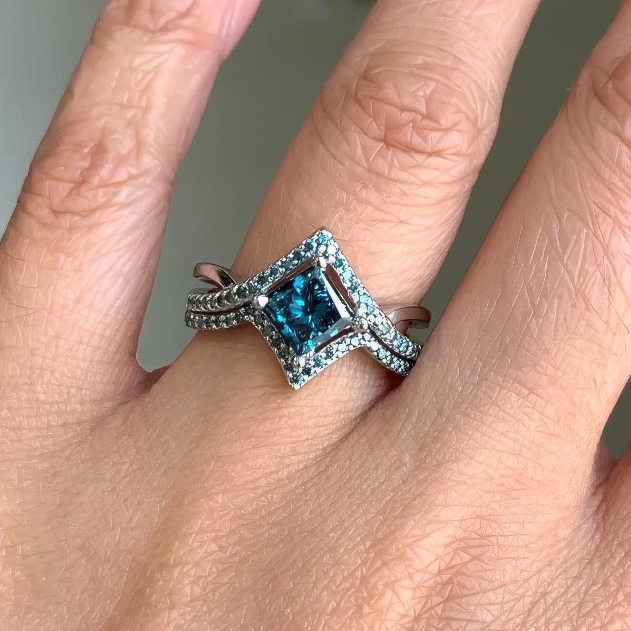A unique princess cut blue diamond engagement ring set featuring a square shaped center, sitting on a curving shank with a row of blue diamonds for added sparkle. Comes with a weddig band.