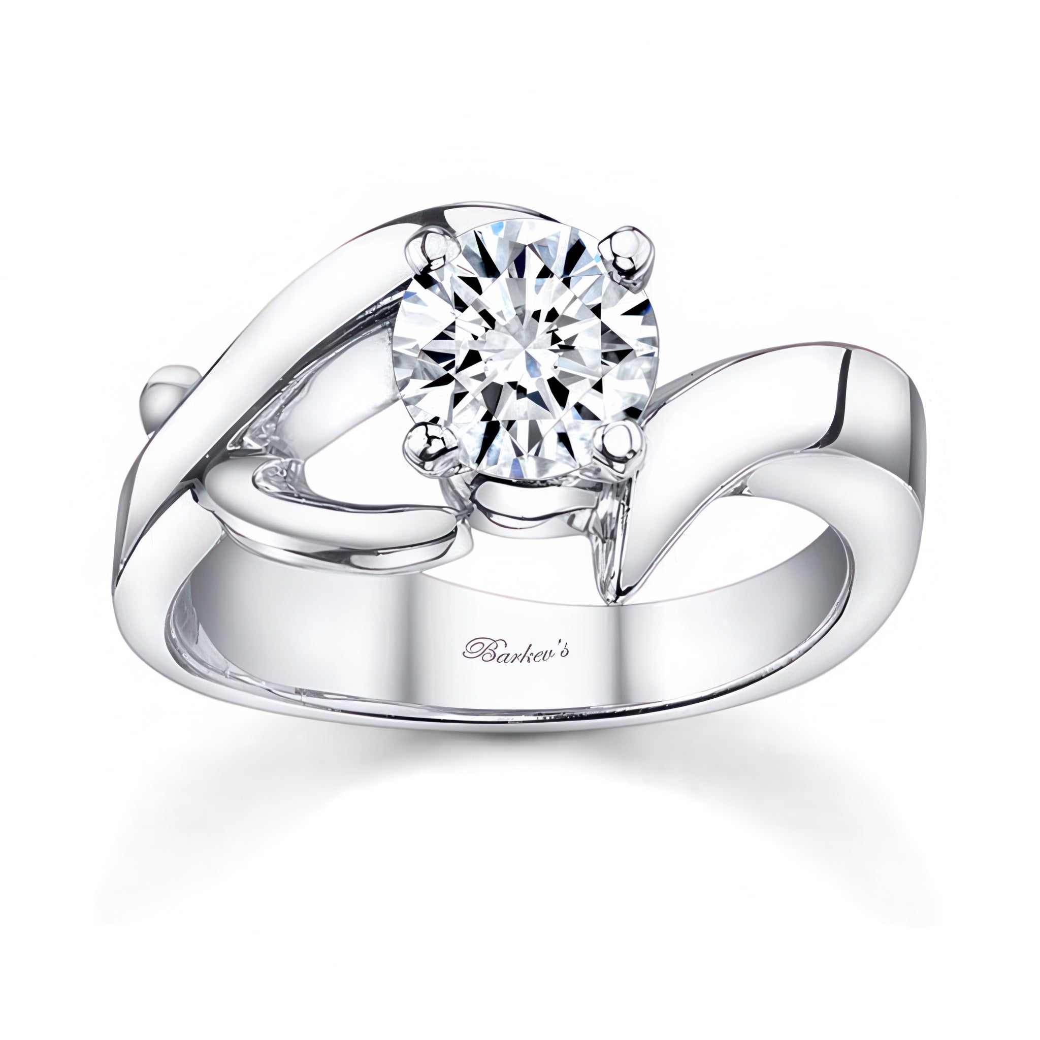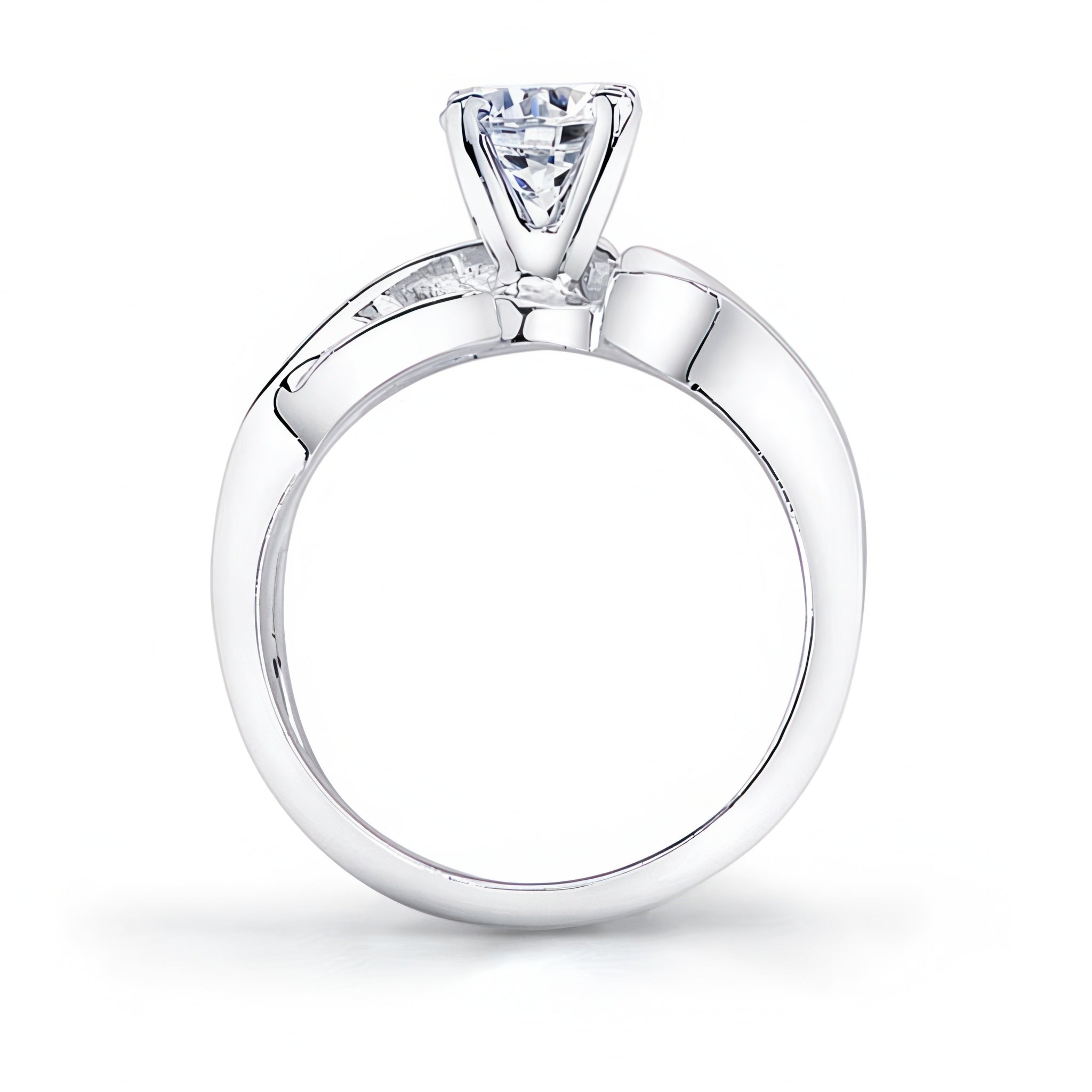 This unusual lab diamond solitaire ring features a prong set round center with an accent wire trim passing through the shank on one side for a unique look.