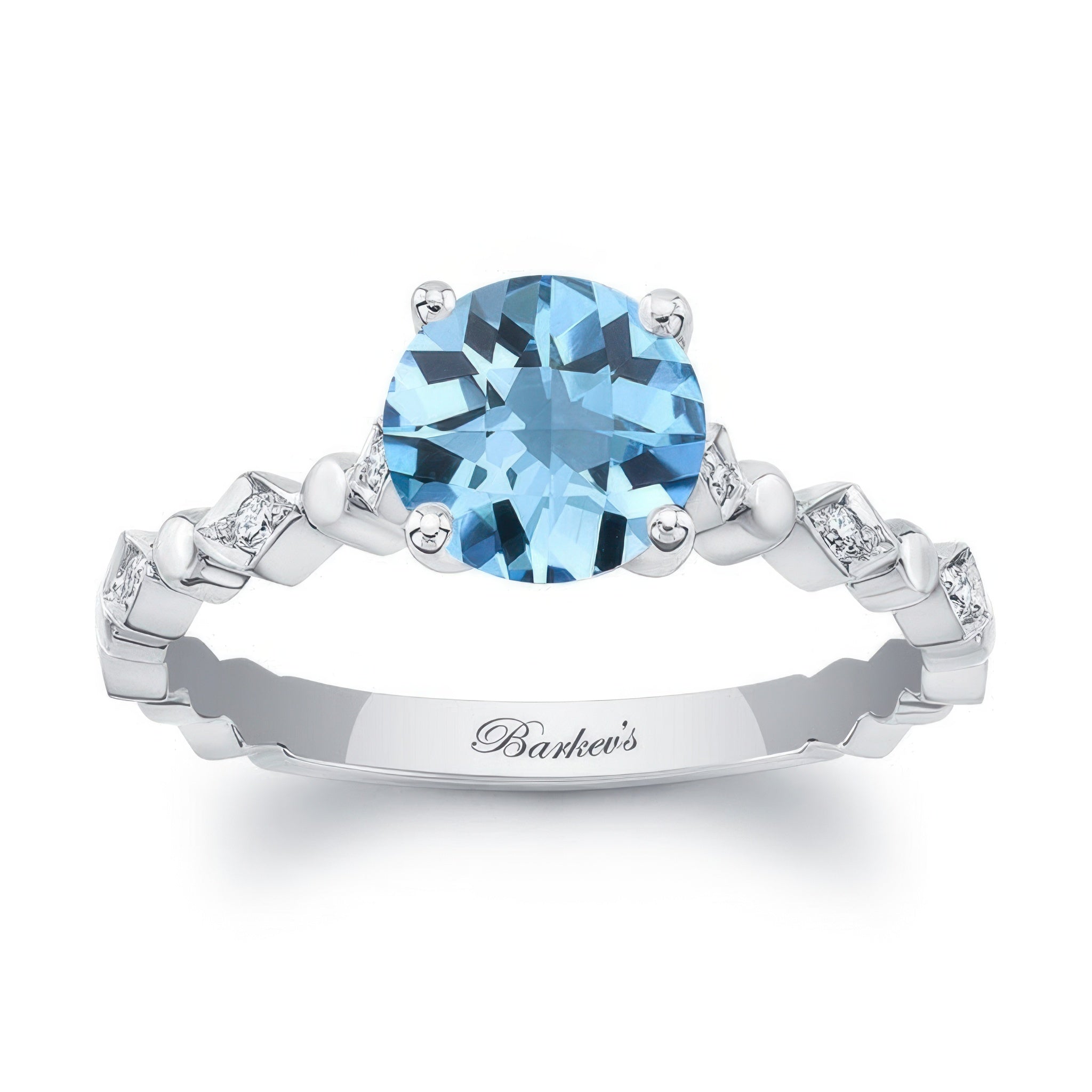 This art deco aquamarine and diamond engagement ring combines a vintage and modern dainty design. The center sits beautifully on the playful diamond pave setting adorning the band.