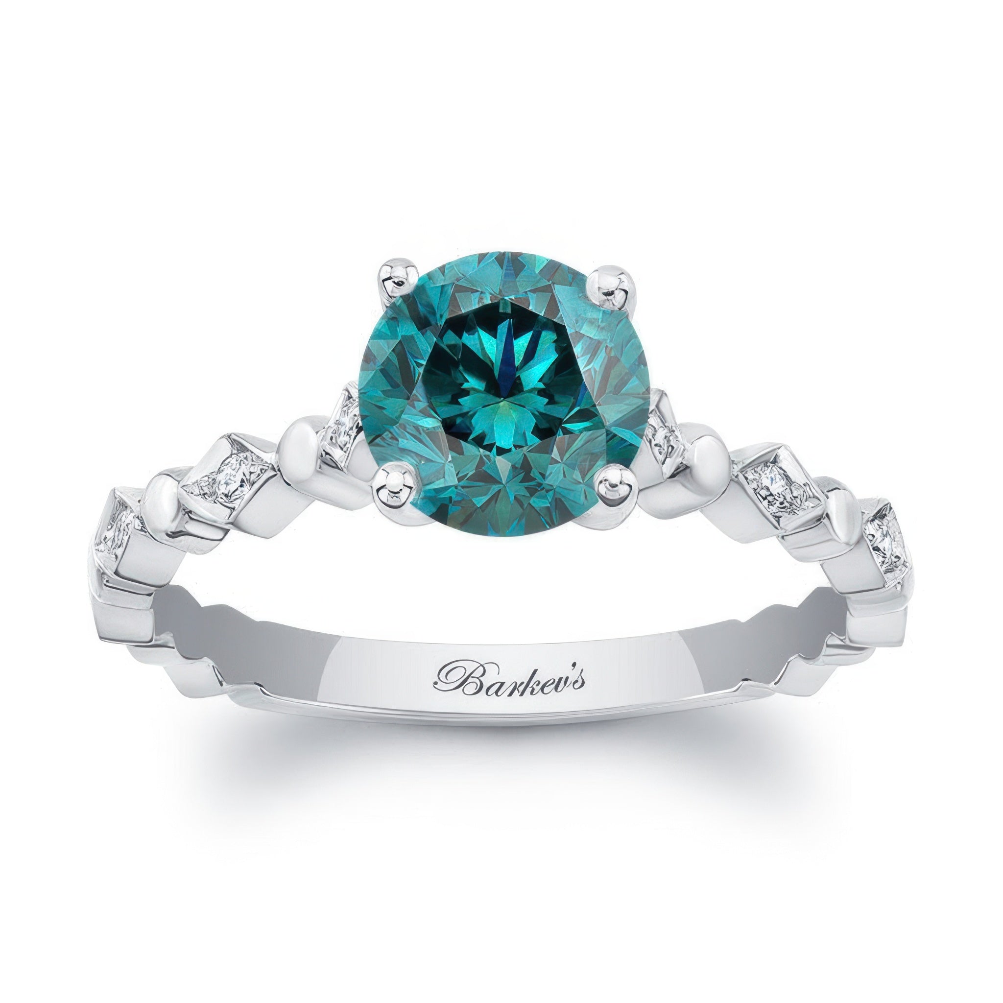 This art deco blue and white diamond engagement ring combines a vintage and modern dainty design. The center sits beautifully on the playful diamond pave setting adorning the band.