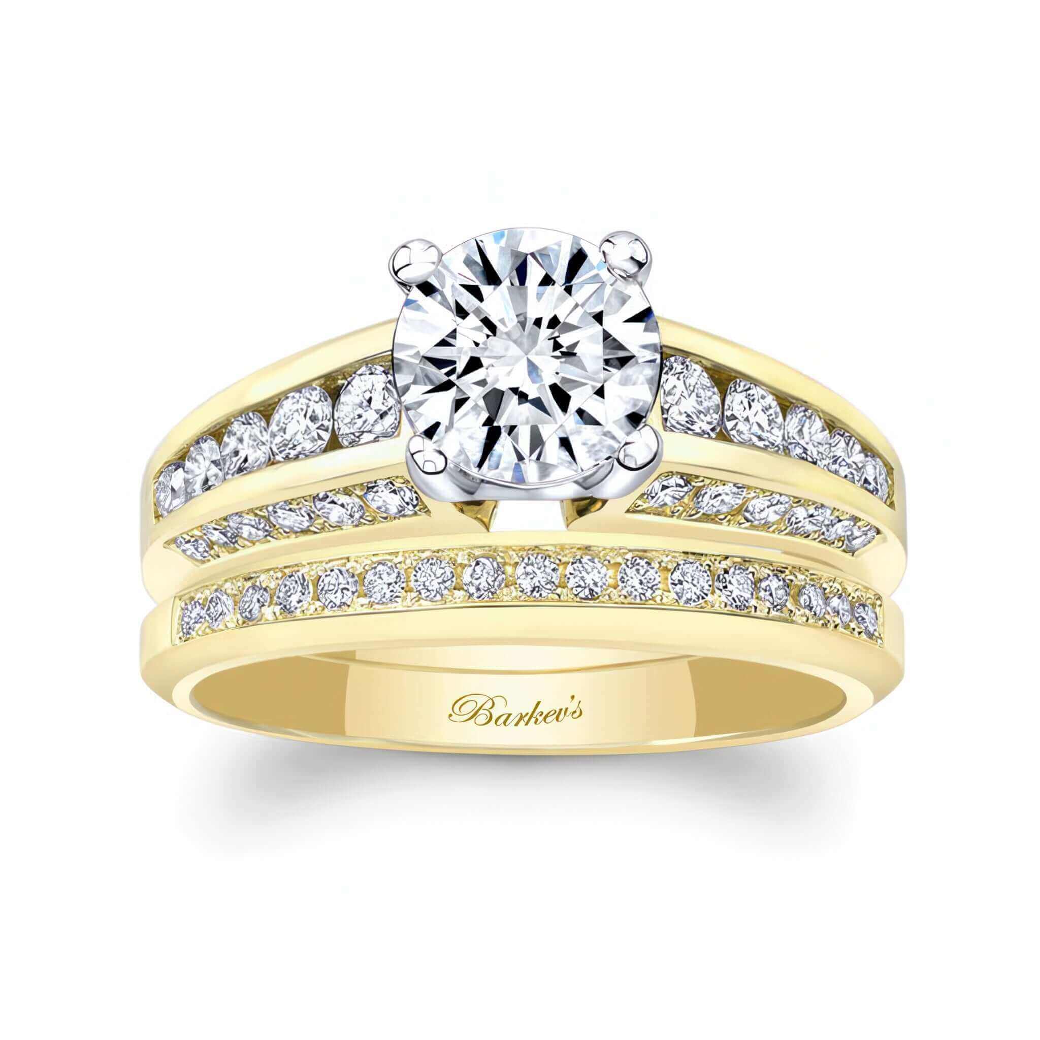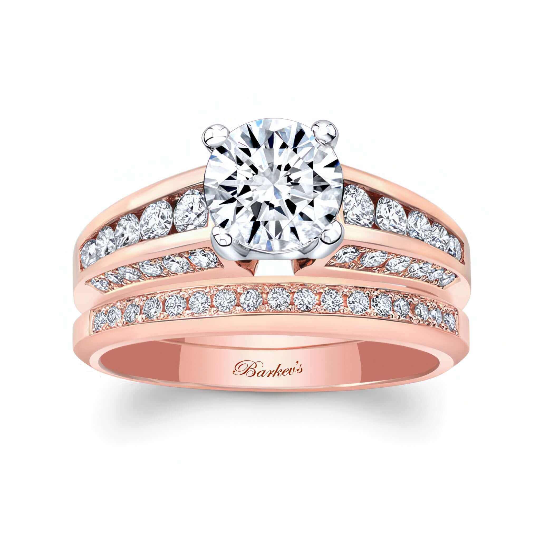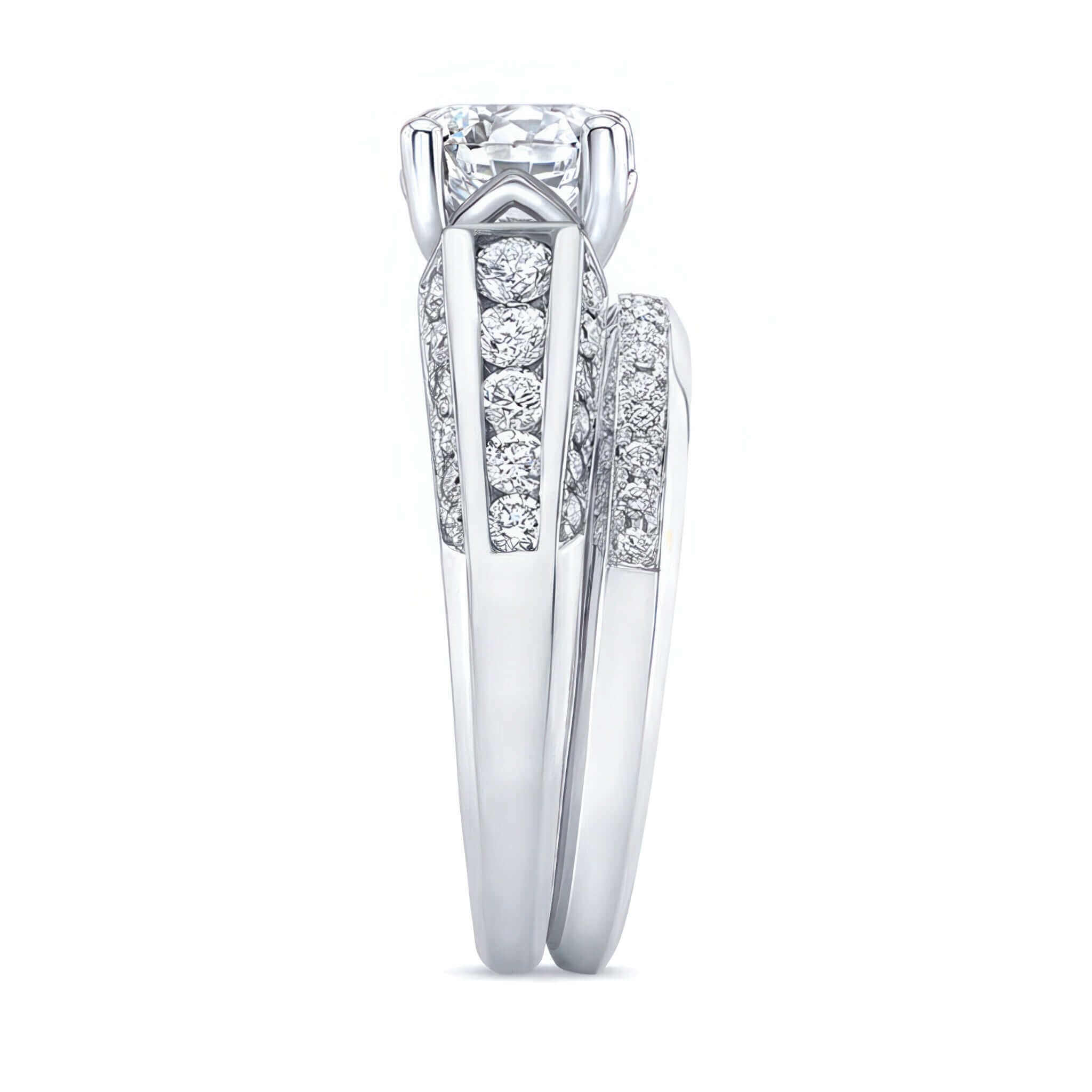 This magnificent channel set wedding ring set boasts with sparkle from every angle featuring beveled edges and a round center that is met by a row of channel and pave diamonds adorning not only the top, but also each side of the shank. Adding to this brilliance, the diamond wedding band fits snuggly close to the engagement ring for an unparalleled look.