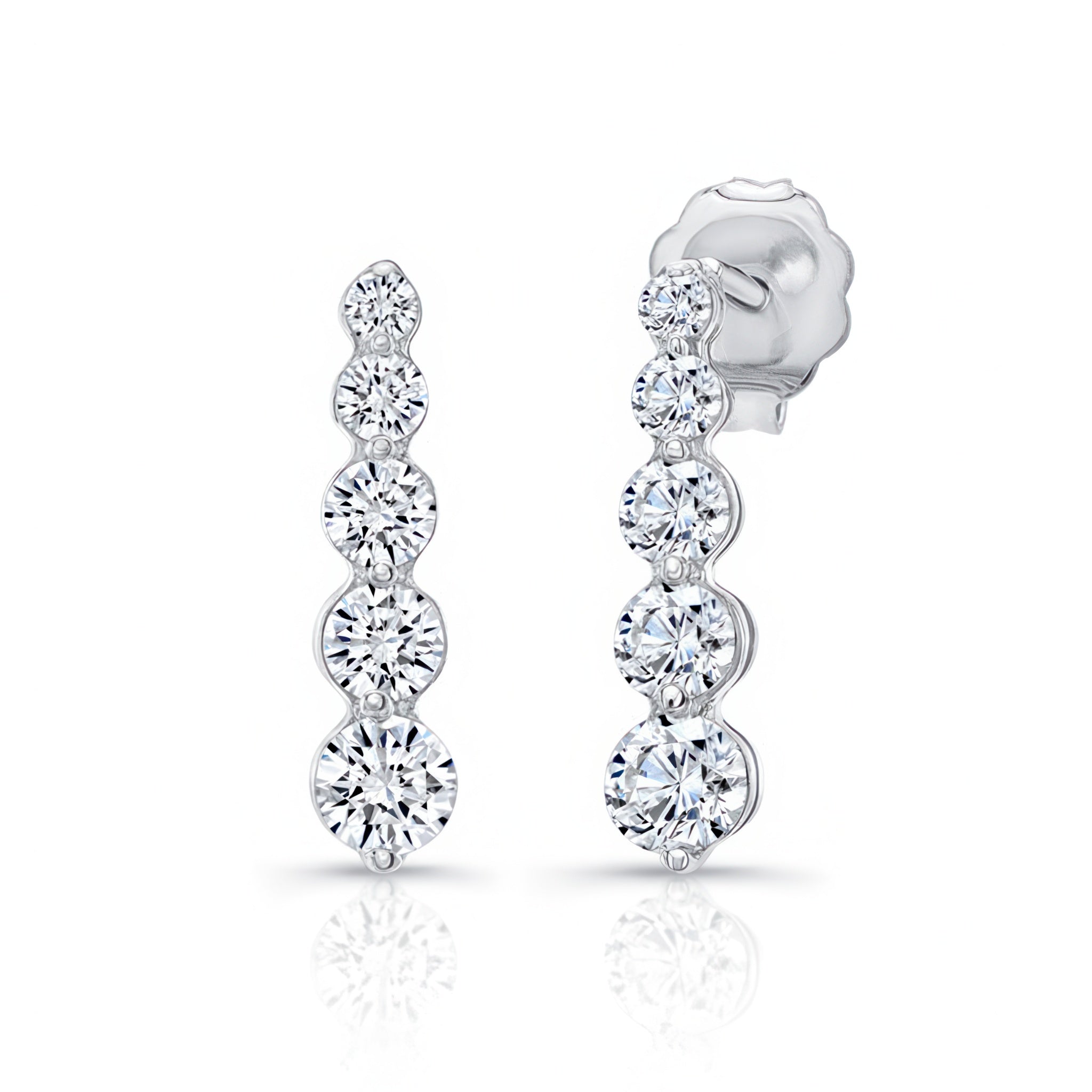 These petite 0.8 carat linear diamond earrings feature sparkling round shared prong set diamonds gradually increase in size for a brilliant look.