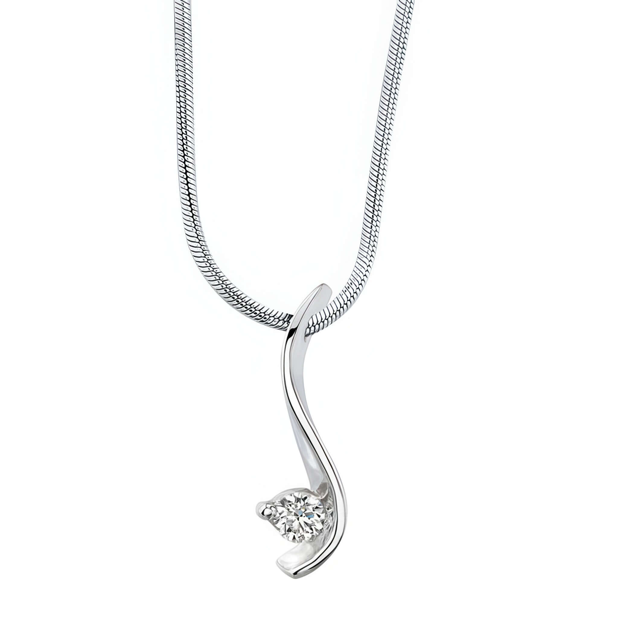 Unique diamond necklace featuring a meandering bar with a single diamond channel set with a balancing prong at the tip. A chain slides freely though the necklace at the top.