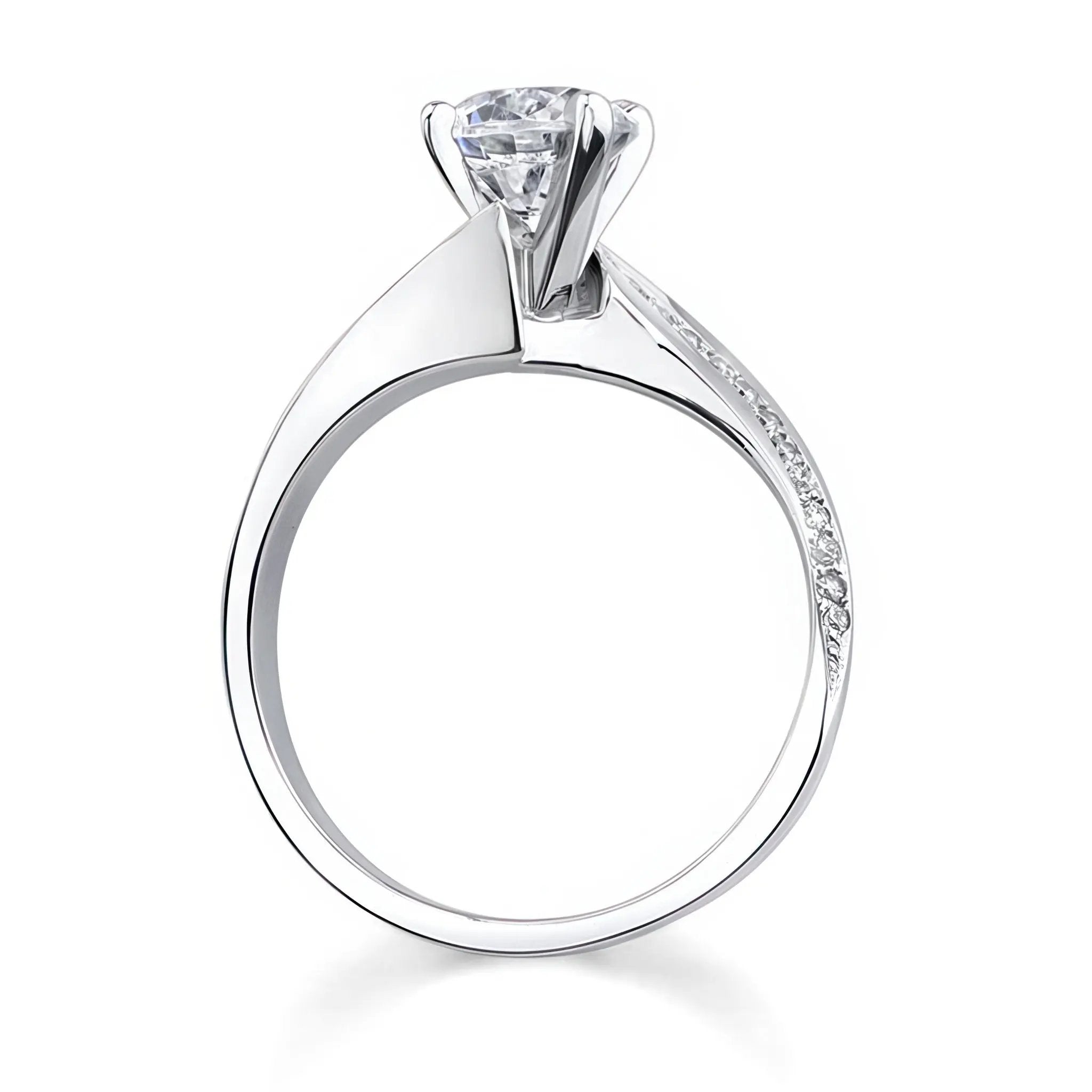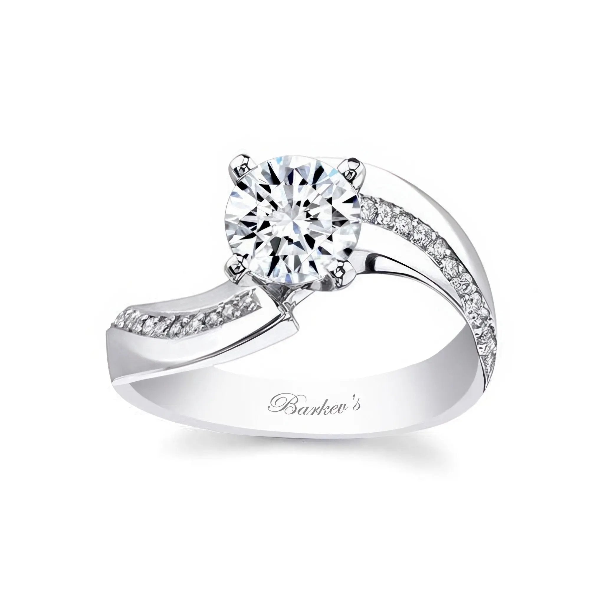 This curved shank moissanite engagement ring exudes confidence with a prong set center that nestles into a curving shank while pave set diamonds meander down the shoulders for a sparkling finish.